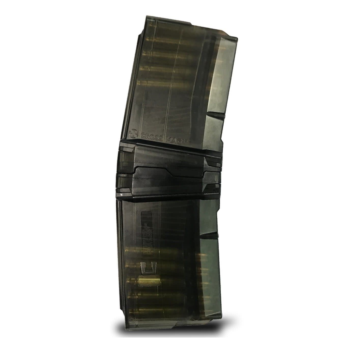 Featuring a unique coupling mechanism integral to the floor plate, couple two magazines end-to-end in 4 unique configurations in seconds, allowing faster reloads so you can RETURN MORE FIREDesigned and manufactured in house at our state of the art factory in Canada, we know what it takes to withstand frigid temperatures, rough handling and competition use. The transparent bodies allow quick visual indication of how many rounds you have left, or the type of rounds, which is particularly useful for running 300 blackout. The integral coupling floor plate allows you to couple the magazines end-to-end in either a curved or straight configuration, from there you decide if you want your cartridges facing forward forward, or forward reverse. If you ever change your mind about a configuration, change it in seconds, without extra parts or special tools. Or heck, uncouple the mags and take advantage of lowprofile mags to shoot prone, on a bench or hunt in the woods.Be innovative – shoot CROSS MAGSFeatures: Integral floor plates4 different configurationsTwo 10 round compliant magazinesTranslucent polymerNo tools requiredMags can be used when separatedCompatible with 300 blackout cartridges