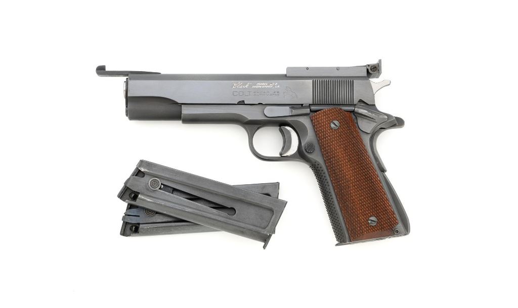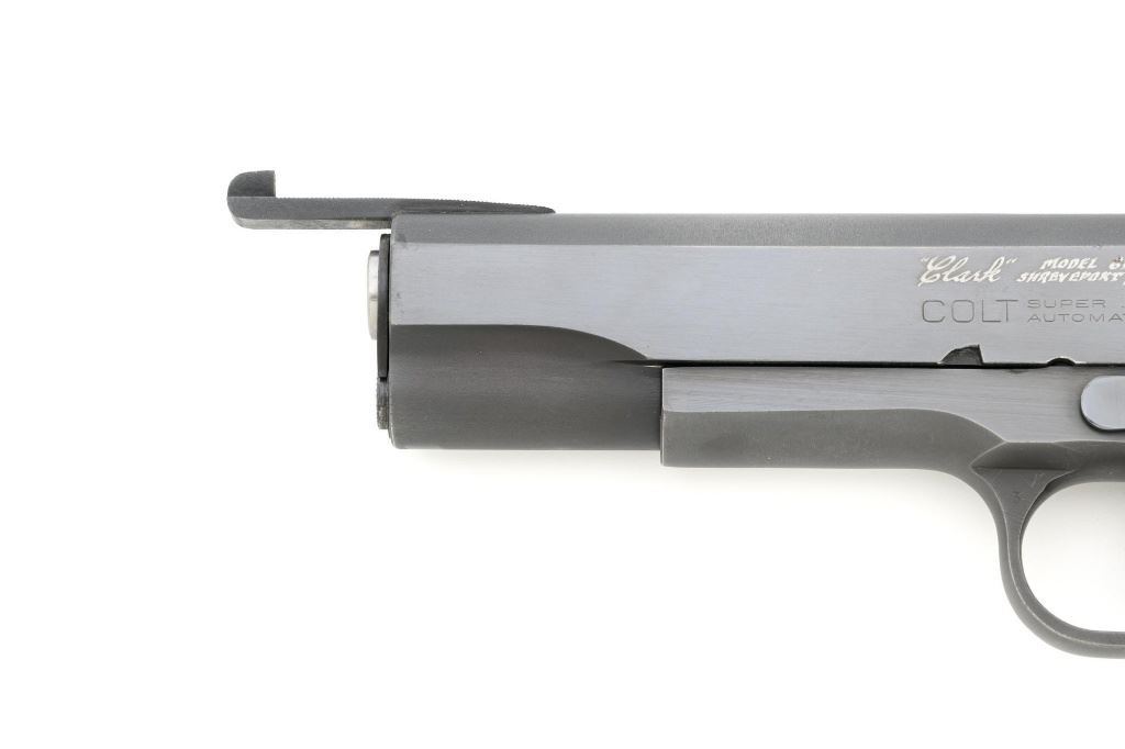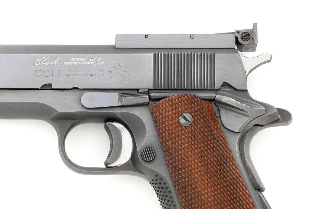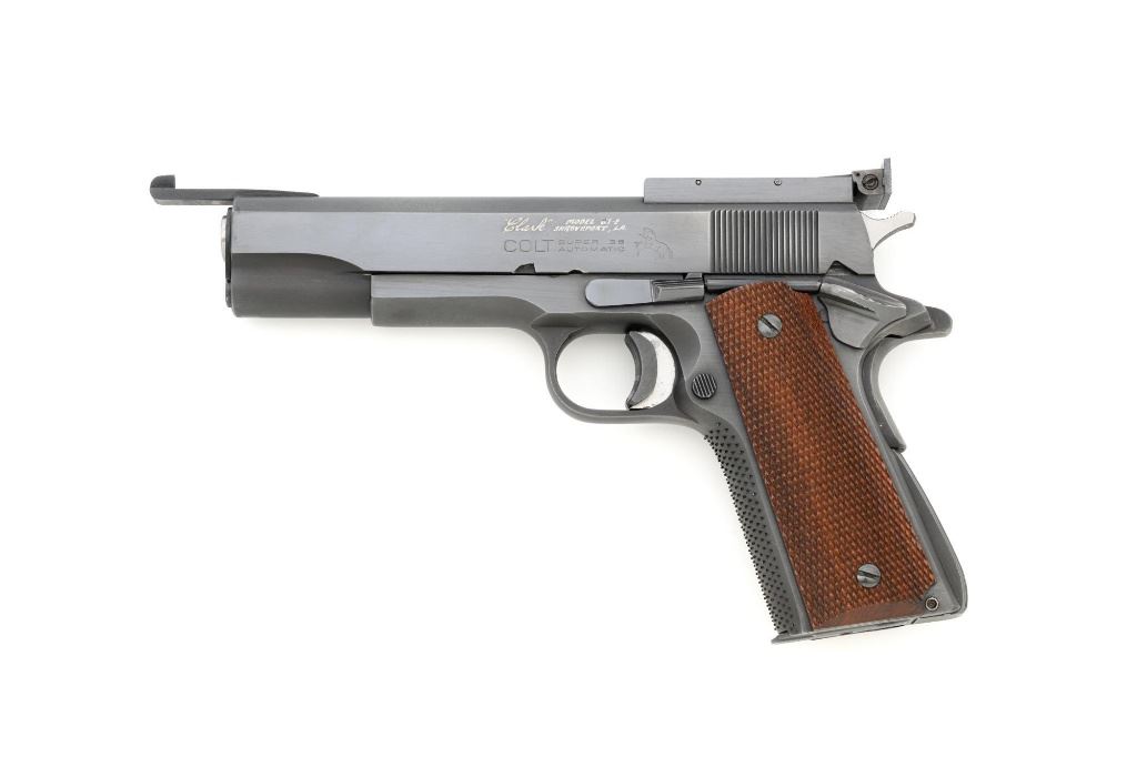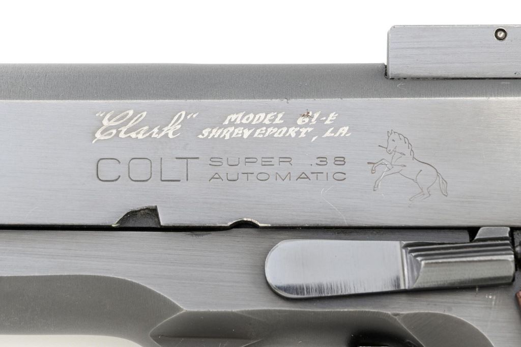 Custom Clark Model G1-E Colt Super .38 Semi-Automatic Pistol, #199475, .38 Super cal., 5" barrel is marked "Colt Super .38 Auto", blue finish, checkered walnut two-piece grips, extended blade front sight, Bo-Mar adjustable square-notch rear sight, tuned trigger with added shoe, with three (3) blued steel magazines marked "COLT / .38 SPEC.". Factory markings are clear, with "CLARK MODEL G1-E / SHREVEPORT, LA" in script on the slide. Mfgd 1968. Pistol is in near excellent overall condition as customized by Clark, retaining approx. 97%-98% blue, with intermittent light scratches and handling marks. Front grip strap features Clark "tiger tooth" stippling. Grips are in near excellent condition with sharp checkering detail. Action functions smoothly. Bore is near excellent with well-defined rifling. Est.: $1,500-$2,500. (C&R/PPT)