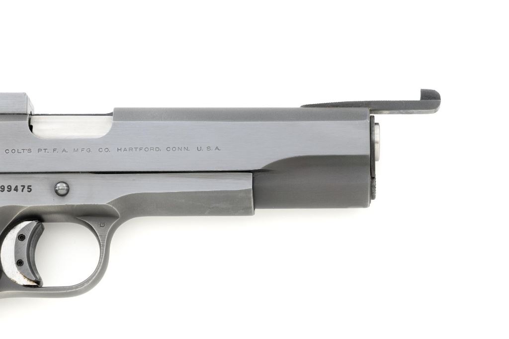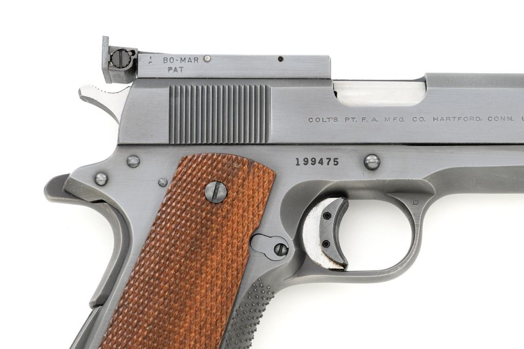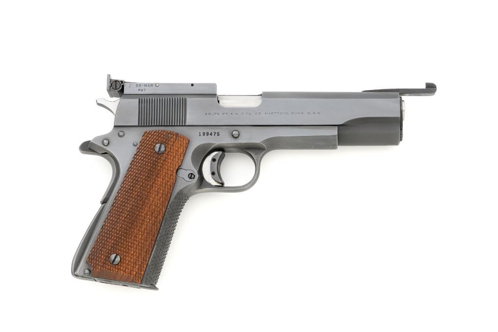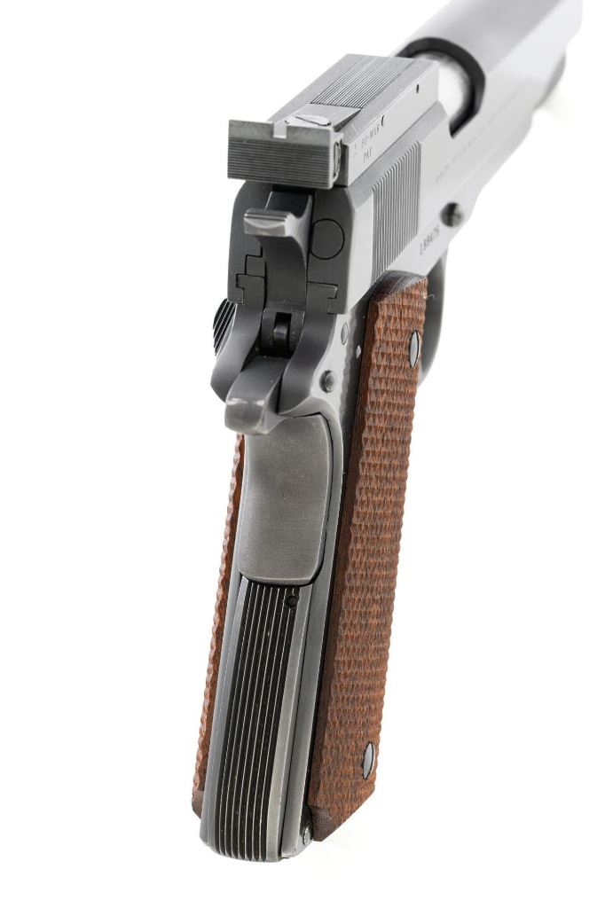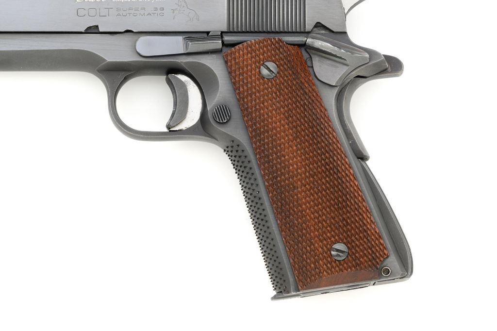 Custom Clark Model G1-E Colt Super .38 Semi-Automatic Pistol, #199475, .38 Super cal., 5" barrel is marked "Colt Super .38 Auto", blue finish, checkered walnut two-piece grips, extended blade front sight, Bo-Mar adjustable square-notch rear sight, tuned trigger with added shoe, with three (3) blued steel magazines marked "COLT / .38 SPEC.". Factory markings are clear, with "CLARK MODEL G1-E / SHREVEPORT, LA" in script on the slide. Mfgd 1968. Pistol is in near excellent overall condition as customized by Clark, retaining approx. 97%-98% blue, with intermittent light scratches and handling marks. Front grip strap features Clark "tiger tooth" stippling. Grips are in near excellent condition with sharp checkering detail. Action functions smoothly. Bore is near excellent with well-defined rifling. Est.: $1,500-$2,500. (C&R/PPT)