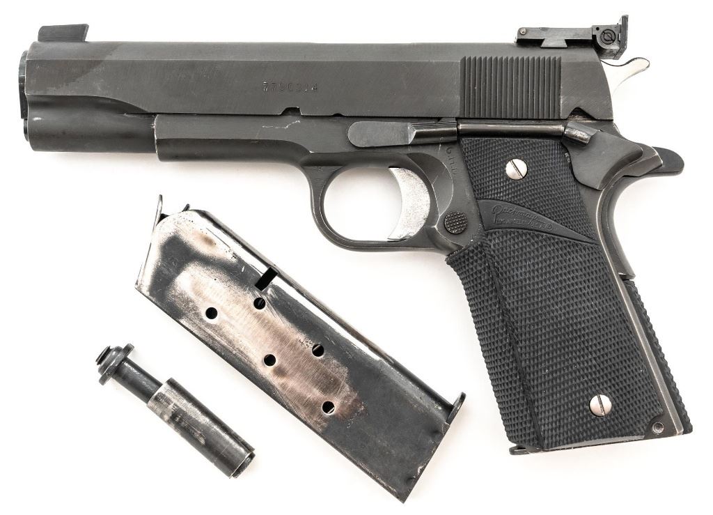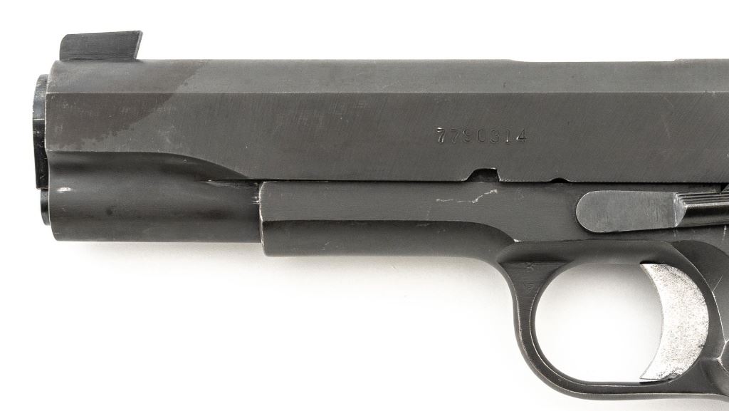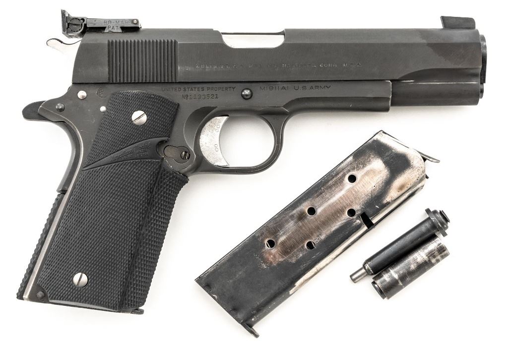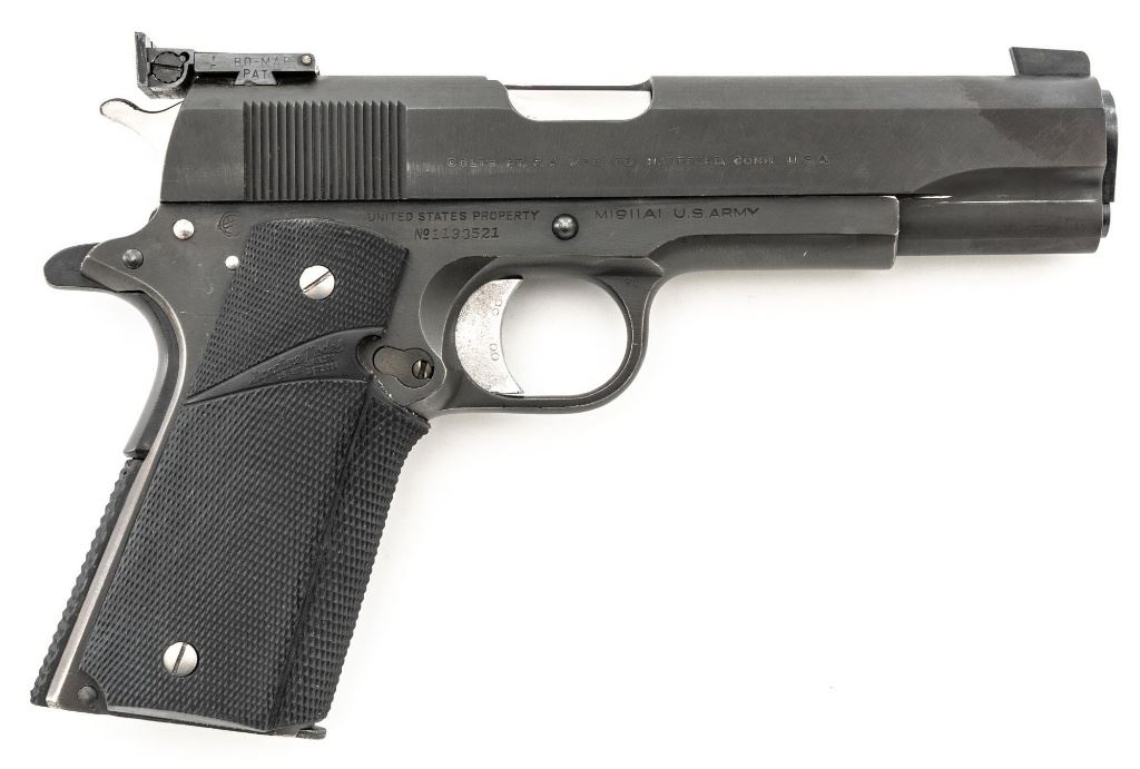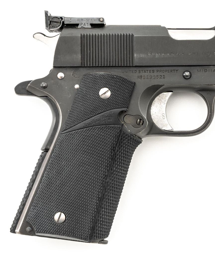 Custom Colt U.S. Property Marked 1911A1 Semi-Auto Pistol, #1193521, .45 ACP cal., 5" barrel, parkerized finish, checkered black rubber Pachmayr wraparound grips, checkered black rubber mainspring housing, high profile blade front, and Bo-Mar adjustable rear sight, barrel bushing marked "Micro" in script. Slide is a post-war Colt replacement with one-line Colt address on the right side, numbered "7790314"on the left side. Right rear of the frame with a partially visible "(crossed cannons)" ordnance symbol, with partial "G.H.D." inspection mark on the left side. Pistol also features a replacement heavy recoil spring and two (2) 7-round magazines, with the serial number etched into the bases, also marked #1 and #2. Included is the original barrel bushing and spring cap. Frame was mfgd 1943. Pistol is in near excellent overall condition, retaining approx. 95% metal finish, showing intermittent light marks and a few scratches from handling and use. There is some mild corrosion on the sides of the trigger. Grips show normal light handling wear. Action is slightly stuff but functions well. Bore is bright, displaying a little mild etching, with very good rifling. Est.: $1,000-$1,500. (C&R/PPT)