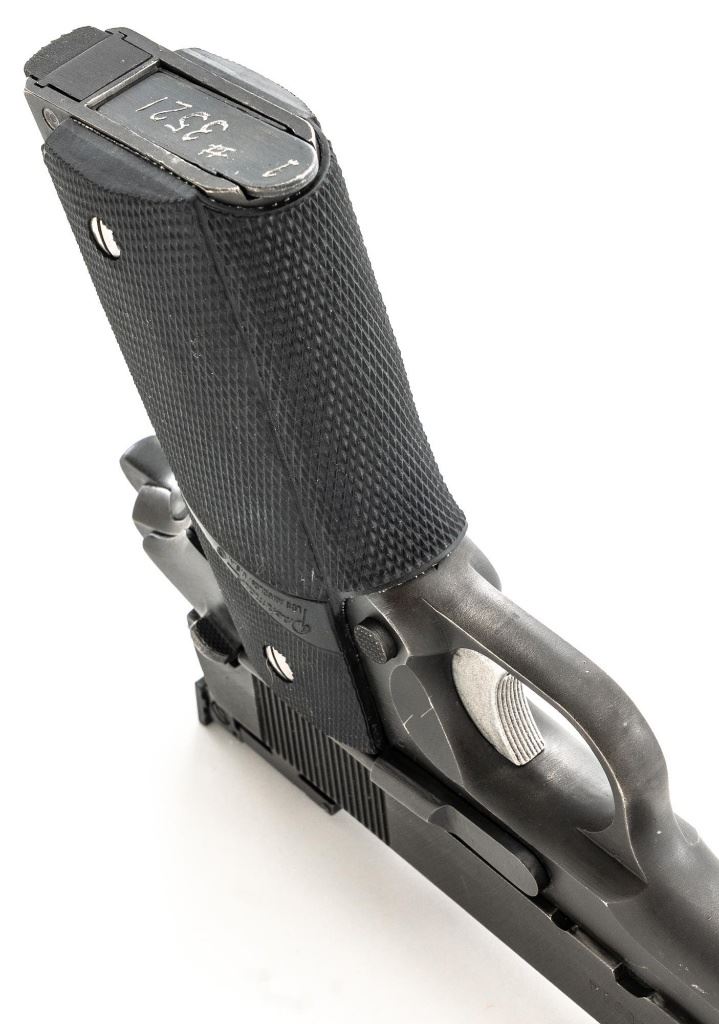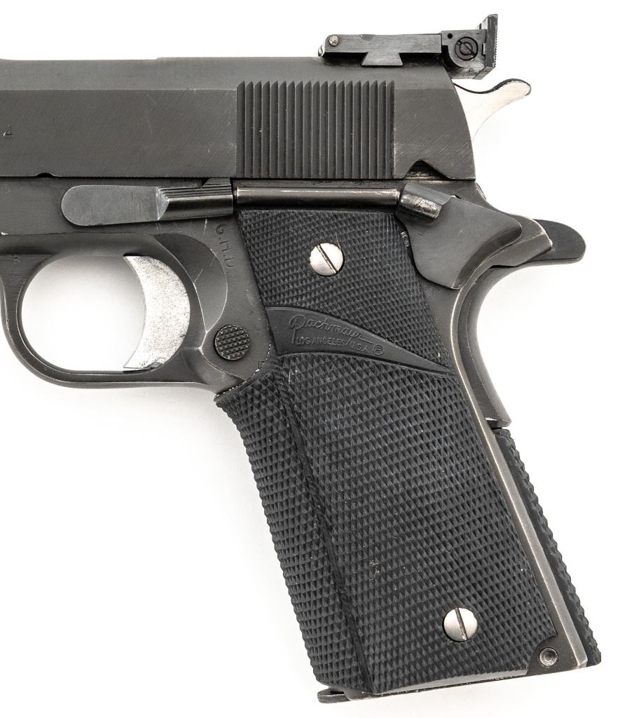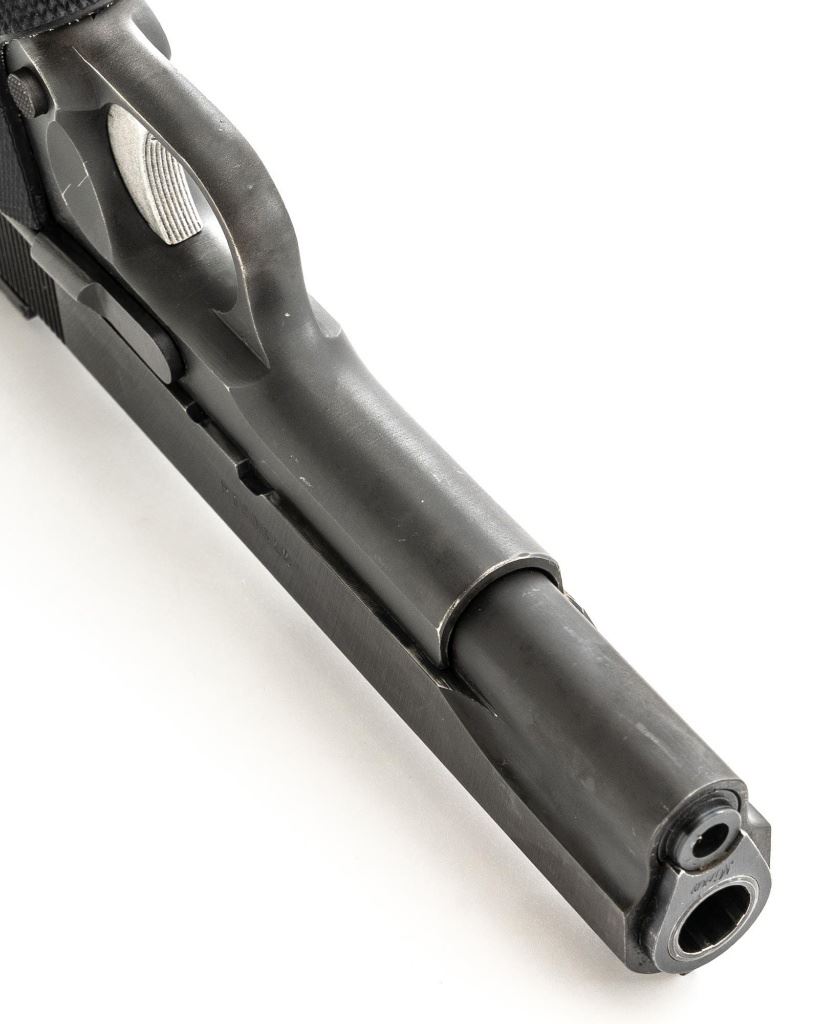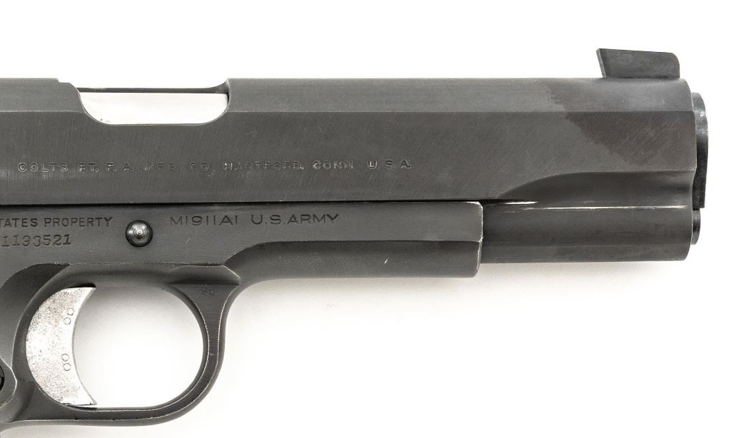 Custom Colt U.S. Property Marked 1911A1 Semi-Auto Pistol, #1193521, .45 ACP cal., 5" barrel, parkerized finish, checkered black rubber Pachmayr wraparound grips, checkered black rubber mainspring housing, high profile blade front, and Bo-Mar adjustable rear sight, barrel bushing marked "Micro" in script. Slide is a post-war Colt replacement with one-line Colt address on the right side, numbered "7790314"on the left side. Right rear of the frame with a partially visible "(crossed cannons)" ordnance symbol, with partial "G.H.D." inspection mark on the left side. Pistol also features a replacement heavy recoil spring and two (2) 7-round magazines, with the serial number etched into the bases, also marked #1 and #2. Included is the original barrel bushing and spring cap. Frame was mfgd 1943. Pistol is in near excellent overall condition, retaining approx. 95% metal finish, showing intermittent light marks and a few scratches from handling and use. There is some mild corrosion on the sides of the trigger. Grips show normal light handling wear. Action is slightly stuff but functions well. Bore is bright, displaying a little mild etching, with very good rifling. Est.: $1,000-$1,500. (C&R/PPT)