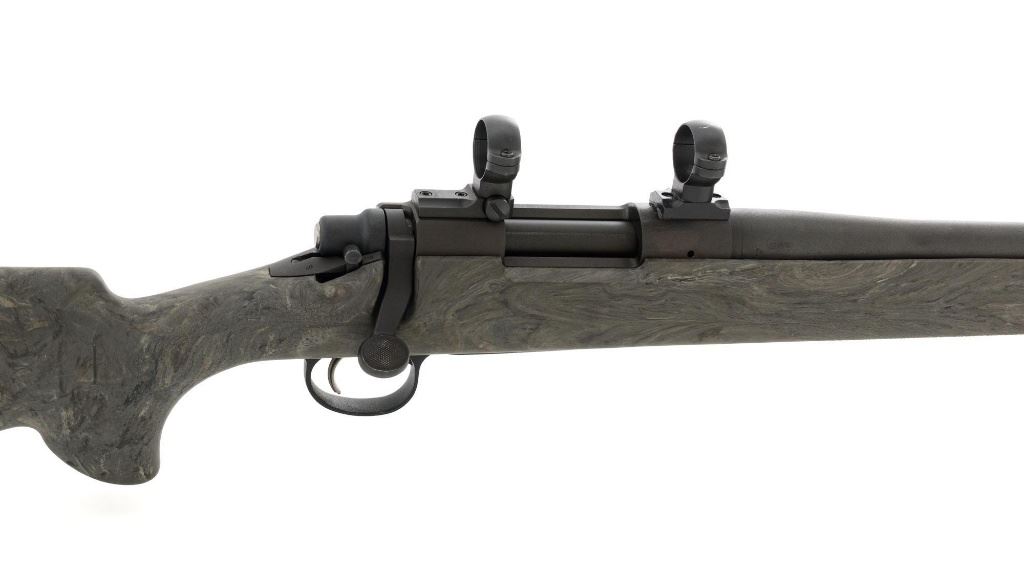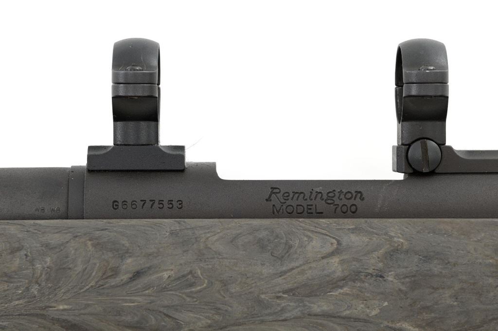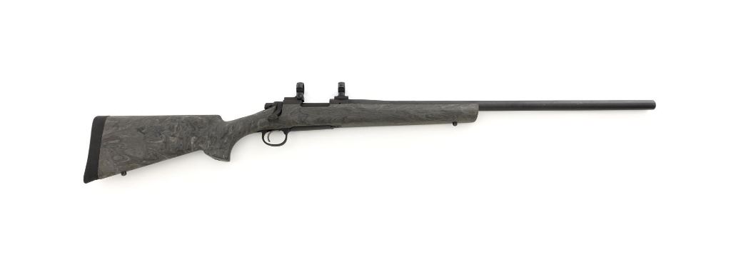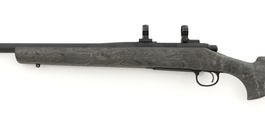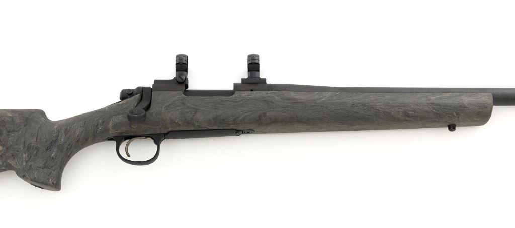 Custom Remington Model 700 Varmint Bolt Action Rifle, #G6677553, .17 Rem. Fireball cal., 26" medium-heavy barrel, matte black finish, Hogue Overmoulded textured rubber one-piece pistol grip stock, finished in camouflage pattern, no provision for sights, receiver is topped with two-piece Leupold bases and rings. Mfgd 2007. Rifle is in excellent overall condition, retaining approx. 98%-99% factory finish, with some light scratches on the barrel. Receiver and trigger guard display only minor marks, showing little use. Stock is excellent. Action is extremely smooth with a crisp trigger. Bore is mirror bright with excellent rifling. Est.: $1,000-$1,500. (Modern)