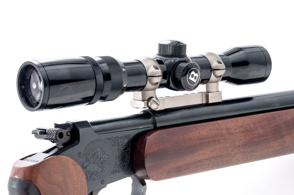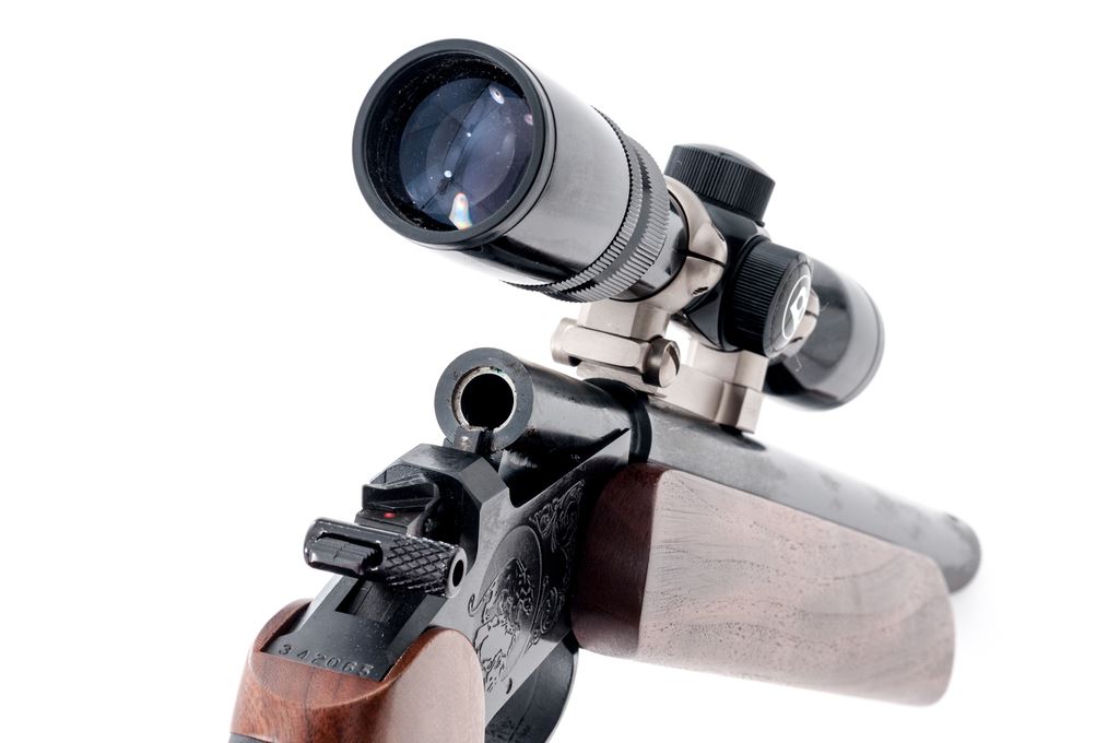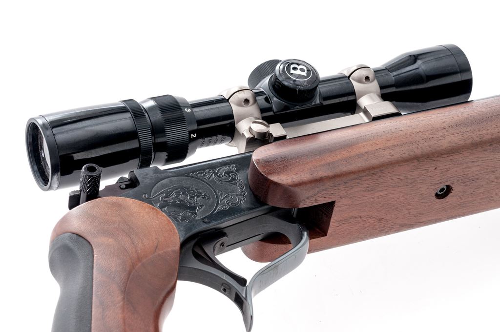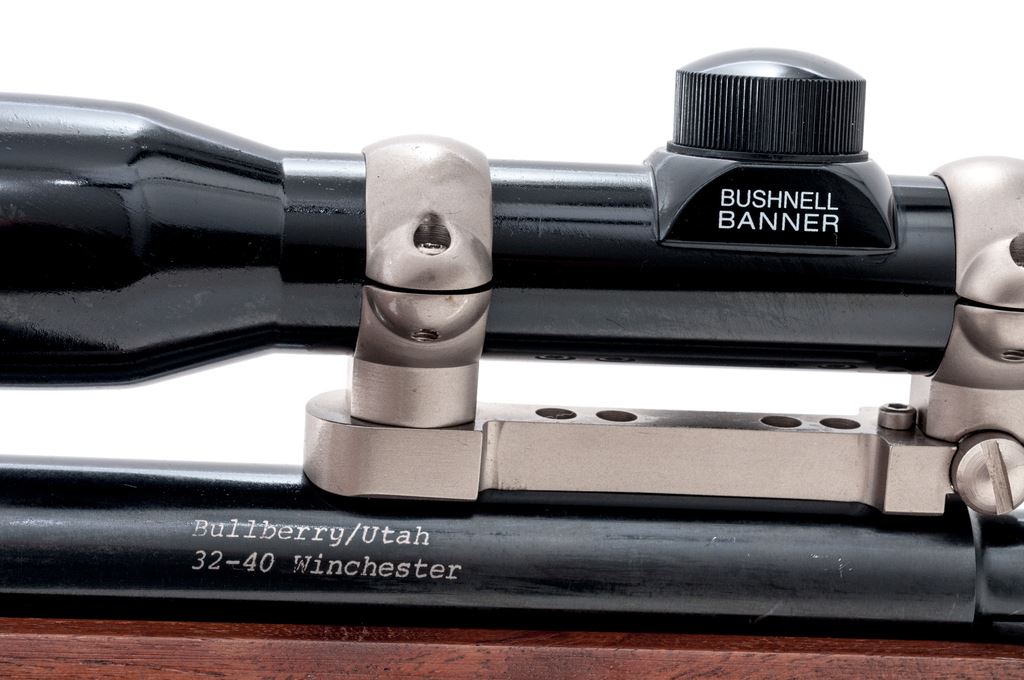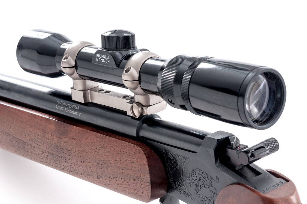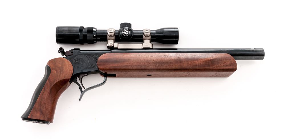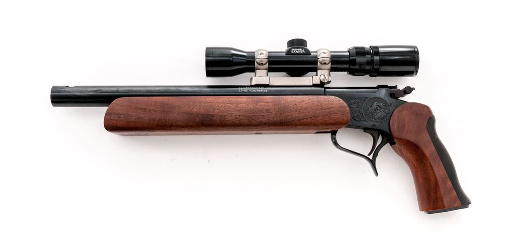 Custom Thompson Contender Single Shot Pistol, #342065, .32-40 cal., 15'' Bulberry heavy barrel, large walnut forend, walnut grip, backstrap with black rubber insert, hammer extension, no sights. Barrel is topped with a matte stainless Burris mount and a Bushnell Banner 3x8-28mm scope. Scope has a gloss black finish and duplex reticle. Condition is excellent retaining approx. 98%+ factory original blue. Barrel with a few small scuffs and scratches, predominantly to the left side below scope mount. Walnut grips with only a few very minor handling marks; forend with scattered shallow indentations. Smooth action, bright bore with sharp rifling. Scope is excellent with a few small marks to the exterior; optics are bright and clear. Est.: $500-$750. (Modern/PPT)