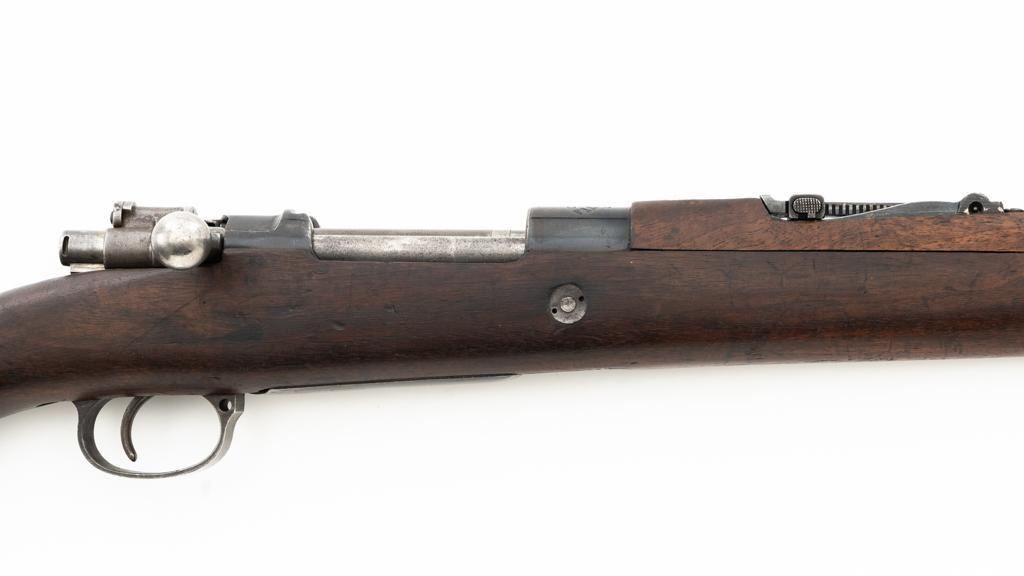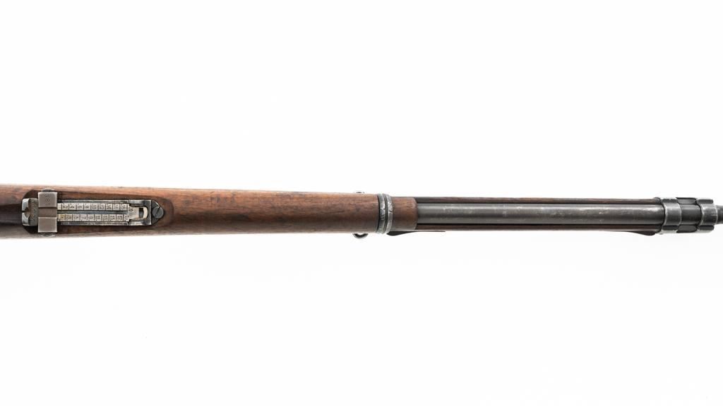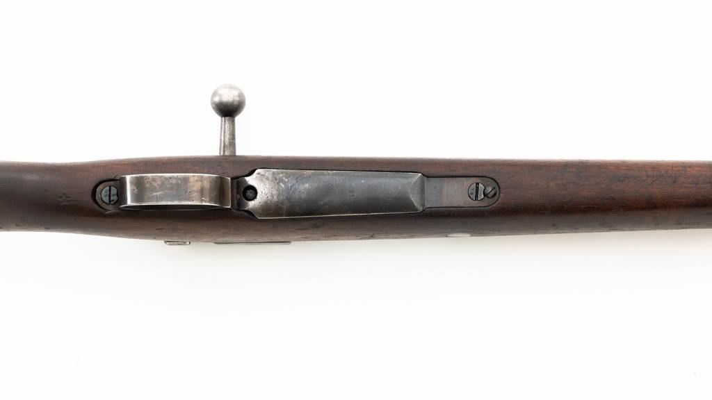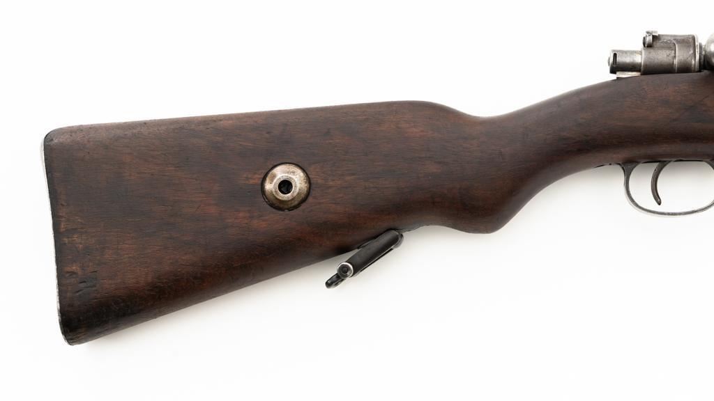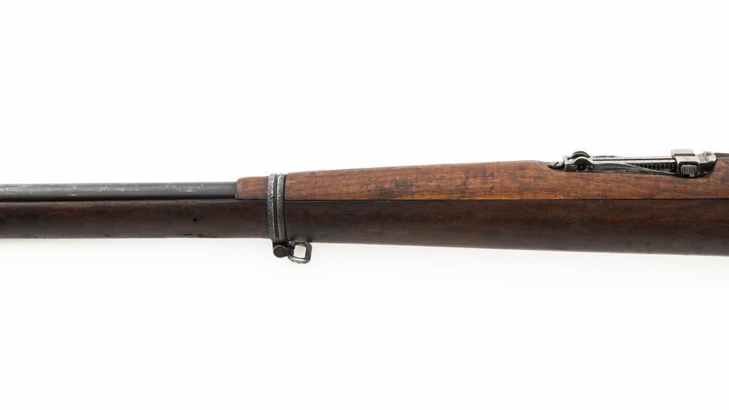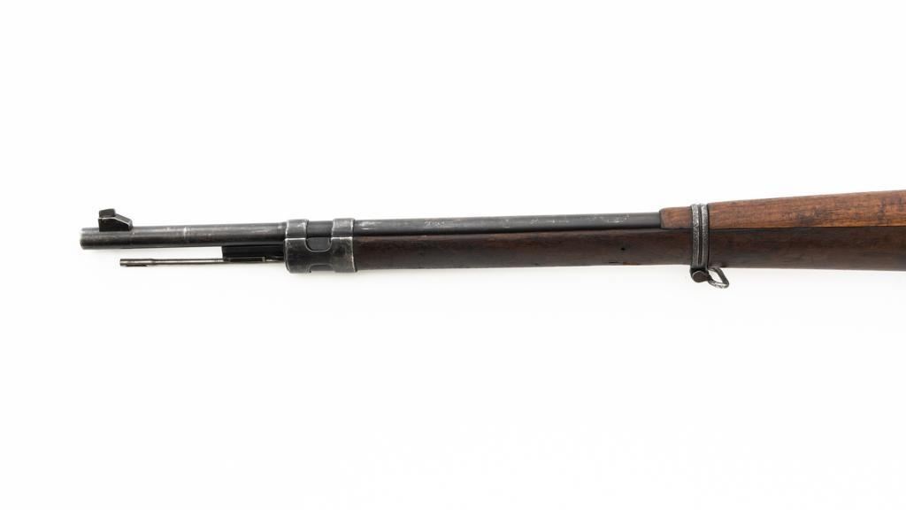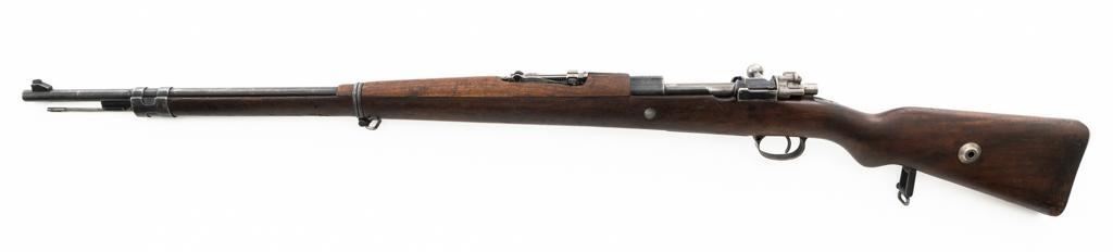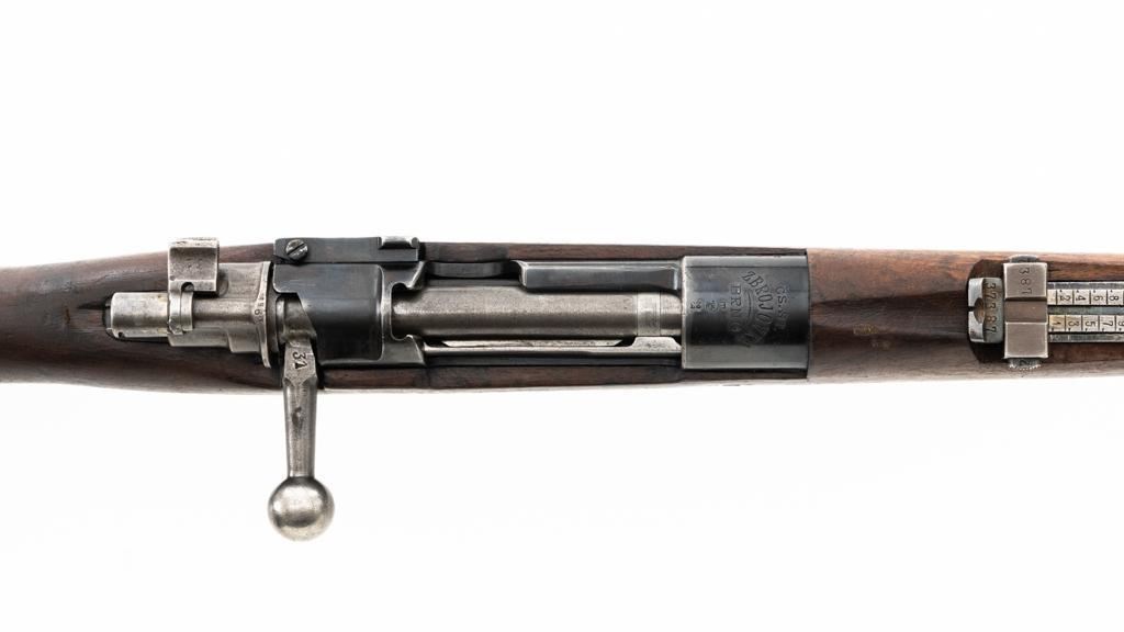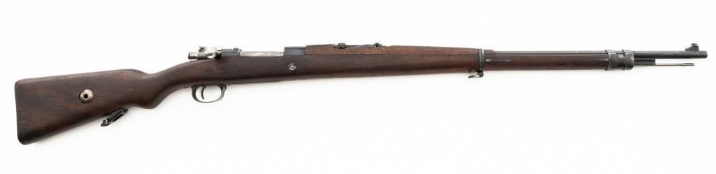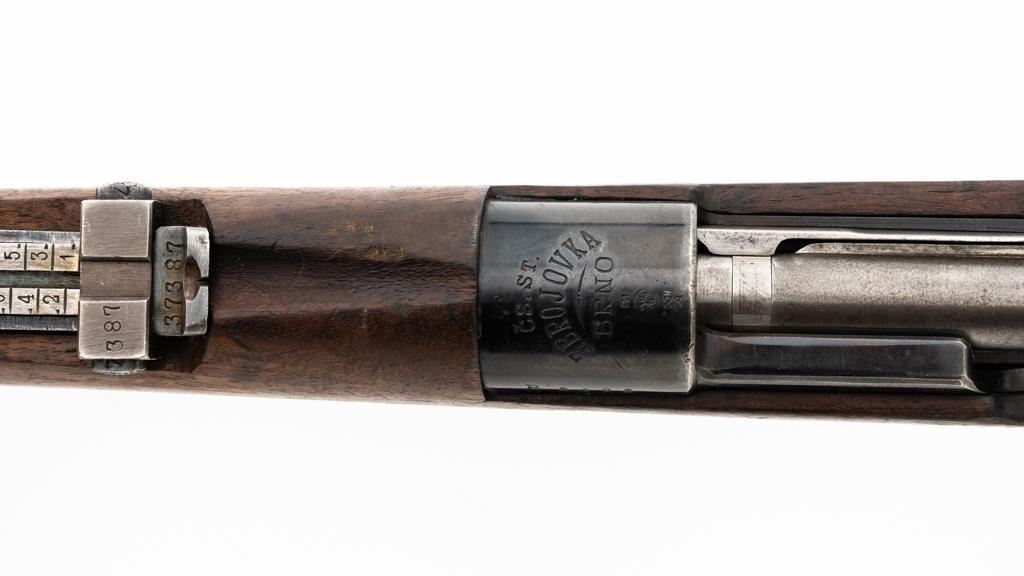Czech Model 98/22 Mauser Bolt Action Rifle, #B2472, 8x57mm cal., 29.25" barrel, blued finish, hardwood stock and handguard, dovetailed inverted-"V" front sight, and adjustable tangent rear sight with "V"-notched groove, graduated to 2000 meters. Includes cleaning rod and detachable sling. Sling is in good used condition. Top of receiver ring is marked "CS.ST./ZBROJOVKA/BRNO". Rifle was accepted into Czech service and is stamped "E(Rampart Lion)23" below the receiver marking. There is a five pointed star stamped into the underside of the stock wrist. Numbers do not match. Import marked on right side of the barrel. Condition overall is very good, retaining approx. 70% blue, showing thinning and toning, primarily to the barrel and trigger guard. There is light pitting on left side of the rear barrel band. Wood with scattered dents and scratches, particularly on the underside of the forend and at the toe. Action operates smoothly. Bore is very good with clearly defined rifling. Est.: $400-$600. (C&R)
