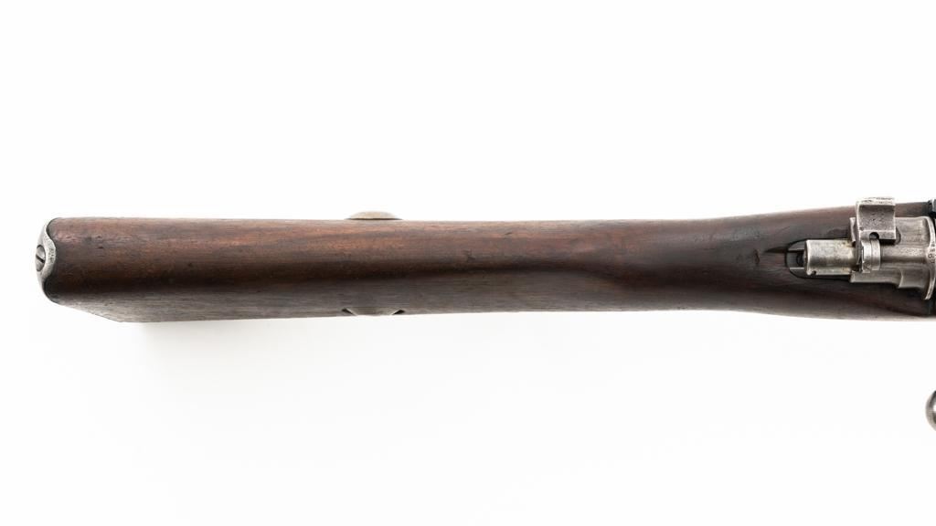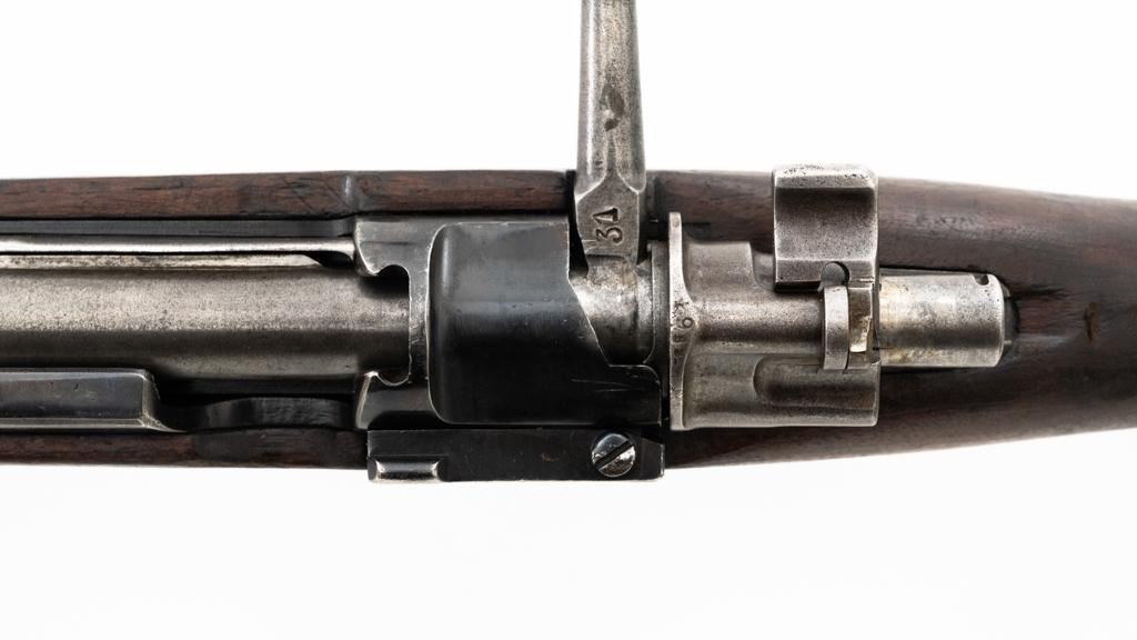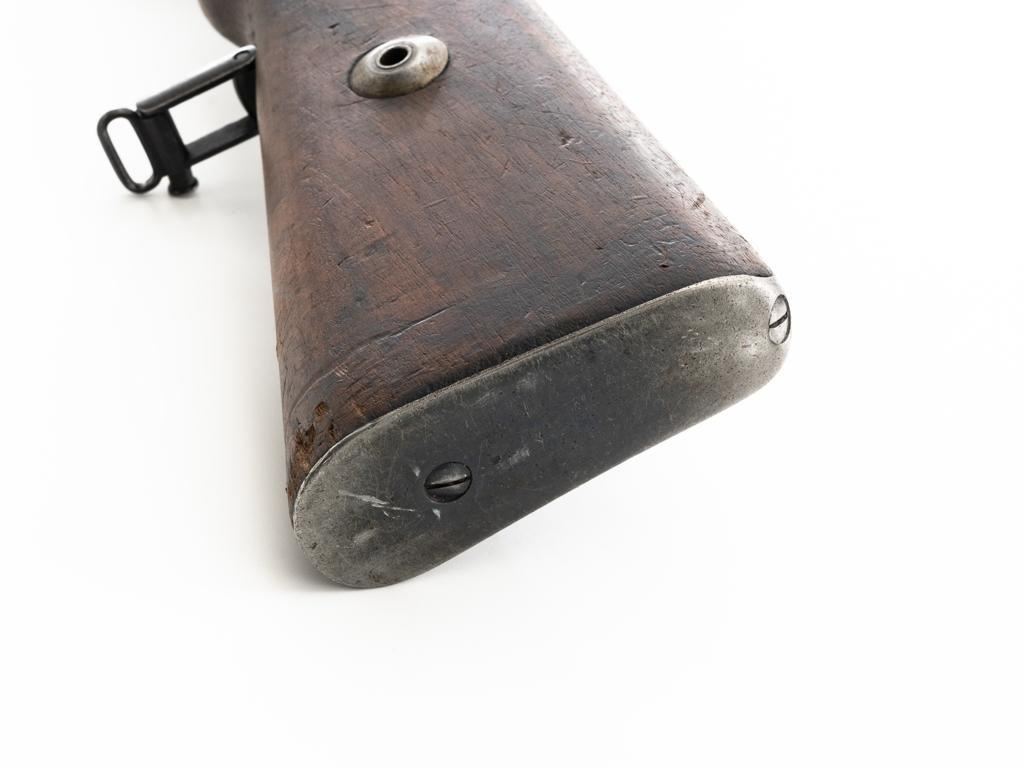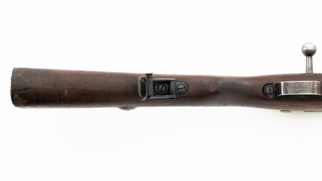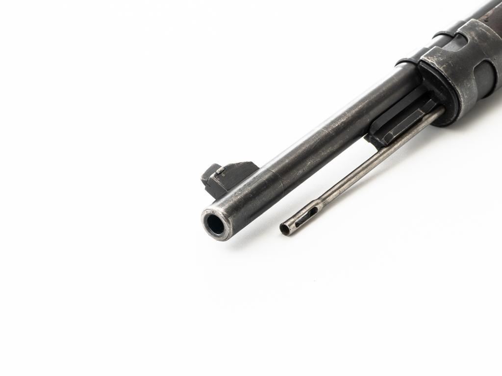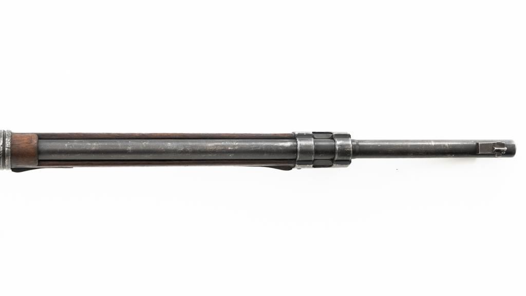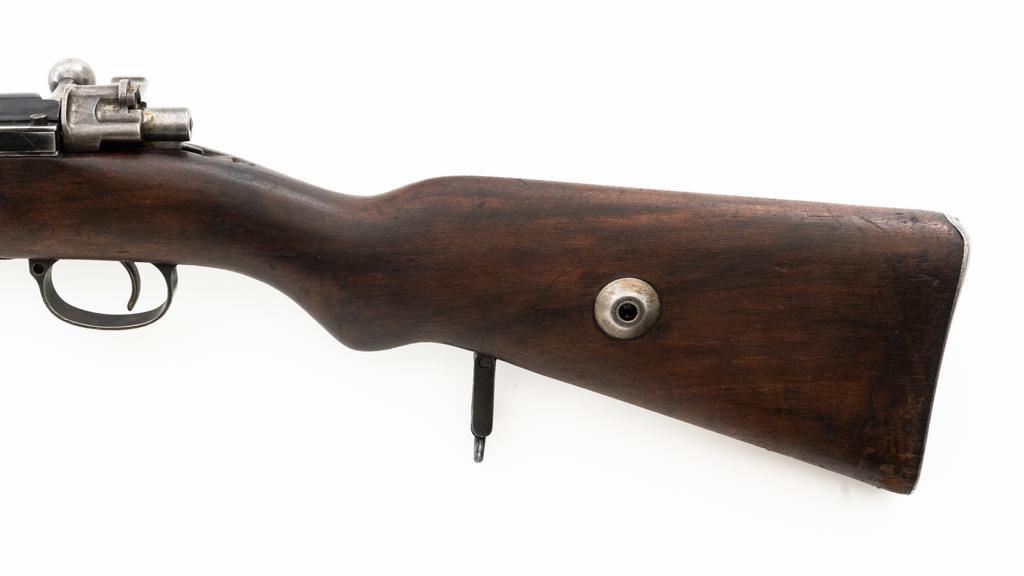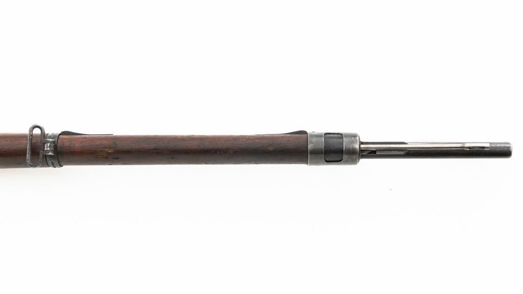 Czech Model 98/22 Mauser Bolt Action Rifle, #B2472, 8x57mm cal., 29.25" barrel, blued finish, hardwood stock and handguard, dovetailed inverted-"V" front sight, and adjustable tangent rear sight with "V"-notched groove, graduated to 2000 meters. Includes cleaning rod and detachable sling. Sling is in good used condition. Top of receiver ring is marked "CS.ST./ZBROJOVKA/BRNO". Rifle was accepted into Czech service and is stamped "E(Rampart Lion)23" below the receiver marking. There is a five pointed star stamped into the underside of the stock wrist. Numbers do not match. Import marked on right side of the barrel. Condition overall is very good, retaining approx. 70% blue, showing thinning and toning, primarily to the barrel and trigger guard. There is light pitting on left side of the rear barrel band. Wood with scattered dents and scratches, particularly on the underside of the forend and at the toe. Action operates smoothly. Bore is very good with clearly defined rifling. Est.: $400-$600. (C&R)