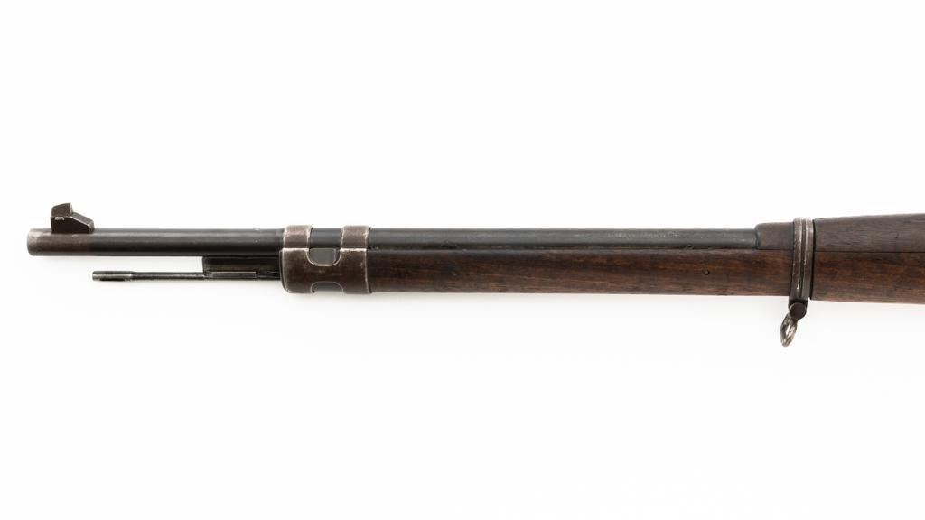 Czech Model 98/22 Mauser Bolt Action Rifle, #E5956, 8x57mm cal., 29.25" barrel, blued finish, hardwood stock and handguard, dovetailed inverted-"V" front sight, and adjustable tangent rear sight with "V"-notched groove. Rear sight leaf has been converted to Western numerals and graduated to 2000 meters. Includes a steel cleaning rod and detachable sling. Sling is in good used condition. Top of the receiver ring is marked "CESKOSLOVENSKA/ZBROJOVKA/BRNO". No visible numbers on bolt handle or other parts. Import marked on right side of the barrel. Condition overall is very good, retaining approx. 60%-65% thinning and toning blue, showing some pitting along the barrel at the wood line. Wood is very good with general moderate marks from handling and use, with a few small chips to the toe. Action operates smoothly. Bore is bright with very good, clearly defined rifling. Est.:$400-$600. (C&R)