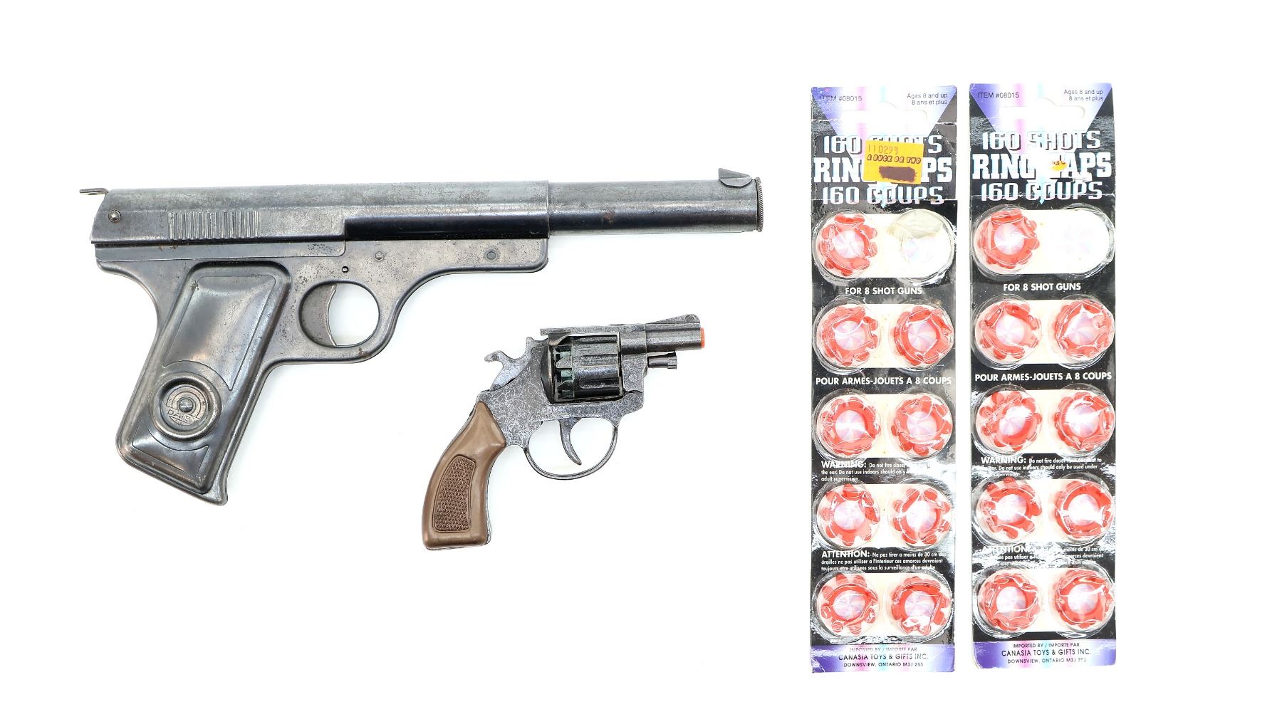 LOT INCLUDES; (1) .118 CAL., SPRING / AIR POWERED, MARKED "DAISY NO. 118 TARGETEER", ETC., DOES NOT FIRE, (1) TOY CAP GUN, DOUBLE ACTION REVOLVER, 8 SHOTS, MARKED "VICTORY", ETC., NO COCKING ISSUES, NOT FULLY TESTED & (2) 160 SHOTS RING CAPS, MAY NOT BE COMPLETE / PIECES MAY BE MISSING, SEALED IN ORIGINAL PACKAGING. SEE PHOTOS.