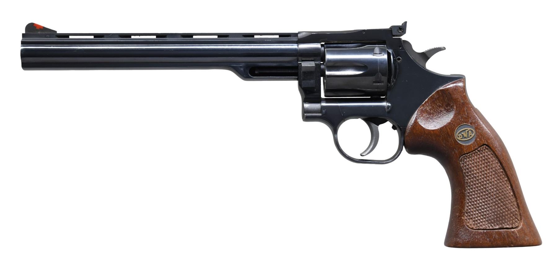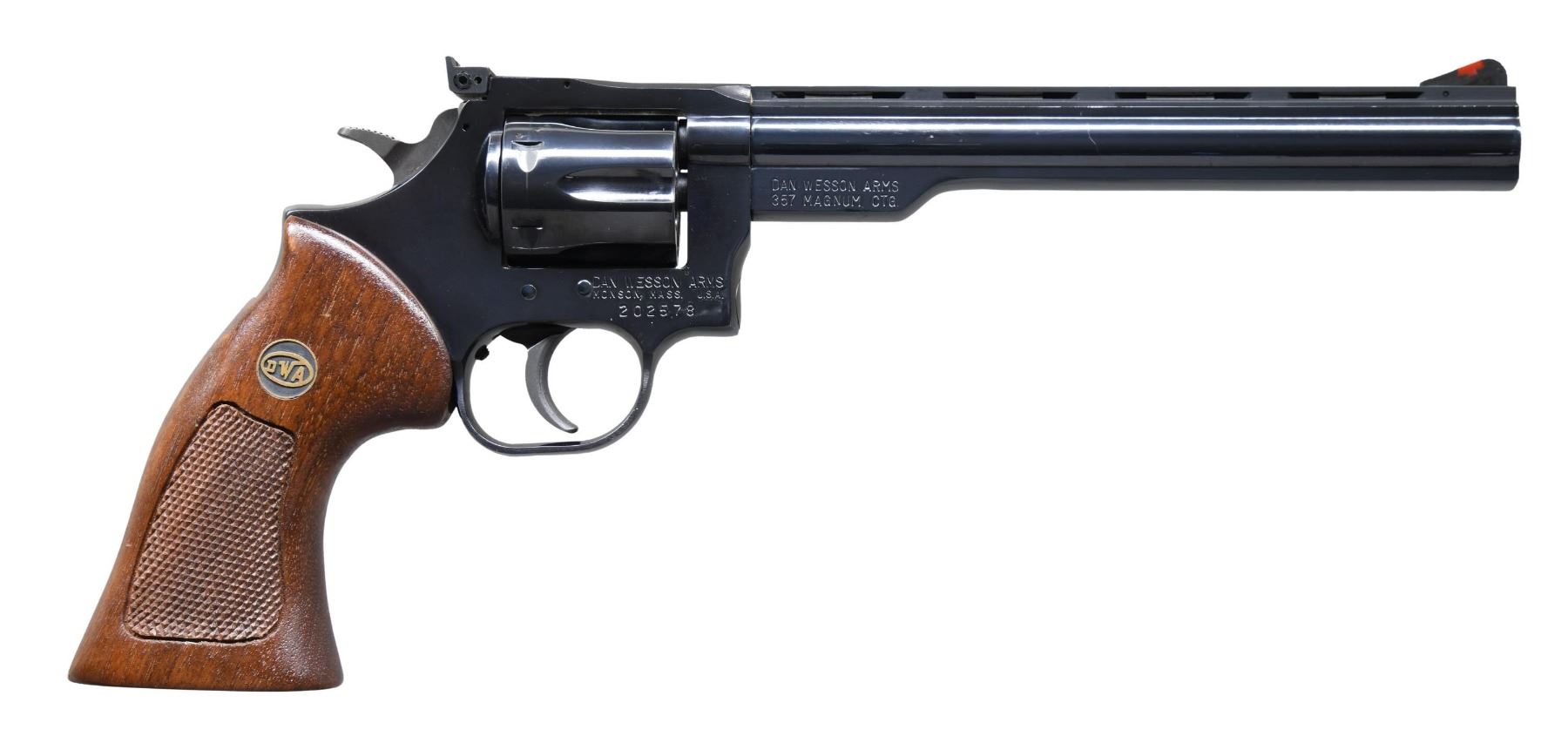 Cal. 357 Mag. S# 202578. Bbl. 8" vent ribbed with short ejector housing; shroud located by roll pin. Made in Monson, MA from about 1975 to 1991. Model 15 made about 1968-1975 before being improved. Model 15-2 is the best known model and the company's best seller. Checkered walnut target grip (similar in appearance to S&W grips) secured from butt; DWA grip emblems. Wide smooth faced target trigger and serrated hammer spur. User changeable red insert front sight blade and frame mounted factory white outlined rear sight. Front cylinder latch for improved lock up. Adjustable barrel gap for accuracy by recessed nut at muzzle. CONDITION: very faint cylinder turn line, light rub mark on top of rib and extremely light marks on sideplate; all other aspects near excellent including bore and grips. 25-3677/NW). MODERN. $350-500.