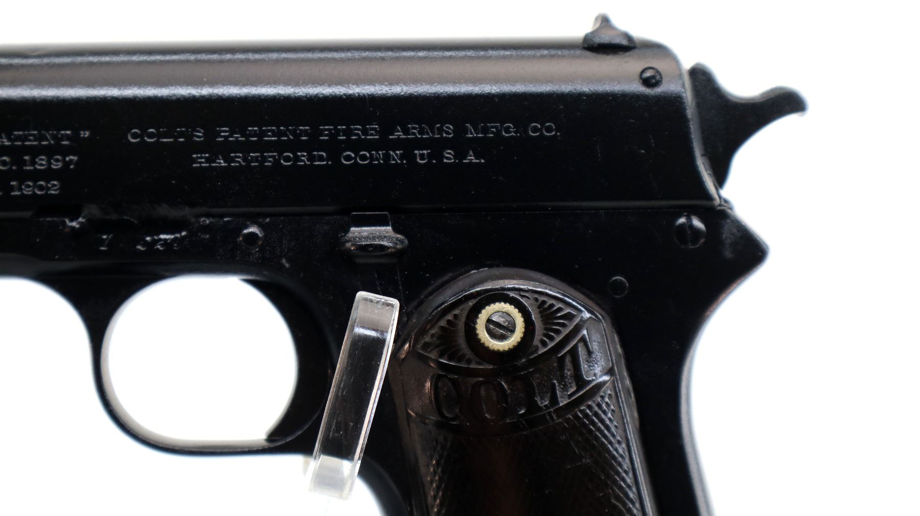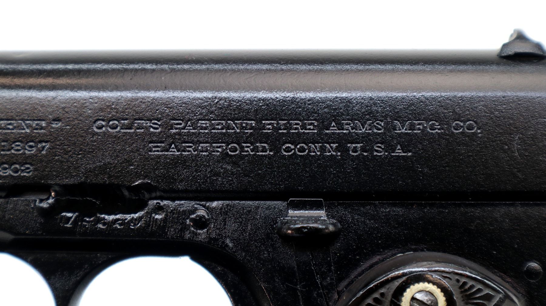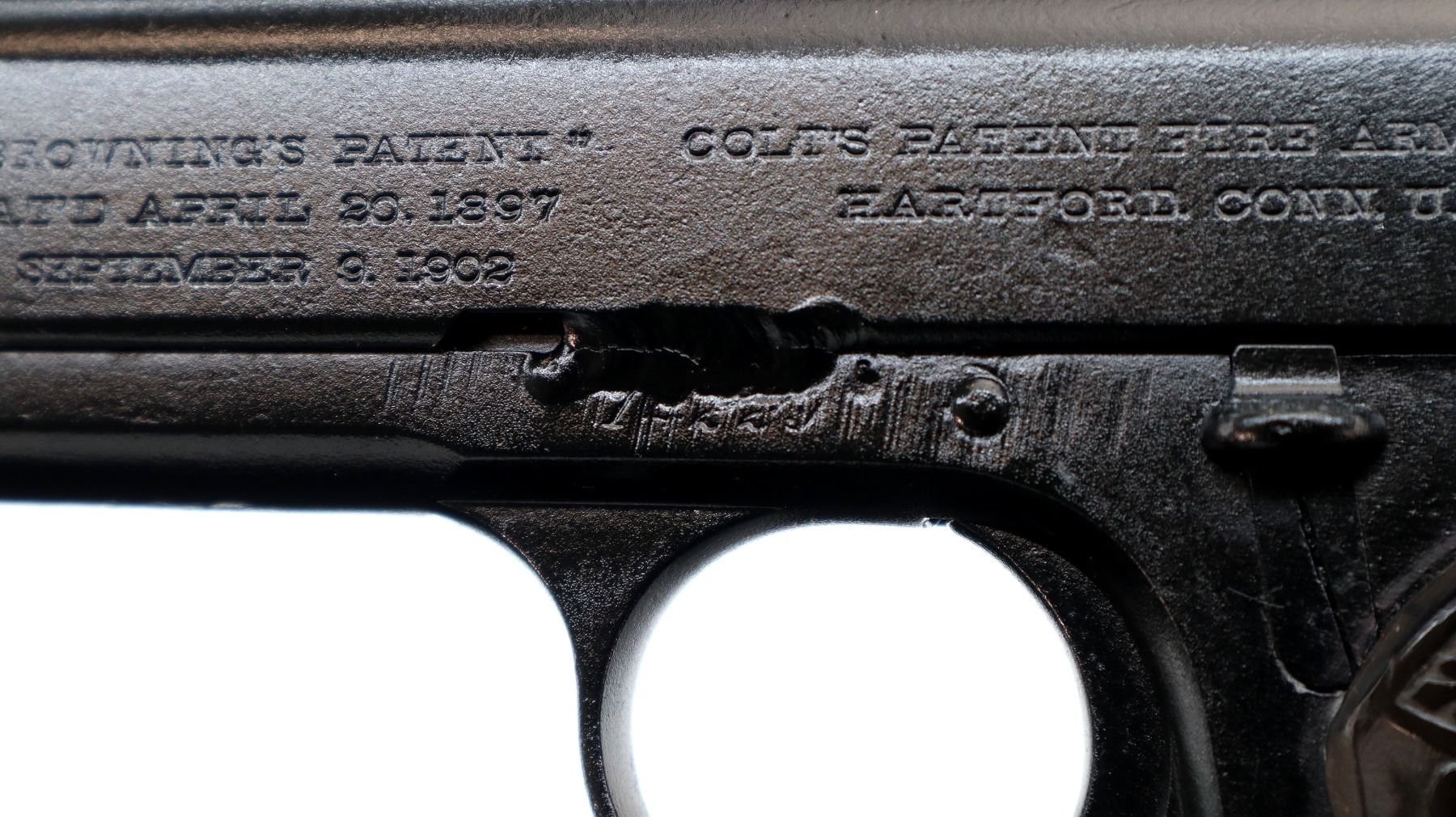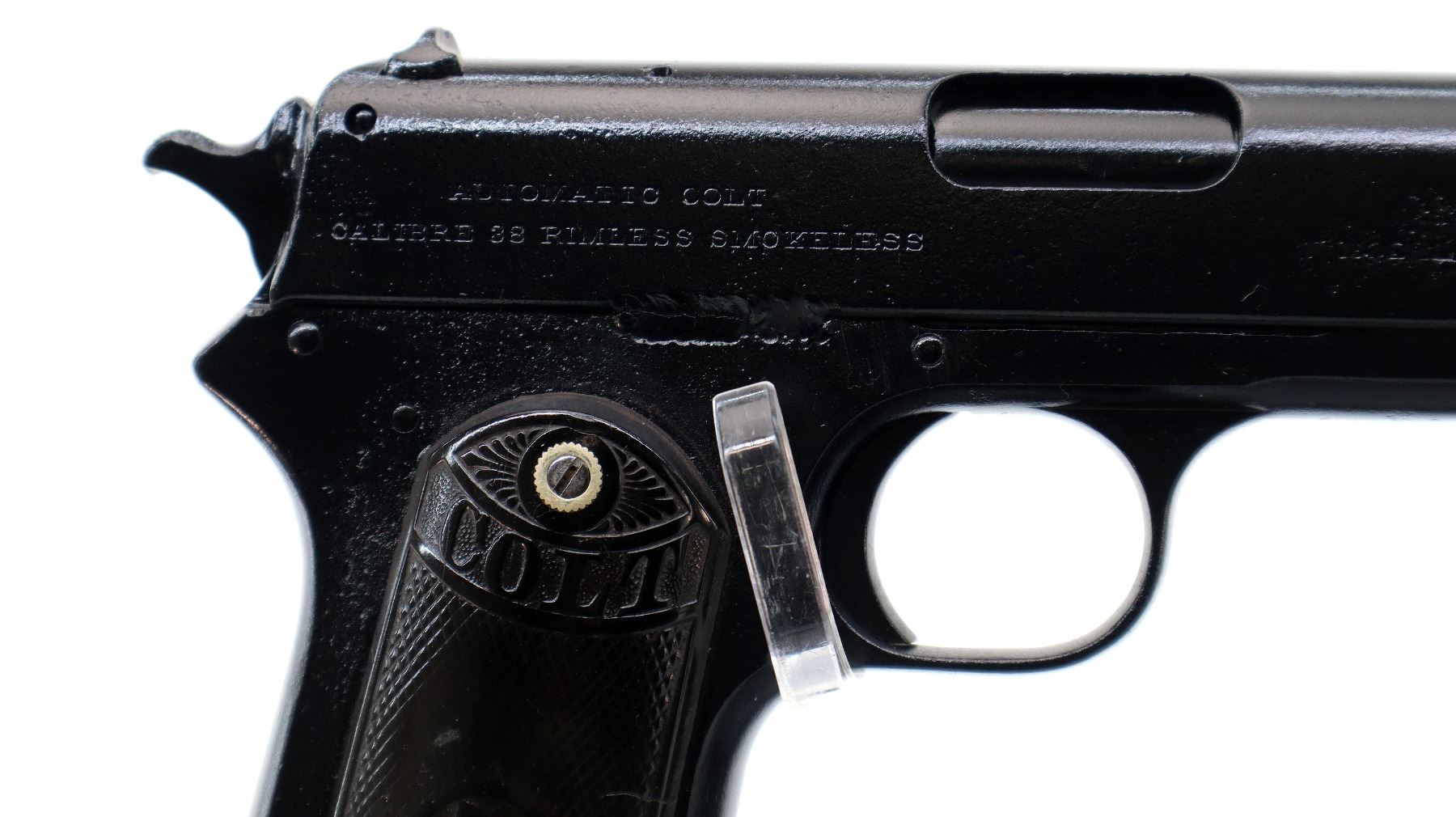 Main Description: This deactivation has six visible welds, action does not function, magazine is not removable. Blade front sight, u notched rear sight, metal painted black with pitting underneath, checkered spur hammer and smooth trigger, lanyard ring. Two piece checkered black polymer grips with Colt logos