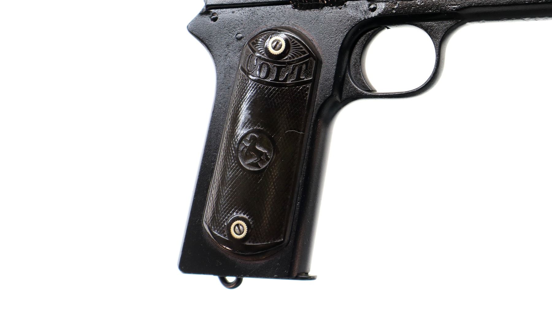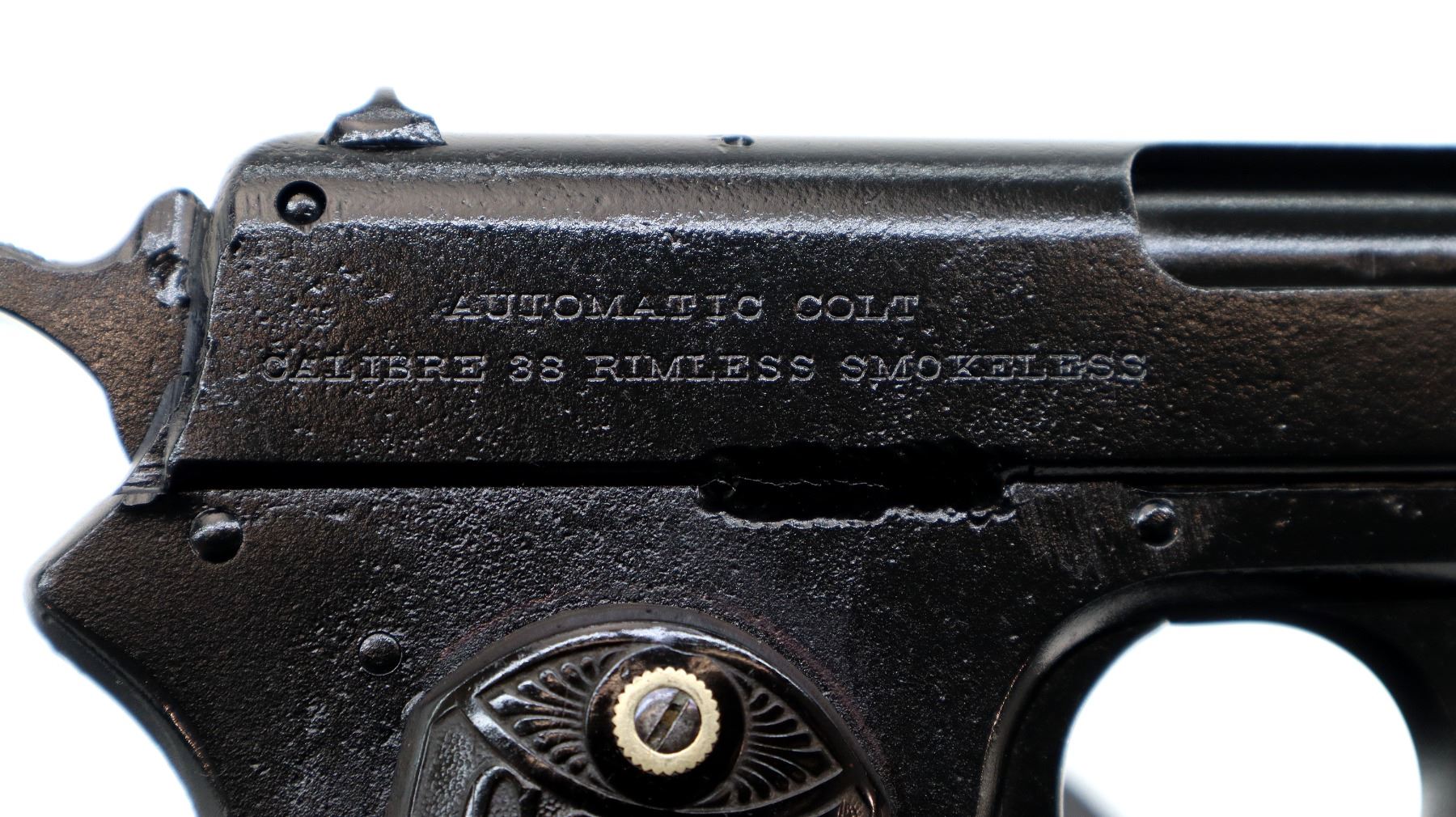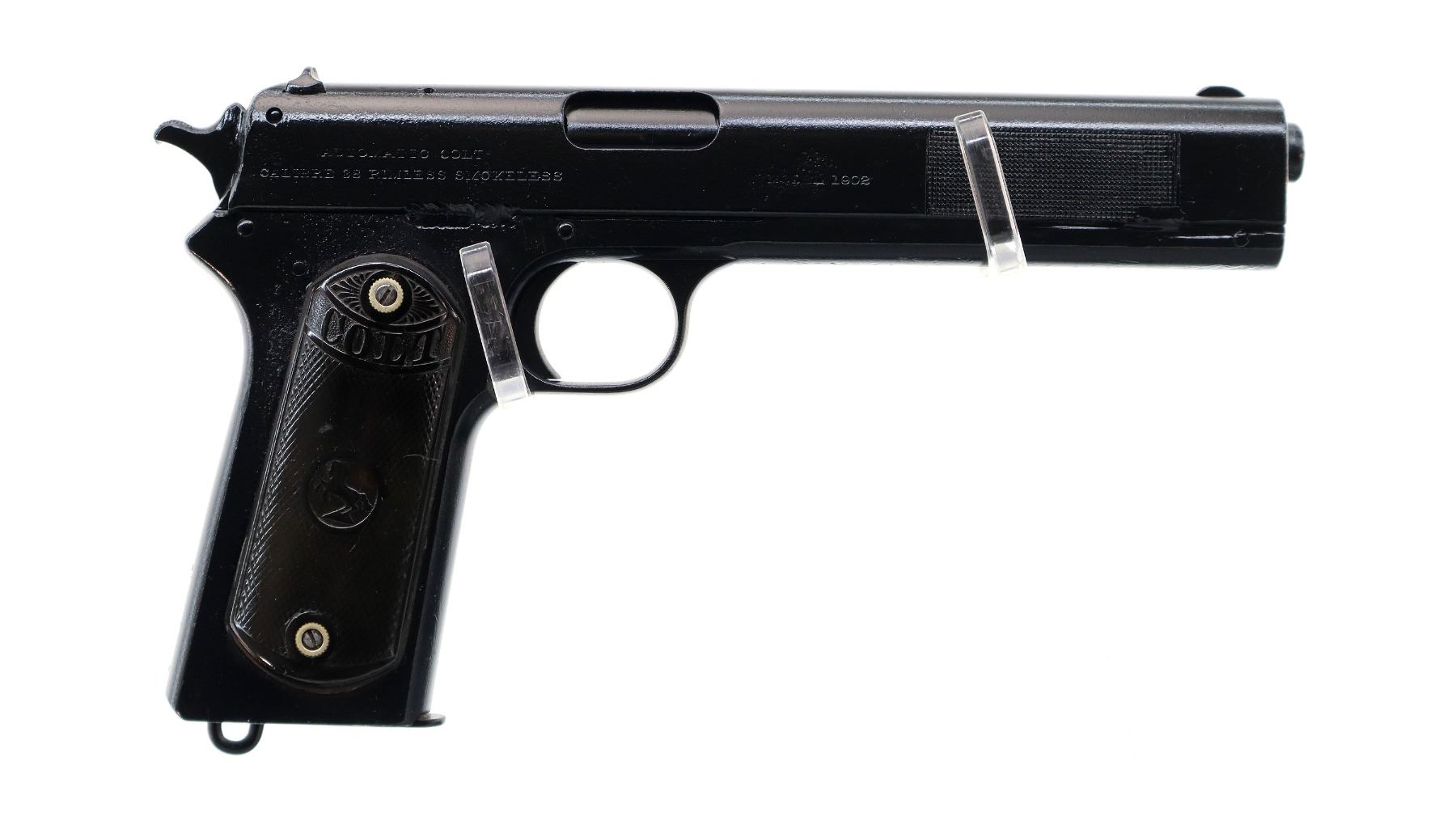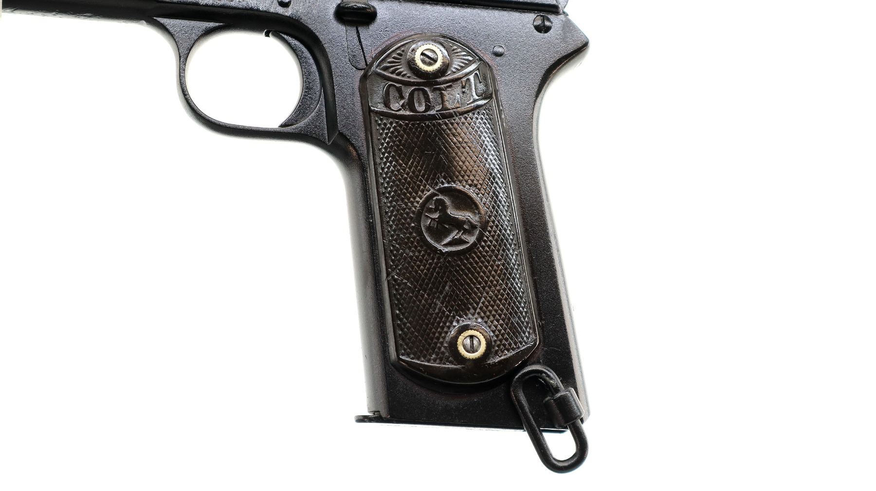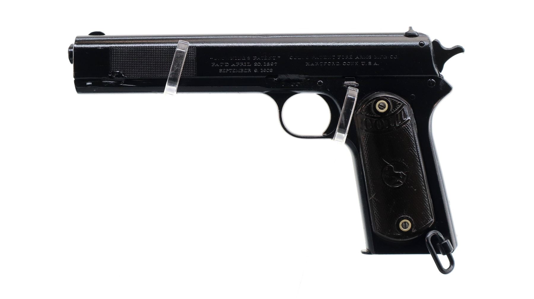 Main Description: This deactivation has six visible welds, action does not function, magazine is not removable. Blade front sight, u notched rear sight, metal painted black with pitting underneath, checkered spur hammer and smooth trigger, lanyard ring. Two piece checkered black polymer grips with Colt logos