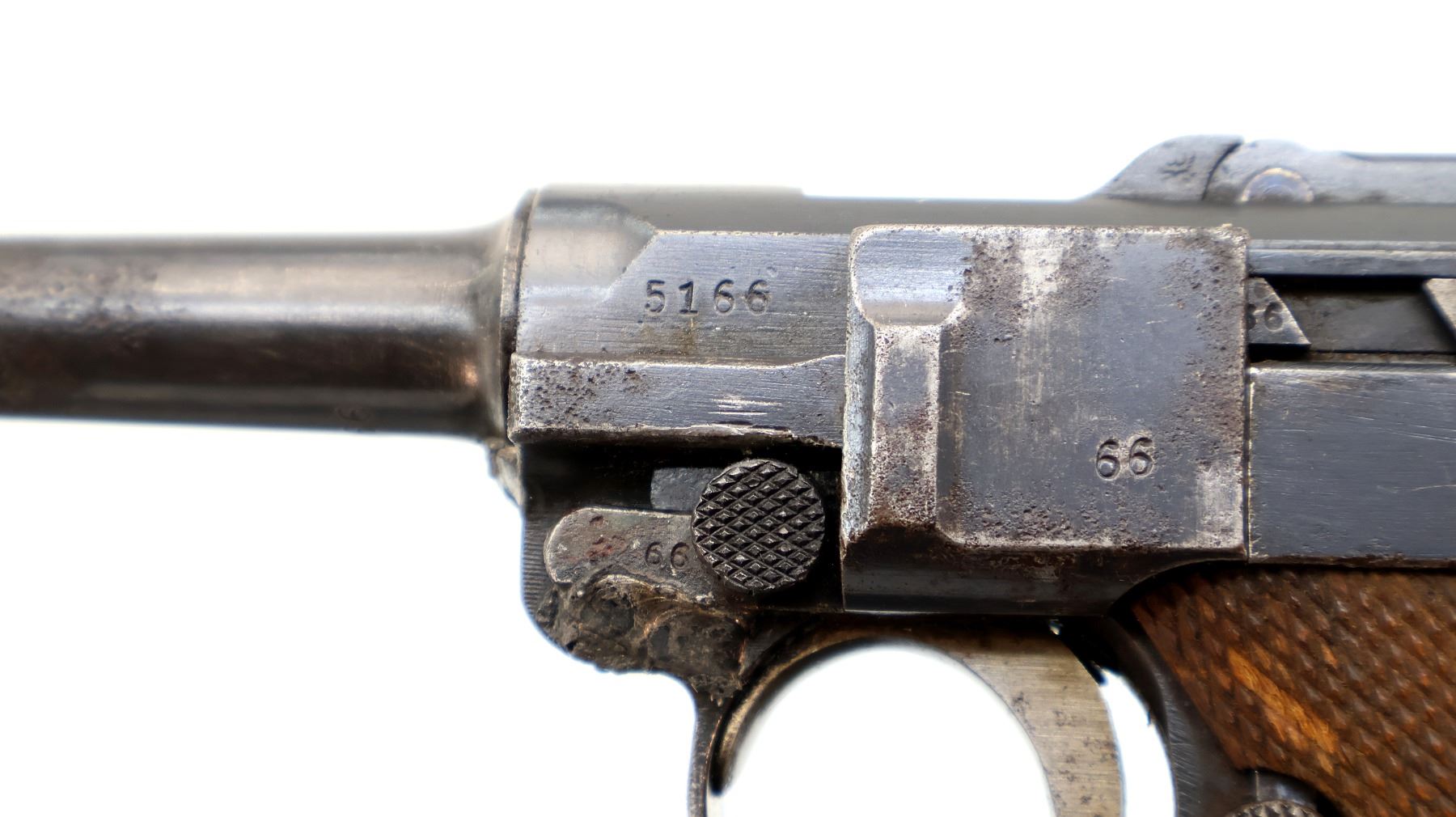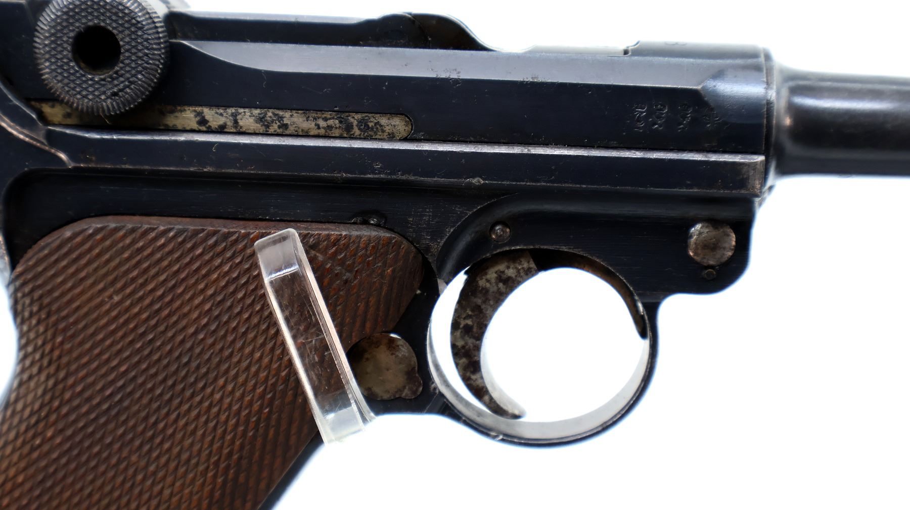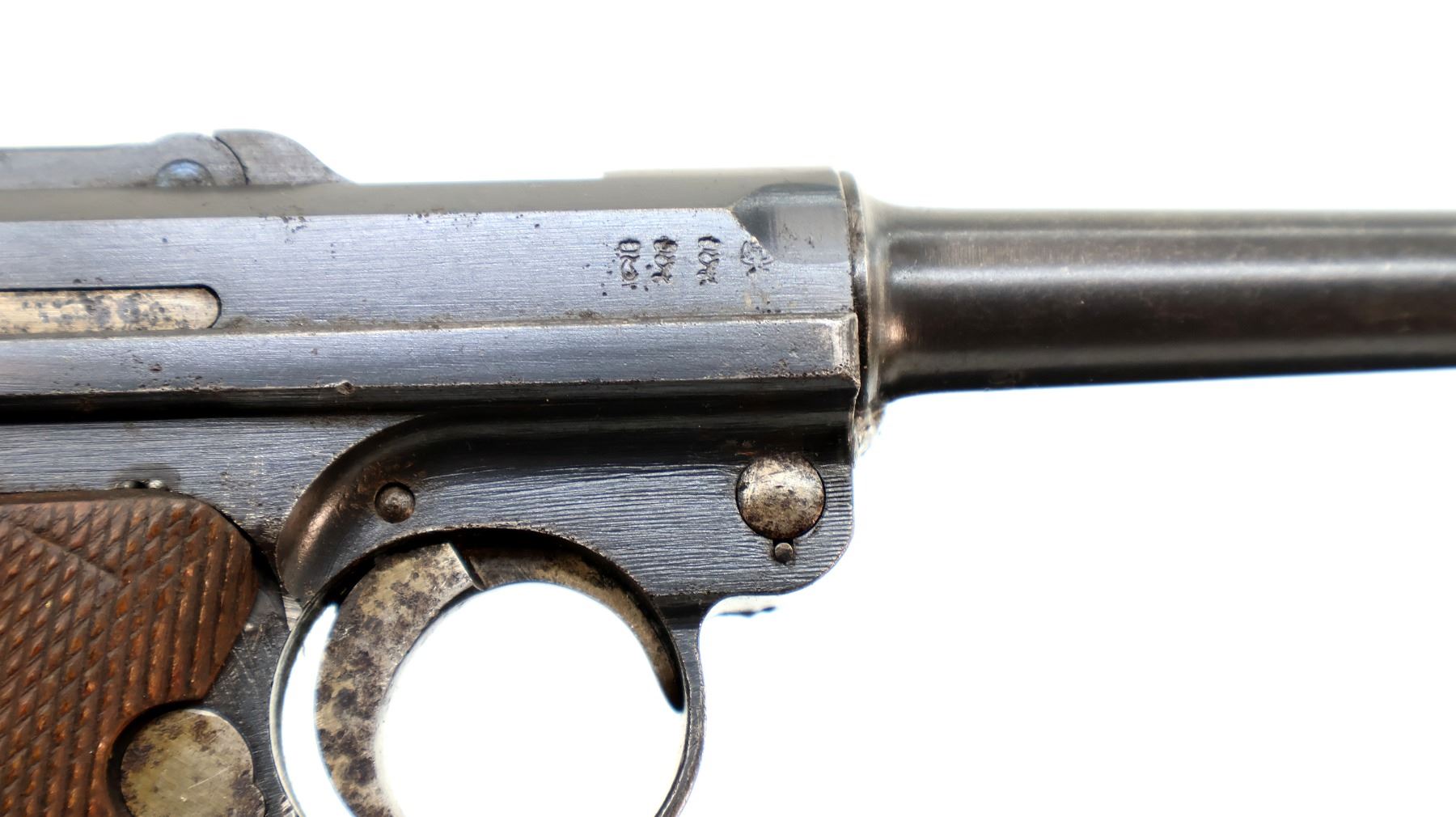 Wear: Metal finish shows some pitting, light rust speckles, scratches, handling marks and wear. Grips show some marks, scratches and wear.