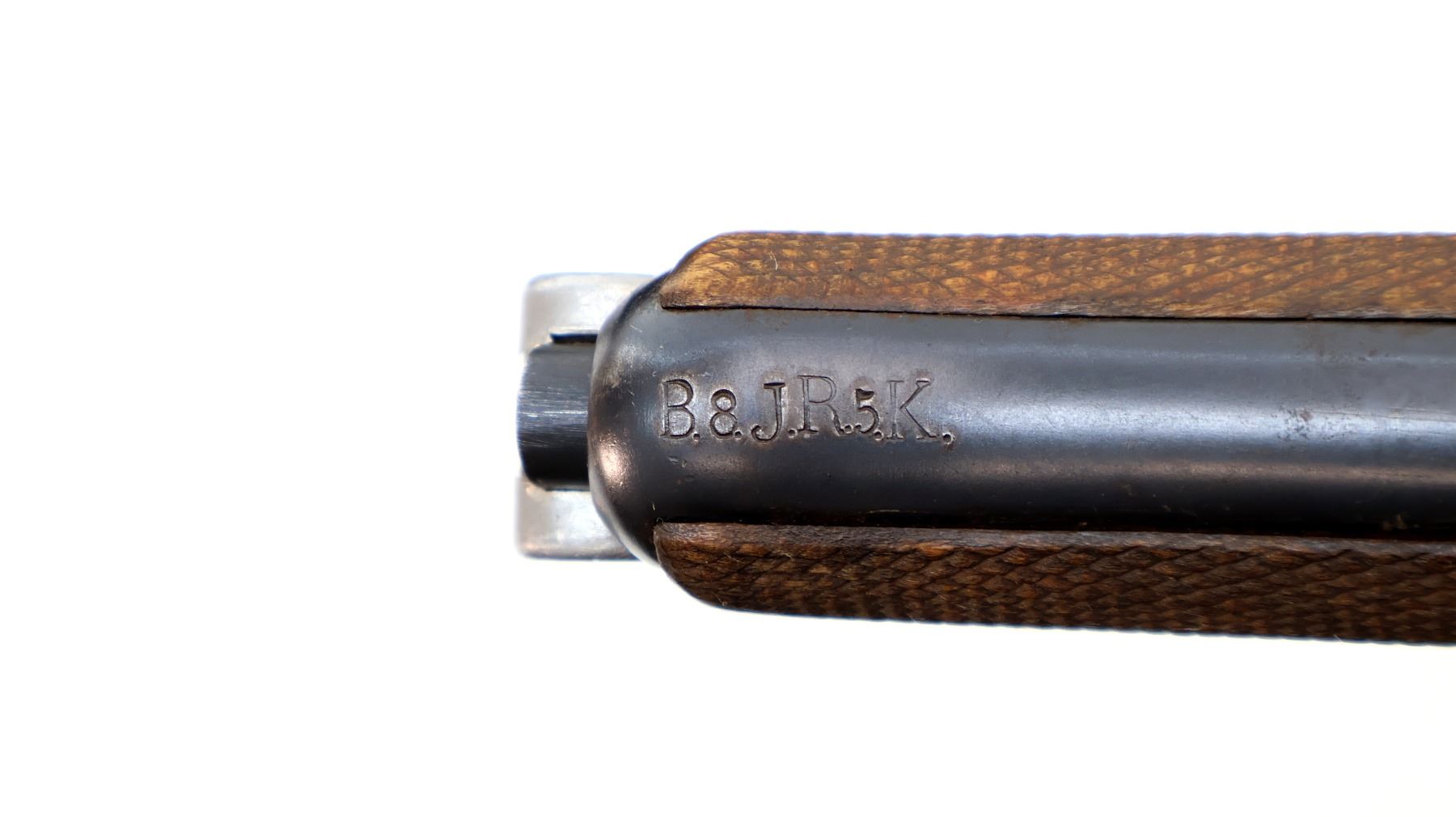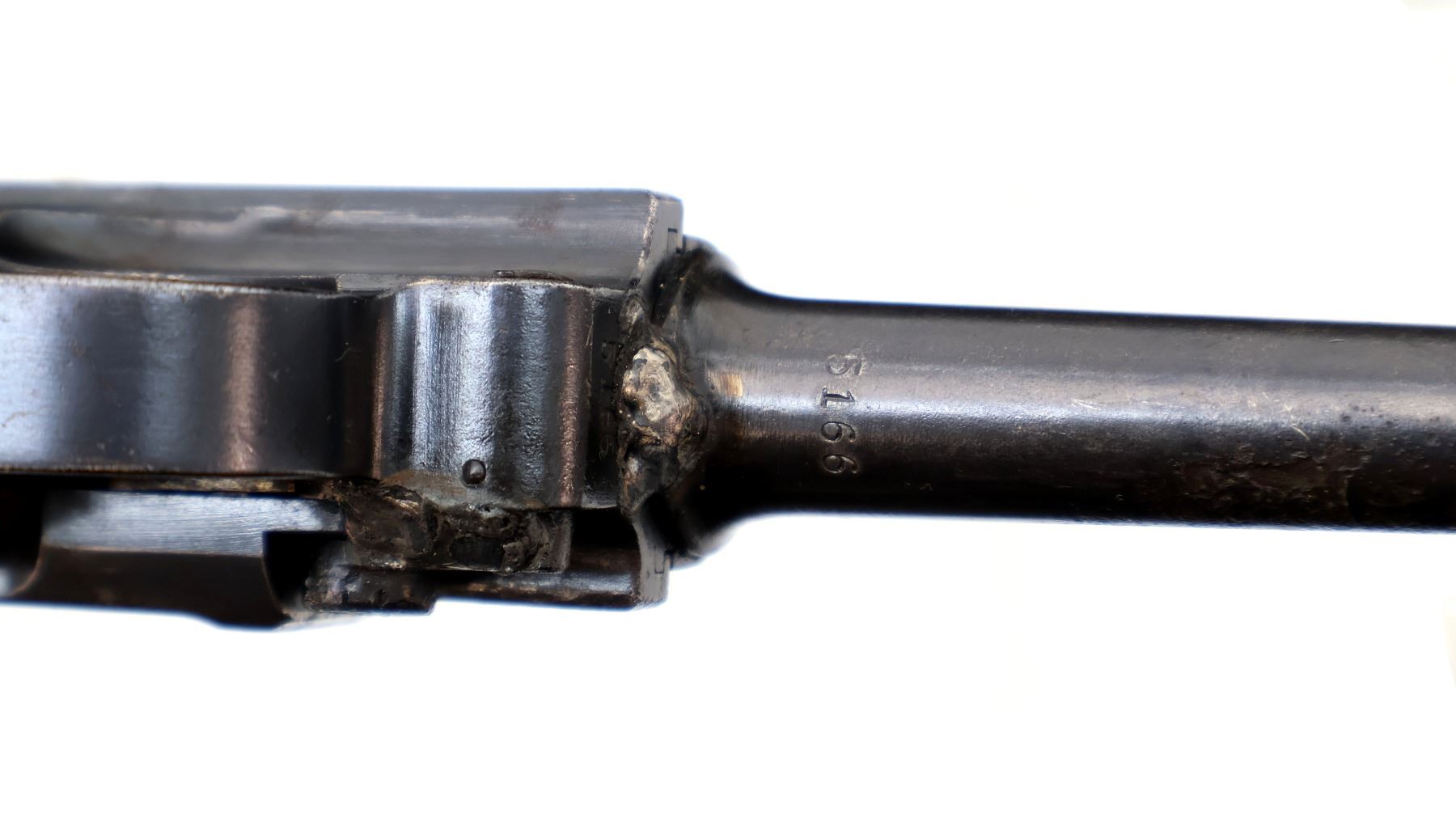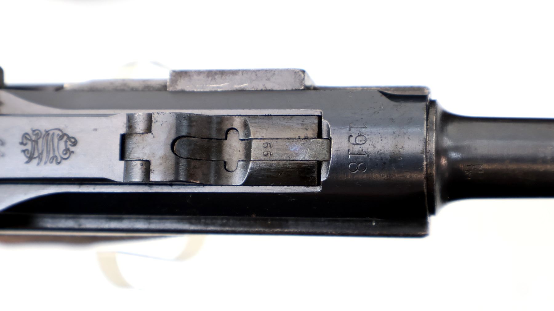 Main Description: This deactivation has four visible welds, magazine is not removable action does not function cannot be disassembled. Manufactured by DWM 1918, visible numbers match. Blade front sight with ramp, fixed u notched rear sight, blued finish, lanyard ring shoulder stock lug, front of grip marked B.8.JR.5.K, aluminum bottomed magazine. Two piece checkered wood grips