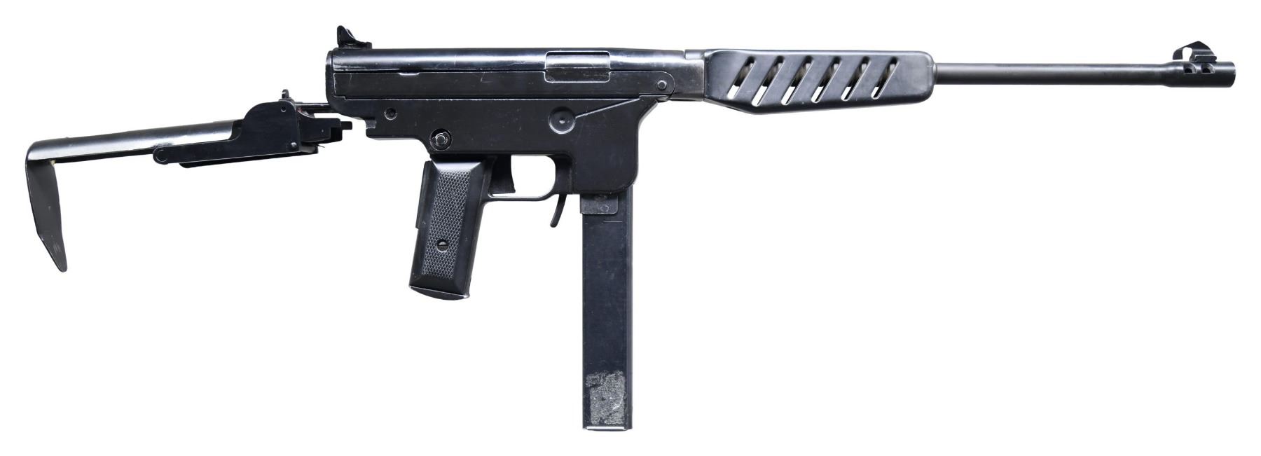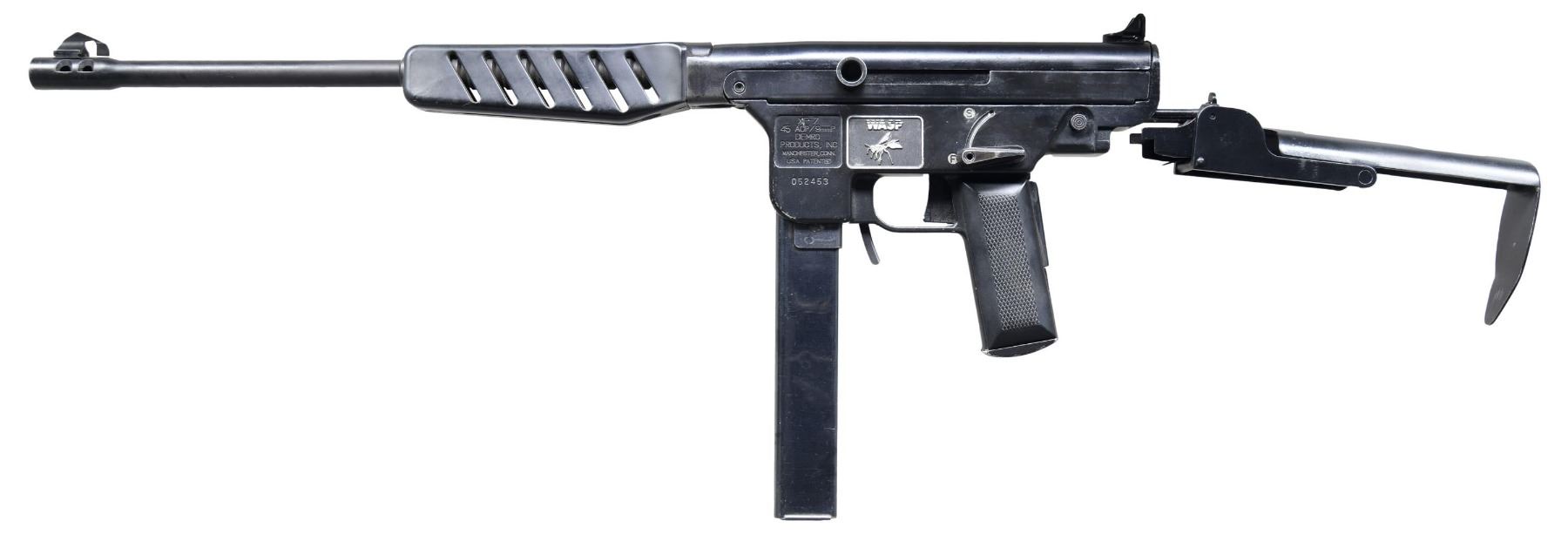 Cal. 45 ACP. S# 052453. Bbl. 17" over integral muzzle brake.  The XF-7 Wasp semi-automatic carbine manufactured by Demro Products is an open bolt, blowback operated, self loading carbine available in 45ACP & 9MM Parabellum.  Tapered barrel w/ 6" section of cooling fins located beneath front handguard. Left side of receiver exhibits markings w/ Demro's mfg. information, the model and cal. designations, as well as the S#. Exposed blade front sight. Left side, reciprocating charging handle. Left side safety / selector. Aluminum lower receiver with steel upper assembly, bbl., and collapsible, folding shoulder stock. Checkered black polymer grips with ventilated black polymer forend.  MAGS: 2 steel 30 rd. CONDITION: Finish is complete & consistent w/ some gentle signs of thinning, primarily in areas of mechanical intervention & drag lines typical of "stacked" storage. Shoulder stock functions correctly though locking mechanism has relaxed a bit over the years. Bright bore w/ strong rifling. Furniture shows some scattered handling marks, while remaining one of the cleanest examples this cataloger has encountered in several years.  (25-2229/JZ). MODERN. $400-600