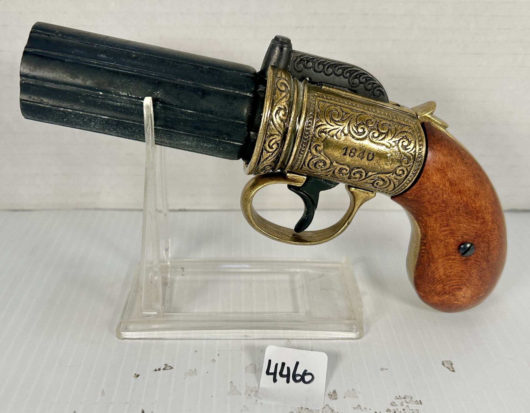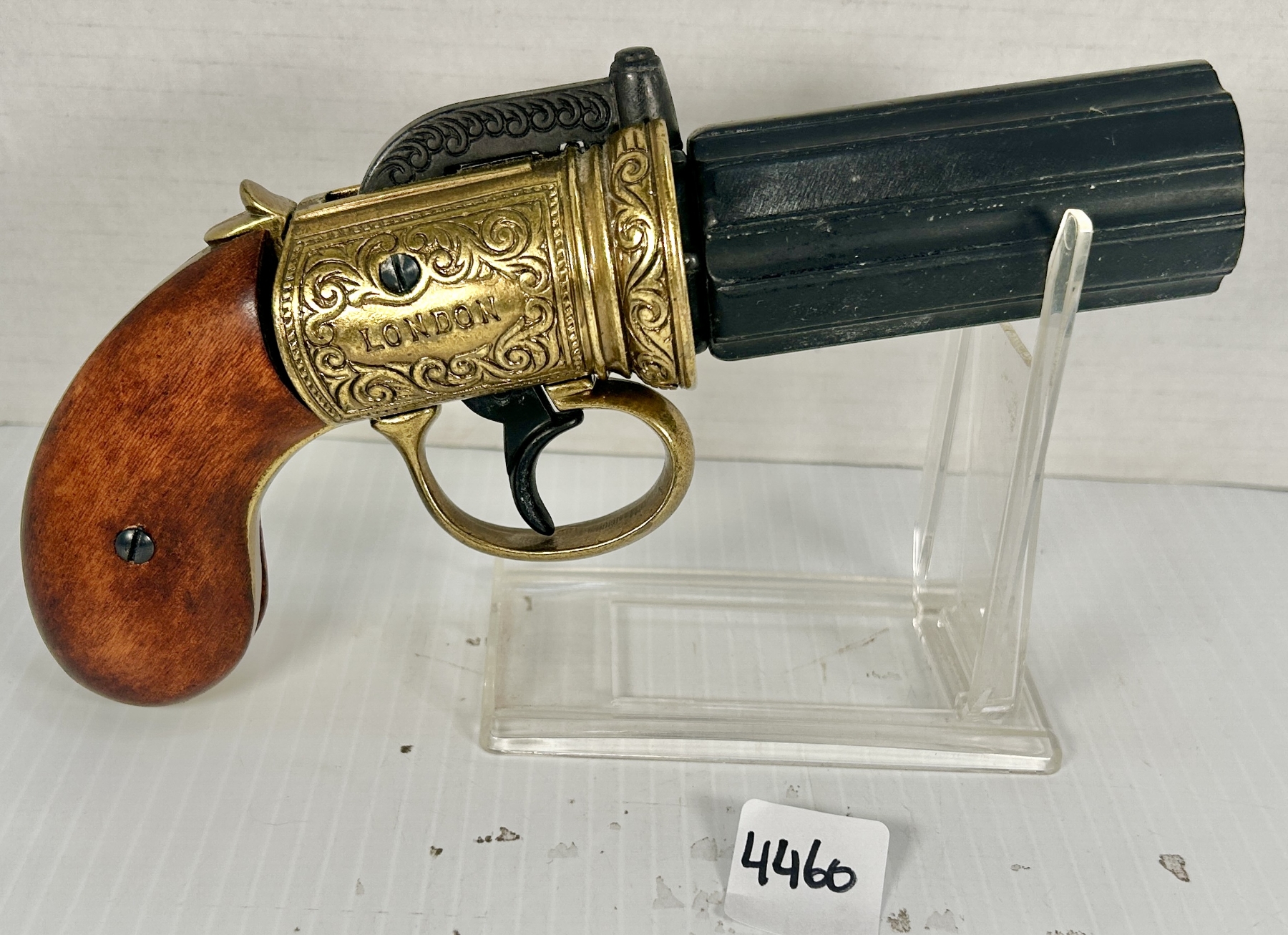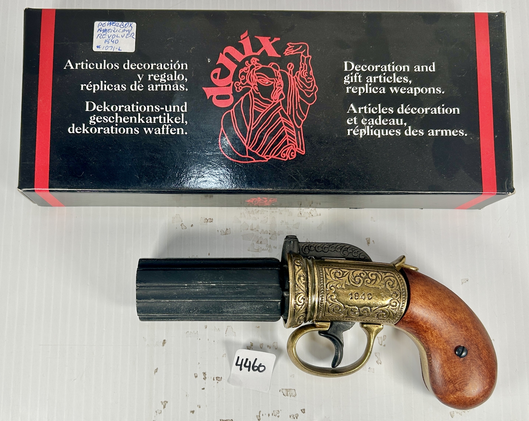 CONDITION: G-VG. SPECS: 3.5 IN BARRELS. NON FIRING REPLICA. MADE IN SPAIN. ENGRAVED. MARKED 1840 LONDON. EXTRAS: ORIGIANL BOX. SERIAL: NONE.