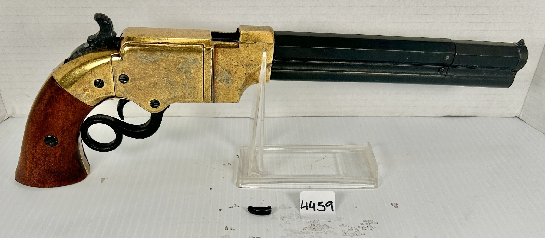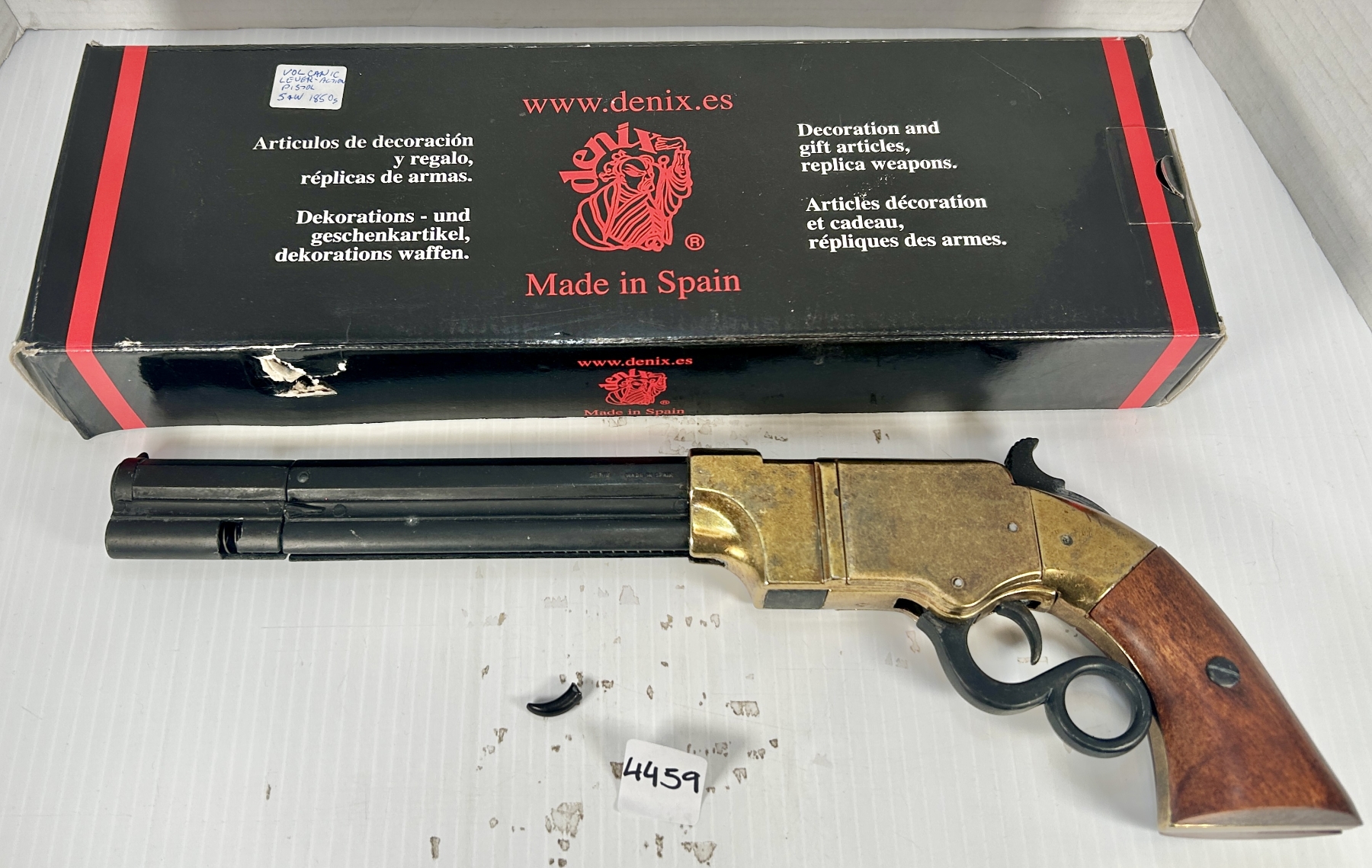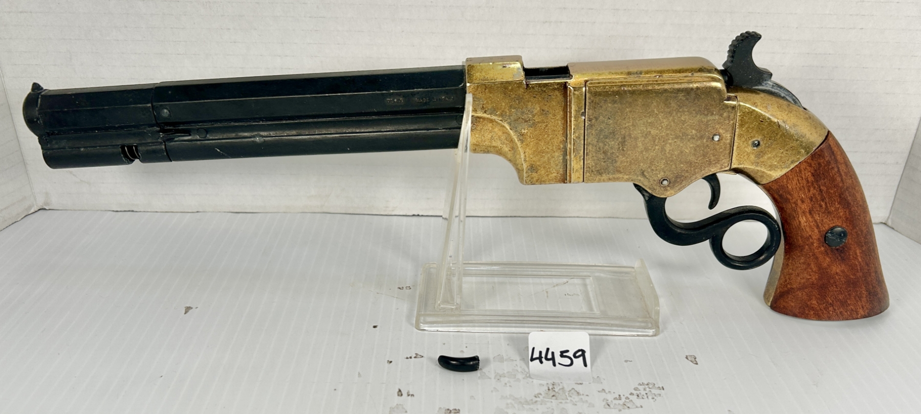 CONDITION: G-VG. LOADING LEVER BROKEN. BLOCKED BARREL. SPECS: 8 IN BARREL. NON FIRING REPLICA. MADE IN SPAIN. EXTRAS: ORIGINAL BOX. SERIAL: NONE.