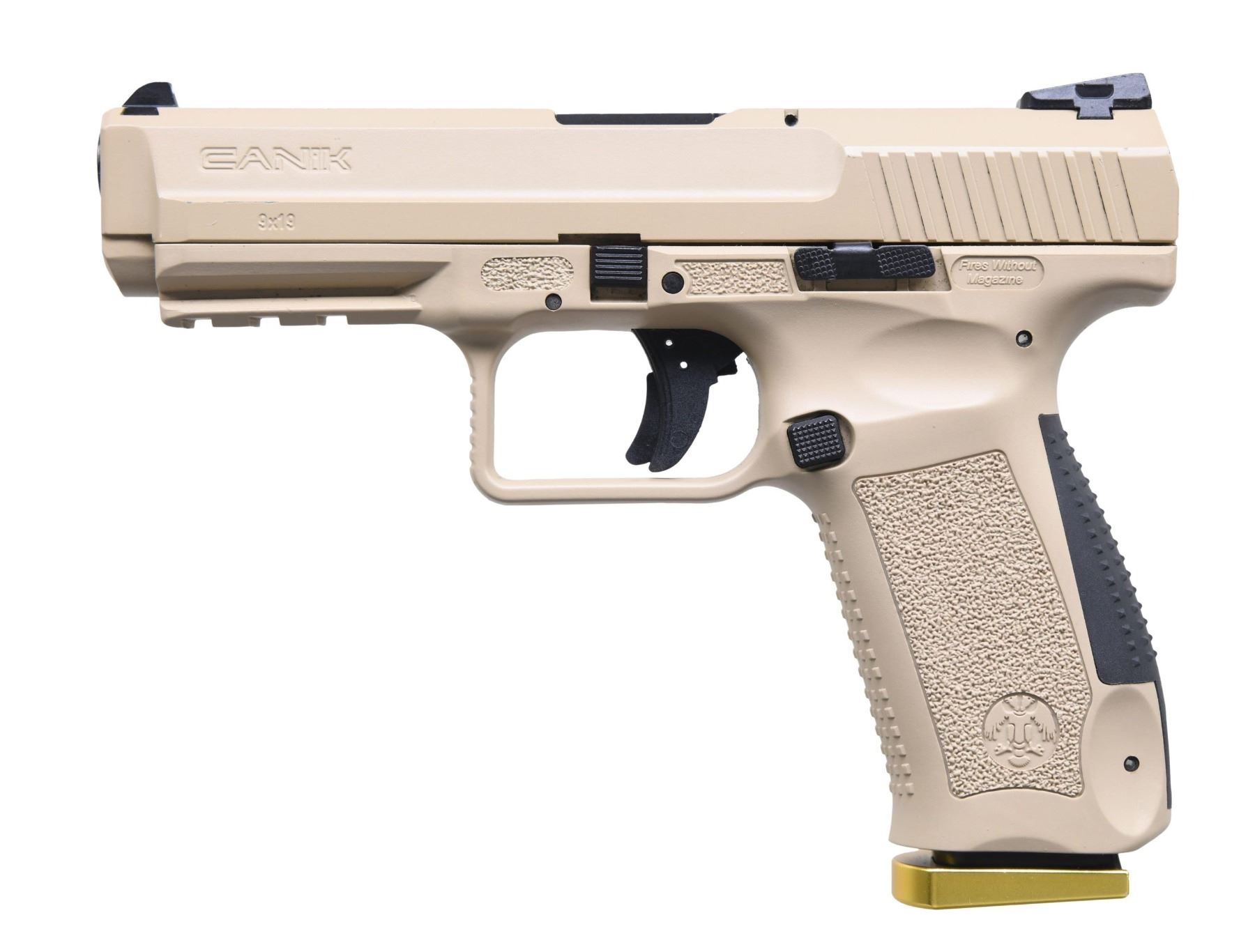 Cal. 9mm. S# T6472-16AT15067. Bbl. 4.5". Desert tan, striker-fired, polymer-frame pistol. Serrated slide. Three-dot sights. Left side controls. Short Picatinny rail section below barrel for accessory mounting. Loaded chamber indicator. Stippled and checkered pistol grip. MAGS: 1 factory 18-rd.  CONDITION: finish is complete and consistent, with only some gentle thinning on high spots. Bright bore with strong rifling. (24-6359/JZ). MODERN. $350-500.