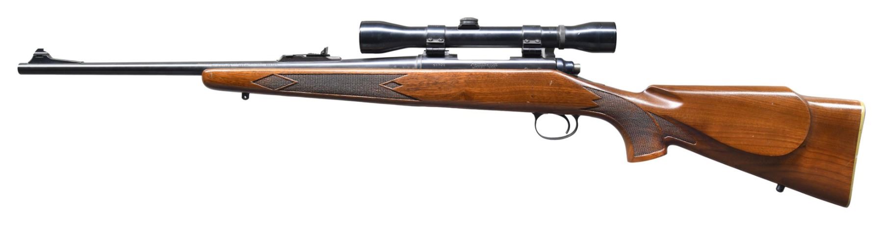 CARBINE. Cal. 222 Rem. S# 51721. Bbl. 20" w/ code "BK" indicating Jan. 1963 mfg. Ramped blade front sight & elevator rear sight. El Paso Texas Weaver K4 60-B, crosshair scope on Weaver rings & bases. Matching numbered bolt. ADL press checkered walnut stock w/ alloy buttplate. CONDITION: Very good blue. Wood has extra varnish applied with handling marks. Very good bore. Scope has very good finish w/ serviceable optics. (25-3192/MD). CURIO. $800-1,200.