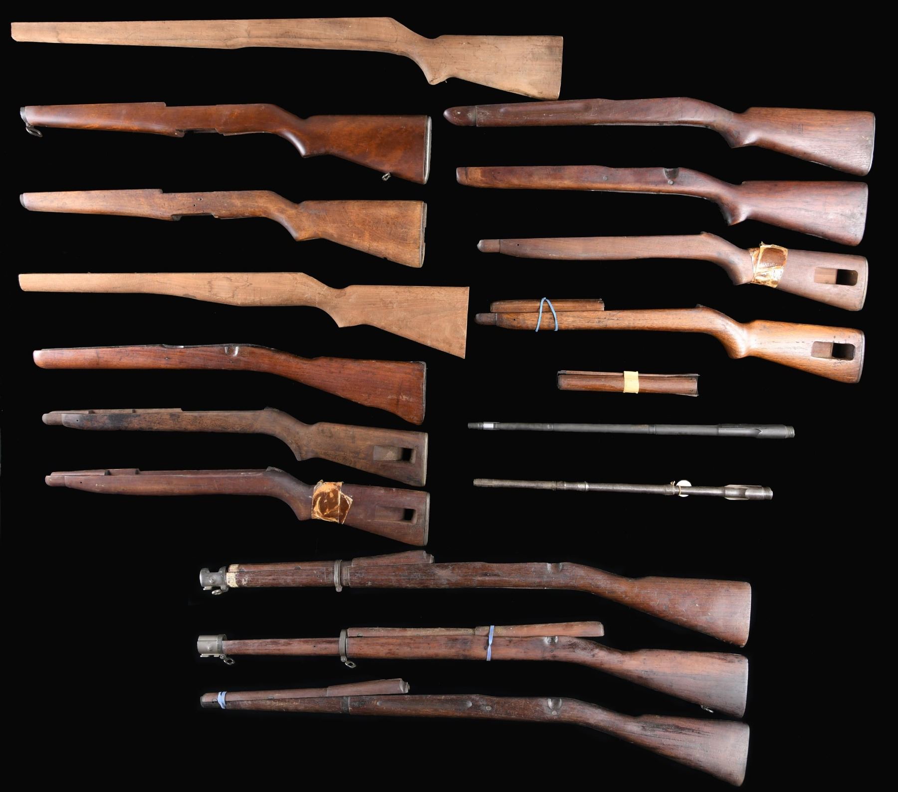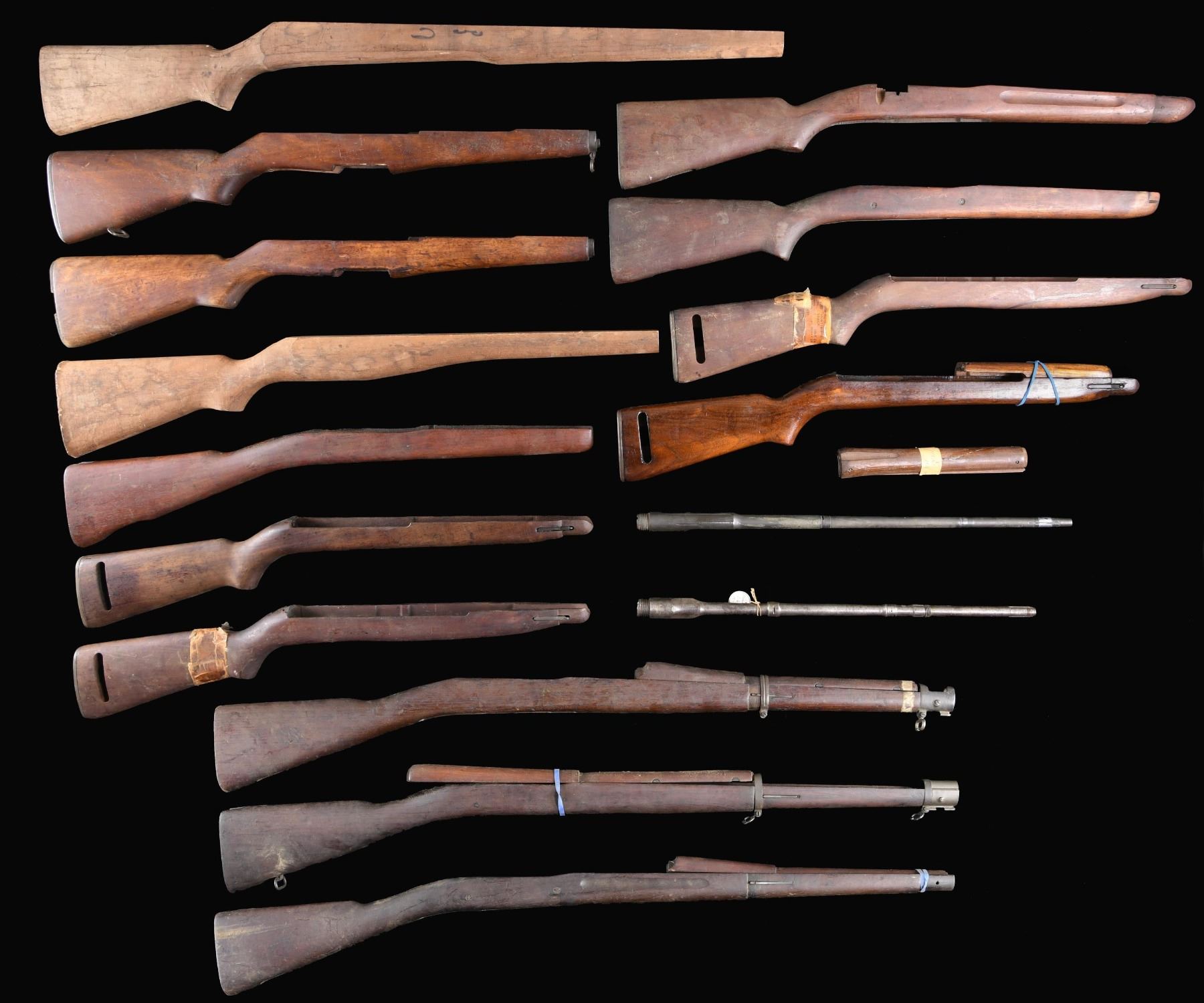 AND HANDGUARDS. (M1 Carbine Stocks) No.1: Unissued potbelly low-wood oval-cut walnut stock with remnants of original taped inventory tag. The tag has a "DEC 59" date. Stock marked "SA" beside bbl. channel is complete w/ recoil plate & buttplate. CONDITION: stock shows light handling wear & staining throughout. Inventory tag has deteriorated tape & legibility issues. / No.2: Unissued walnut low-wood oval-cut potbelly w/ remnants of the original taped inventory tag. Marked w/ the date "DEC. 59". Unmarked stock is complete w/ buttplate & recoil plate. CONDITION: stock shows light handling wear & staining throughout. Inventory tag has deteriorated tape & legibility issues. / No.3: High-wood oval-cut walnut stock is unmarked & is complete w/ buttplate & recoil plate. CONDITION: stock shows little use w/ a thin finish w/ light handling wear & a stained appearance throughout. / No.4: Oval-cut low-wood stock marked "IO" in sling slot & has boxed "2" at end of grip. Also marked w/ a "-61" in the bbl. channel. Stock is complete w/ buttplate, recoil plate & two rivet handguard. CONDITION: stock has extensive wear & handling marks. Arsenal rework finish w/ added finish. (Springfield 22 Cal. Training Rifle Stocks) No.1: Walnut stock w/ grasping grooves. Marked on the left side of the cheek area w/ boxed "S.A. / R.". Encircled "P" proof under grip. Stock is equipped w/ coarse checkered non-trap buttplate. Bbl. band retaining pin is present. Stock has arsenal cut for Lyman receiver sight & relief cut has been added for a low bolt handle. CONDITION: stock has lightly worn original finish w/ staining & scattered small handling marks. (Springfield Model 1903 & 03A3 Stocks) No.1: Walnut Model 1903 straight grip "S" type stock w/ two recoil bolts. Stock markings obscured due to arsenal rework finish. Only metal parts present is the rear band spring. Walnut handguard is present. CONDITION: in addition to its finish, the stock has an inletted repair behind receiver tang w/ arsenal quality work. Stock has extensive wear, staining & handling marks. / No.2: Model 1903A3 Walnut straight grip stock w/ visible boxed "OG" on the left of the cheek area & "P" proof under grip. Stock has two recoil pins. Metal parts include the stamped upper & lower bands & butt swivel. Handguard is included. CONDITION: stock set has arsenal rework finish over wear, handling marks & extensive staining. / No.3: 1903A3 walnut stock w/ reinforcement pins. Stock has faint boxed "FJA" on left side. Upper & lower milled bands included. Handguard is present. CONDITON: stock & handguard have arsenal rework finish w/ moderate wear, staining & handling marks throughout. Handguard has notable crack in forward end. Left side of forend has area of practice checkering. / No.4: Sporterized walnut Model 1903A3 stock. Stock cut at lower band. Rear swivel has been removed w/ extensive loss of wood. CONDITION: stock has wear & staining over refinish. / No.5: Walnut type "C" shortened stock w/ faint "SA", "SPG" marking on left side & faint drawing number at belly. Stock cut ii the area of the lower band & partially reshaped. CONDITION: stock has arsenal rework finish & moderate wear w/ extensive staining. / No.5: Approximately 50% complete pistol grip replacement walnut stock for 1903 Springfield. Stock has bbl. & receiver channel & lightening cuts inletted. Buttplate & rear swivel mortices are complete. CONDITION: stock has coarse machine marks w/ handling wear & staining. (M1 Garand Stocks) No.1: Unmarked hardwood replacement buttstock complete w/ trap buttplate, butt swivel & stock ferrule. CONDITION: stock is in good condition w/ only light wear & staining. / No.2: Hardwood replacement buttstock for M1 Garand. Unmarked. No metal parts included. Bbl. marked on left side w/ "HRA 2 54". Export marked on forward end of bbl. CONDITION: stock has considerable wear, handling marks & staining throughout & two small holes on the left side over magazine area. Bbl. w/ well-worn parkerized finish has fair worn bore turning dark. (M14 Stocks) No.1: One walnut buttstock partially completed on the outside, no inletting has been done. CONDITION: good condition w/ stained appearance. / No.2: Bbl. marked "H R7790190 7 62 AE". Bbl. has chrome lined bore. CONDITION: bbl. turning gray & patina w/ light wear. All threads appear intact. Very good shiny bore. (Model 1917 Rifle Stocks) No.1: Front & rear walnut handguards w/ metal reinforcements. CONDITION: extensively repaired handguards w/ wear & staining. (02-24462-9/RW). NON-GUN. $600-800.