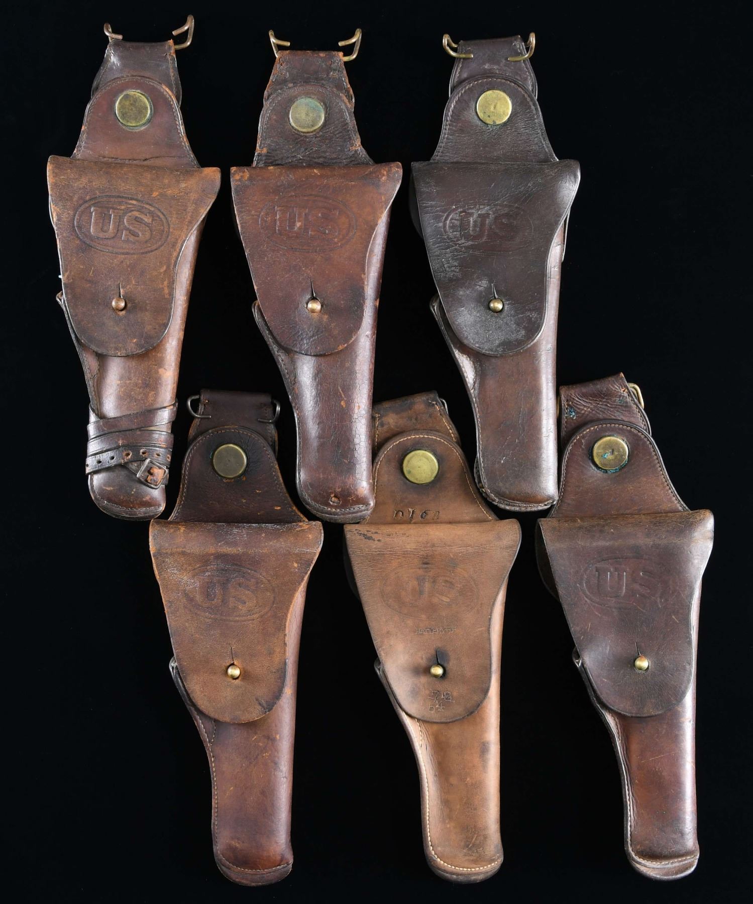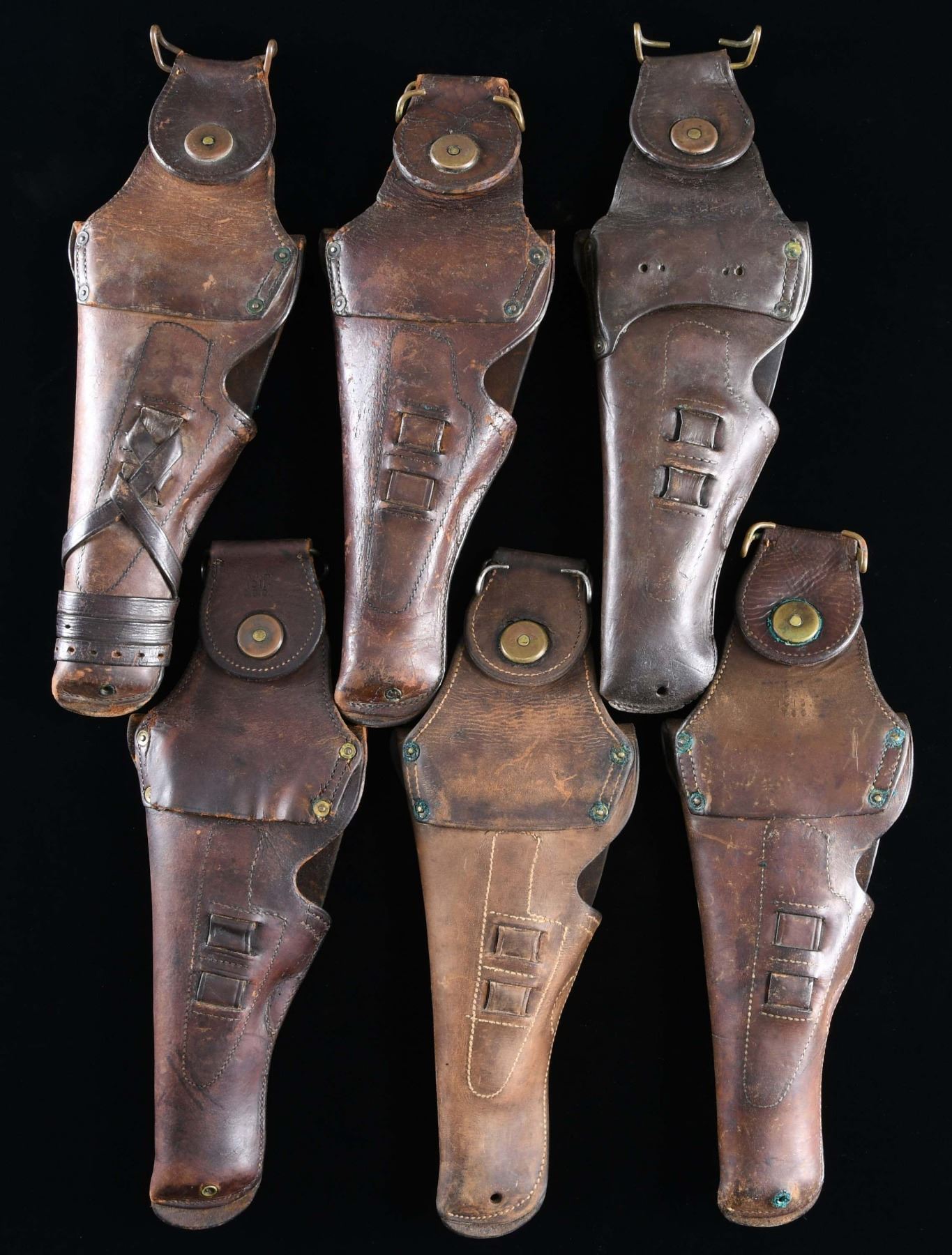 HOLSTERS. Lot of 6 U.S. M1911 Model of 1912 holsters, including: 1) M1911 Model of 1912 holster mfg. by Rock Island Arsenal in 1915. Closure flap is embossed "US" within an oval. Modified hanger with repositioned rivet is marked with a partially discernible "ROCK ISLAND/ ARSENAL/ 1915./ T.C.C." on the rear. Rear of hanger exhibits 4 purposefully made holes. Brown leather construction, with brass fittings. CONDITION: leather remains mostly malleable (some stiffening), exhibiting scattered marks from handling and storage, with varying degrees of age related cracking present overall. Brass fittings retain a pleasing mellow patina, with some spots of verdigris. 2) Early M1911 Model of 1912 holster mfg. by Rock Island Arsenal in 1911. The closure flap is embossed "US" within an oval, with an "H.F.D." marked above what appears to be "60.G.A.C." on the interior. Hanger swivel is marked "R.I.A./ 1911./ T.C.C." on the rear. Brown leather construction, with brass fittings and steel belt hook. CONDITION: leather remains malleable, exhibiting marks from handling and storage, with varying degrees of age related cracking and crazing present overall. Rear of hanger exhibits a large tear at the rivets on the left side, with a small small tear present on the right. Brass fittings retain a pleasing mellow patina, with the belt hook retaining a gray patina. 3) M1911 Model of 1912 holster mfg. by Rock Island Arsenal in 1914. Closure flap is embossed "US" within an oval. Mfg. marking on rear of hanger is illegible, with "1914./ T.C.C." marked below. Rear of hanger swivel appears to be marked "G.H.E.". Brown leather construction, with brass fittings. Complete with leg strap. CONDITION: leather remains malleable, exhibiting some marks from handling and storage, with varying degrees of age related cracking and crazing present overall. Leg strap is torn at the end. Brass fittings retain a pleasing mellow patina, with some spots of verdigris. 4) M1911 Model of 1912 holster mfg. by Rock Island Arsenal in 1915. Closure flap is embossed "US" within an oval. Rear of hanger is marked "ROCK ISLAND/ ARSENAL/ 1915./ T.C.C.". Brown leather construction, with brass fittings. CONDITION: leather remains malleable, exhibiting scattered marks from handling and storage, with areas of light to mild age related cracking and crazing present overall. Brass fittings retain a pleasing mellow patina, with scattered spots of verdigris. 5) M1911 Model of 1912 holster produced by an unknown mfg. Closure flap is embossed with "US" within an oval. Rear of hanger and hanger swivel bear no discernible markings. Brown leather construction, with brass fittings. CONDITION: leather remains malleable, exhibiting scattered marks from handling and storage, with varying degrees of age related cracking and crazing present overall. Hanger exhibits a small tear on either side. Brass fittings retain a pleasing mellow patina, with scattered spots of verdigris. 6) M1911 Model of 1912 holster produced by an unknown mfg. Closure flap is embossed with "US" within an oval, above BATTERY D" and "78/ 54". Front of hanger appears to be marked "D168", with no discernible markings present on the rear. Brown leather construction, with brass fittings and steel belt hook. CONDITION: leather remains malleable, exhibiting scattered marks from handling and storage, with light to mild age related cracking and crazing present overall. Brass swivel appears to have been cleaned at one time, with remaining brass fittings retaining a pleasing mellow patina. Steel belt hook retains a gray patina. (02-24271-5/MLW). $800-1,200.