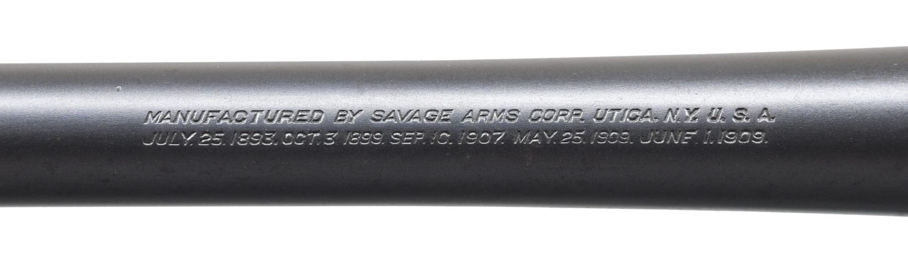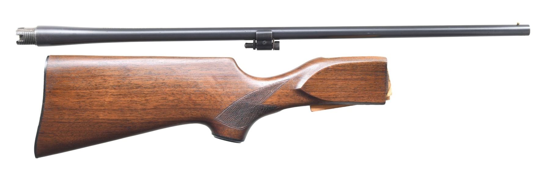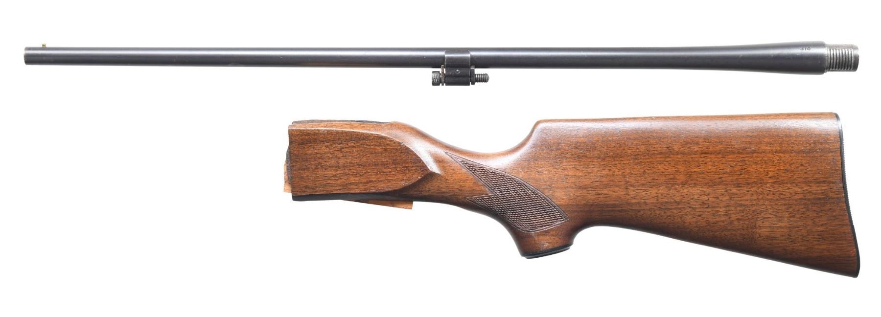 RIFLE STOCK. Lot consists of: (1.) .410 GA, 2 1/2" featherweight shotgun bbl. adapted for Model 99-F and Model 99-G takedown rifles. Length 24" with brass front bead. Bbl. was supplied in a combination kit or sold separately circa. 1922-1934. CONDITION: 80% lightly faded blue showing spots of corrosion and slight muzzle wear. Good bright bore. (2.) Savage Model 99-EG checkered walnut rifle stock with original grooved steel buttplate and checkered plastic grip cap. The EG solid frame rifle was introduced in 1935 and discontinued in 1960. Wood separation block in stock shows a 1950 date. CONDITION: stock appears to be unused showing scattered small handling marks. (02-24462-6/DS). $300-600.