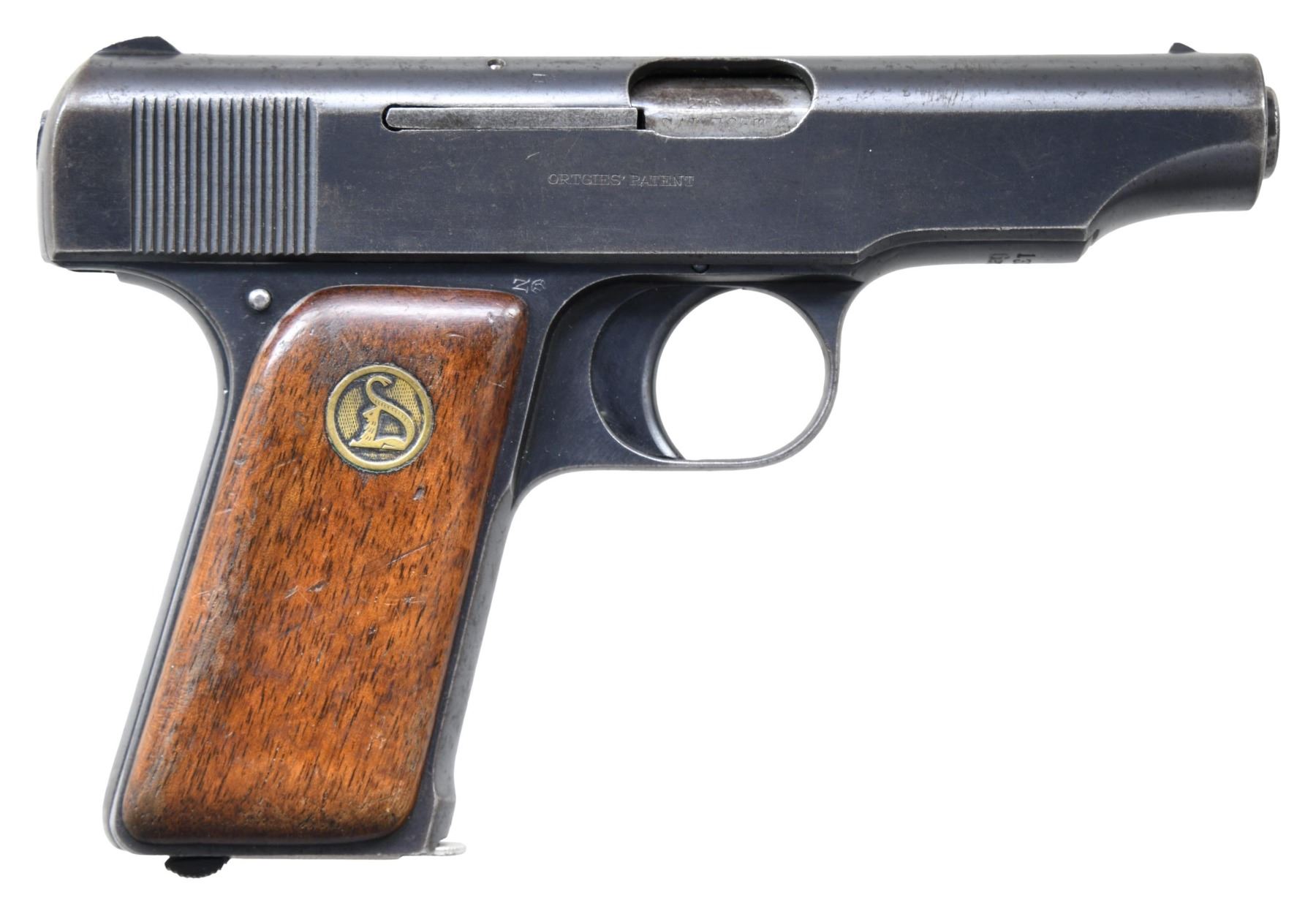 Cal. 7.65mm. S# 130924. Bbl. 3 1/4". Ortgies semi-automatic pistol mfg. by Deutsche Werke. Left side of the slide is marked "DEUTSCHE WERKE (DEUTSCHE WERKE LOGO) WERK ERFURT", with "ORTGIES' PATENT" marked on the right. Right side of the frame, slide, and bbl. exhibit a Crown/N commercial nitro proof. Metal components exhibit a blue finish overall, save for on the bbl., which is polished in-the-white. Frame is mounted with 2-piece Deutsche Werke logo medallion smooth wood grips. All serialized parts are matching and include the frame, slide (interior), and bbl. (left). MAGS: 1 plated 8-rd. CONDITION: metal components retain large amounts of their original factory blue finish, exhibiting areas of wear and thinning that show through to gray and brown patinas, scattered superficial handling marks, as well as scattered spots of light to mild surface oxidation and pitting overall. Bright bore, exhibiting consistent light to mild pitting and a bulge towards the center, while retaining strong rifling throughout. Grips show scattered marks and minor impressions from handling and storage, but otherwise remain sturdy and serviceable. (25-2367/MLW). CURIO. $200-300.