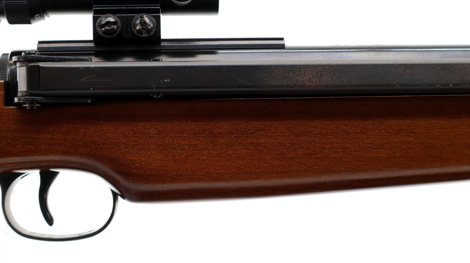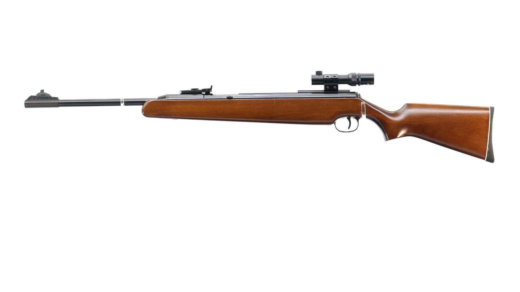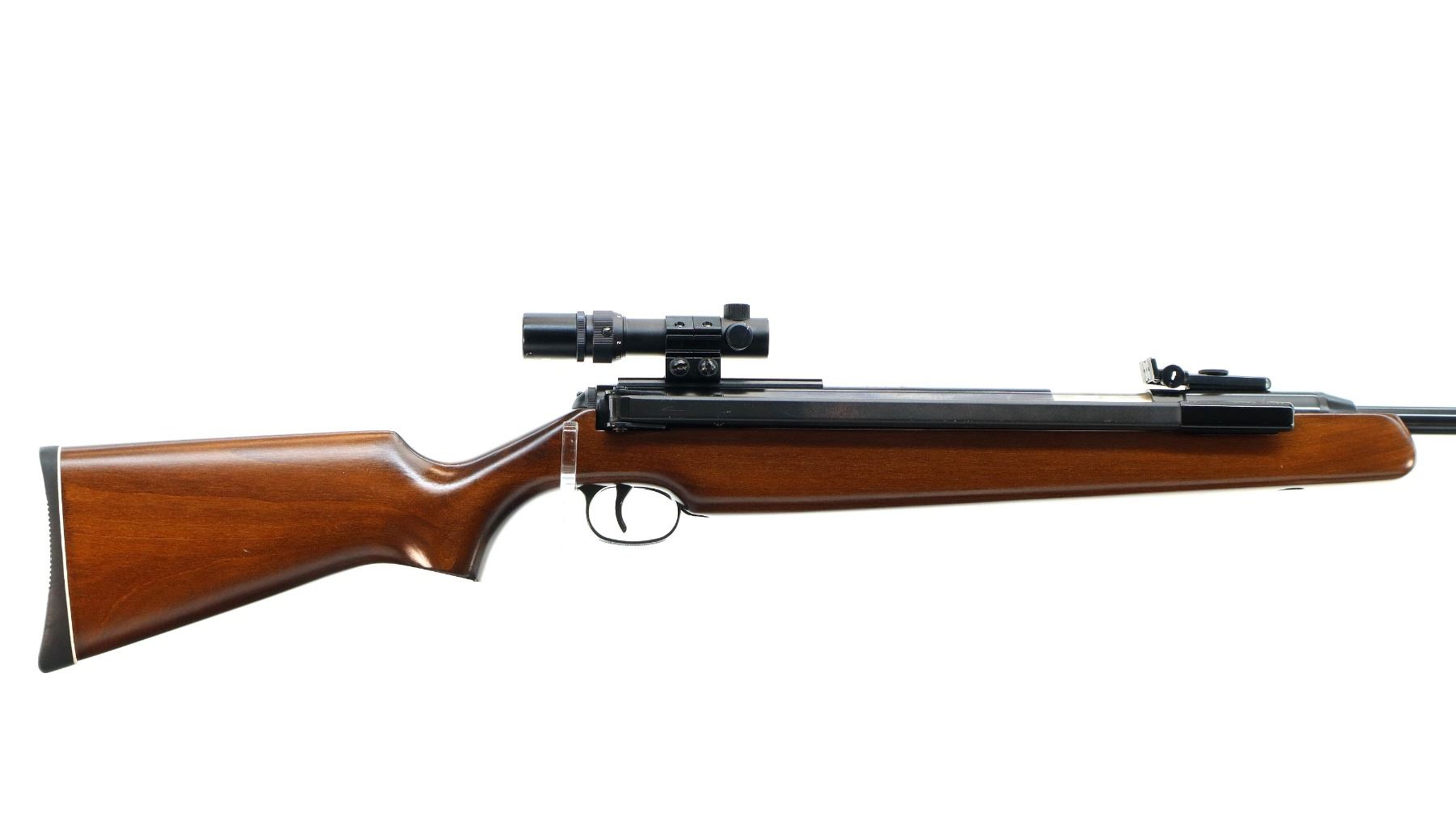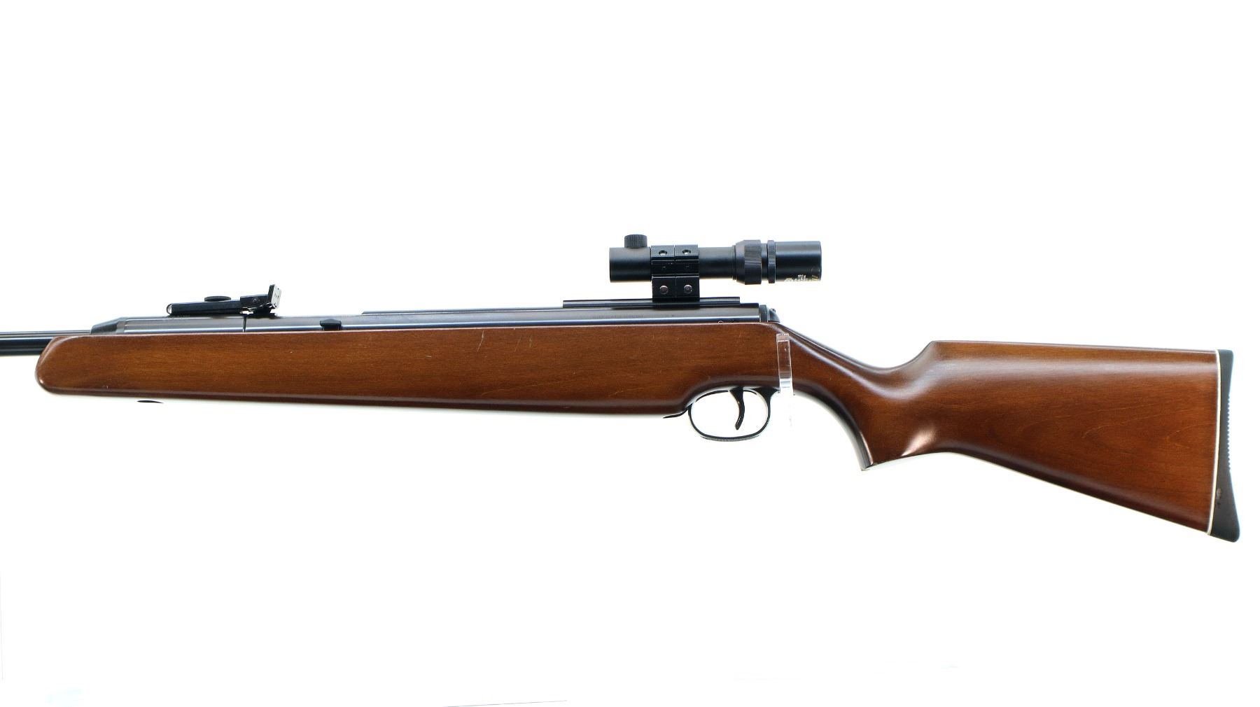 Main Description: Blade front sight with adjustable ramp, adjustable u notched rear sight, blued finish, right side cocking lever, receiver has a one piece scope base and Ruko 1.5-4 x 16 scope installed, clear optics with duplex crosshair. One piece wood stock, pistol grip, grooved black rubber recoil pad.