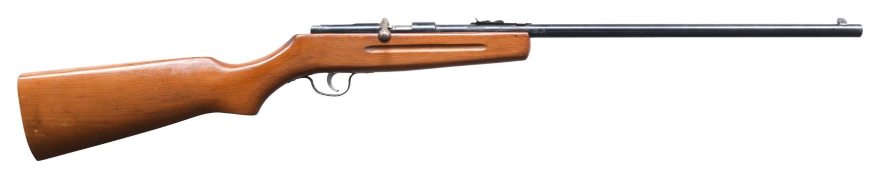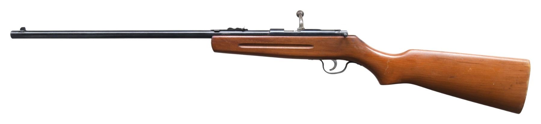 Cal. 22 LR. S# 3005. Bbl. 20". Blade front sight. Adjustable sporting style rear sight. Japanese made single shot bolt action rifle. Blued finish. Hardwood stock. CONDITION: stock shows scattered flaking, dings, scratches & handling wear. Metal retains 85% blue with scattered oxidation & some edge wear. Action functions properly when hand cycled. Very good bore. (25-2043/MJC). MODERN. $75-150.