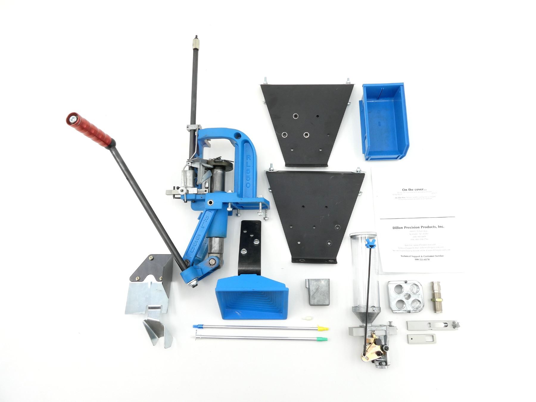 LOT INCLUDES; (1) DILLON RL550 PRESS WITH (1) INSTRUCTION MANUAL, (1) POWDER MEASURE, (1) POWDER BAR WITH SPACER, (1) STAND FOR PRESS, (1)BLUE PLASTIC CARTRIDGE BIN, (1) #1 SHELL PLATE (INSTALLED), (1) POWDER DIE, (1) TOOL HEAD, ETC., CONSIGNOR STATES: "COMPLETE RELOAD PRESS", MAY REQUIRE ADJUSTMENTS AND/OR MAY NOT BE COMPLETE. SEE PHOTOS.