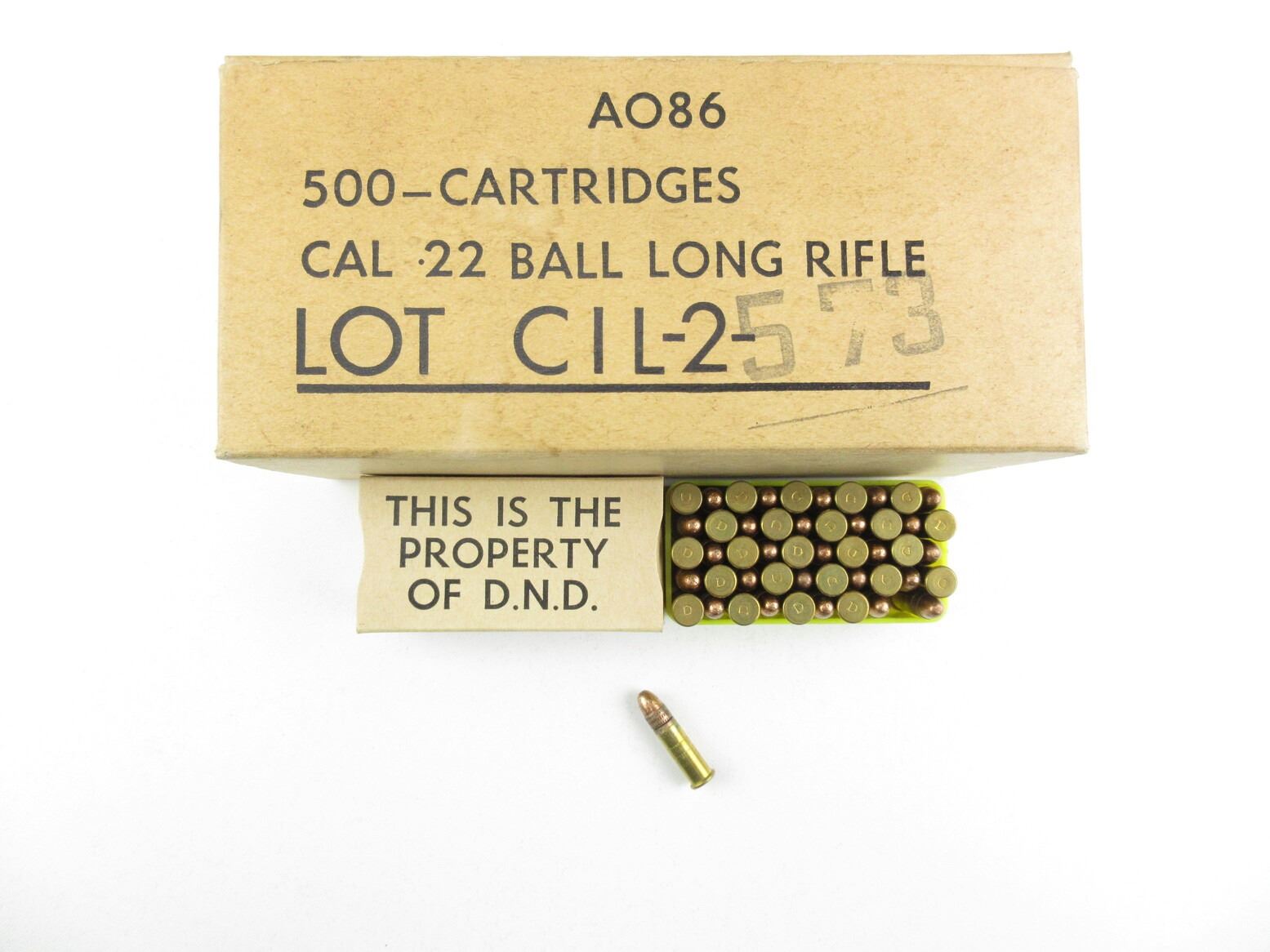 DOMINION .22 BALL LONG RIFLE AMMO LOT. LOT INCLUDES; 500 RNDS, MARKED PROPERTY OF D.N.D., LOT CIL-2-5 73.