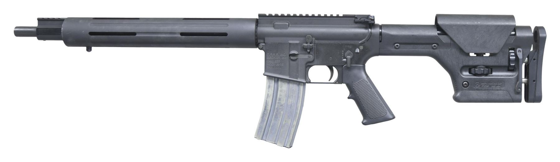 Cal. 223 Rem. S# 13864. Bbl. 16" bull profile. Rifle is devoid of sights but upper has full length picatinny rail & JP gas block has short picatinny rail. Black anodized finish with lower having refinish appearance. Magpul PRS stock, A2 style pistol grip & round handguard. MAGS: 1-30 rd. Colt. CONDITION: furniture shows scattered light handling marks. Lower appears refinished over light pitting. Other metal parts show some light handling & edge wear. Action functions properly when hand cycled. Bright near excellent bore. (25-2328/MJC). MODERN. $600-900.