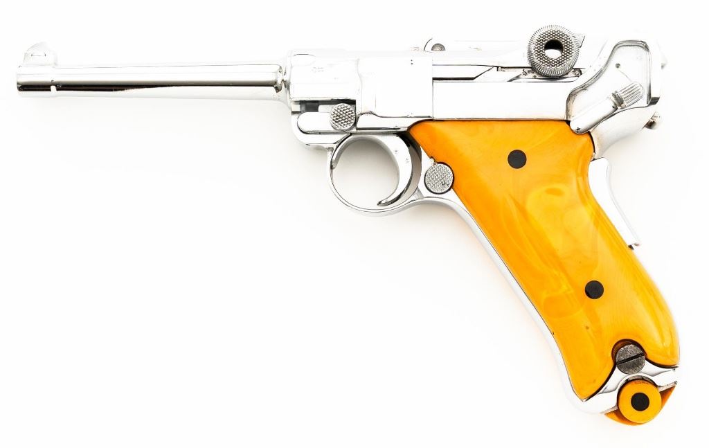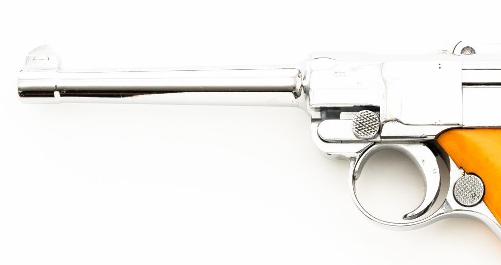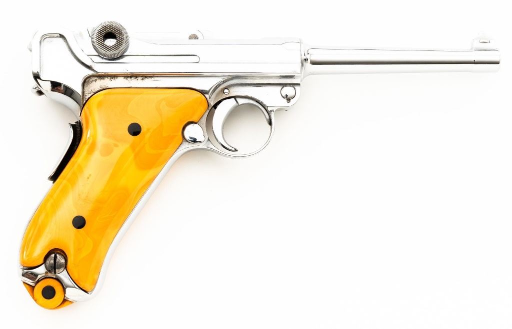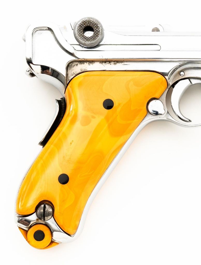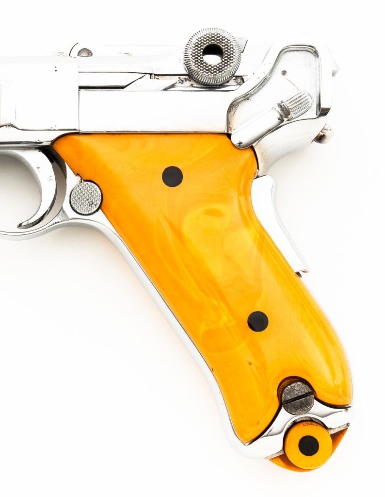 DWM 1906 American Eagle Luger Semi-Automatic Pistol, #66937, 4.75"barrel, .30 Luger cal., chrome finish, mottled yellow/orange plastic grips with two brown dots, dovetailed blade front sight, and fixed rear sight with "V"-notched groove. Includes one unmarked bright steel magazine. Original base has been replaced with a yellow Bakelite base with a brown dot on each side. Pistol is marked "DWM" on the rear toggle, and a very faint "(U.S. eagle)" on top of the chamber. There are "(crown)N" proof marks on the barrel, left side of the receiver, and front and rear toggle links. Front of the frame is marked "GERMANY". Condition overall is very good as refinished. New chrome finish was applied over areas of light old pitting that is visible on both sides of the frame, trigger, and magazine release. Grips are in fine condition, very light scratches and handling marks. Action operates smoothly. Bore is bright with very good rifling. Est.: $500-$800. (C&R/PPT)
