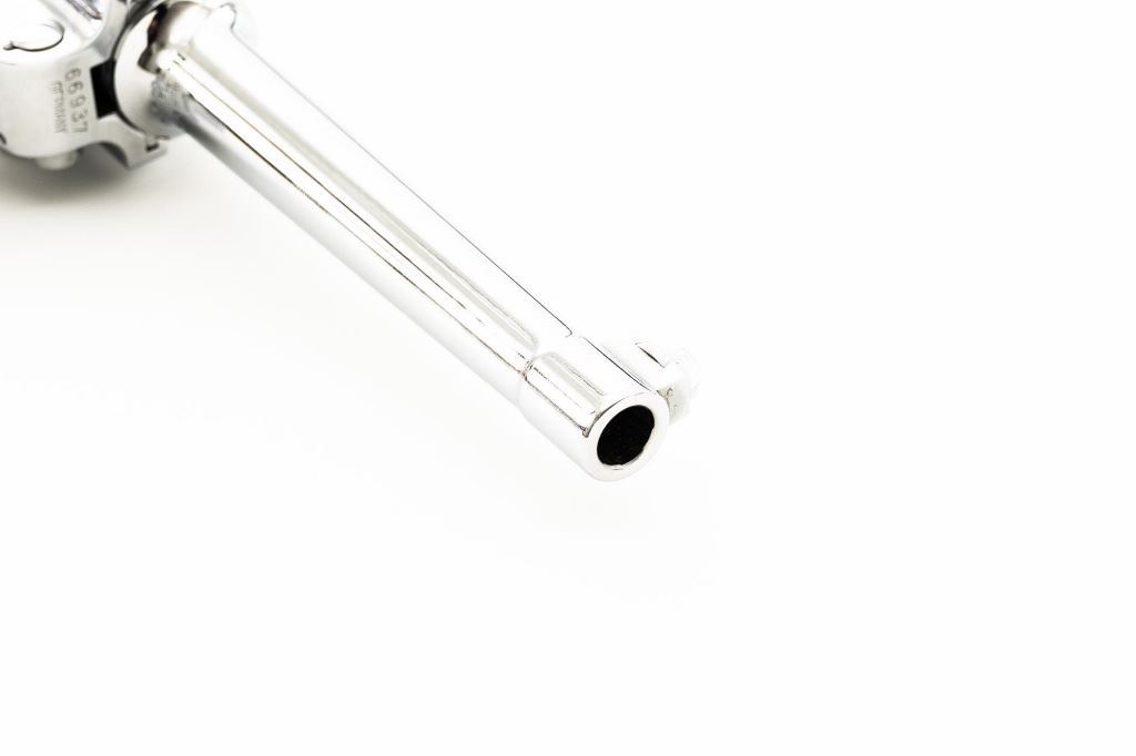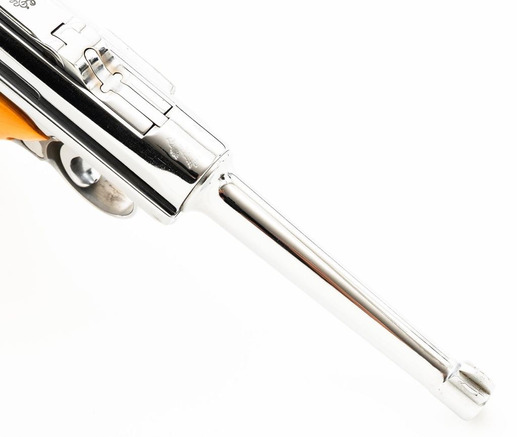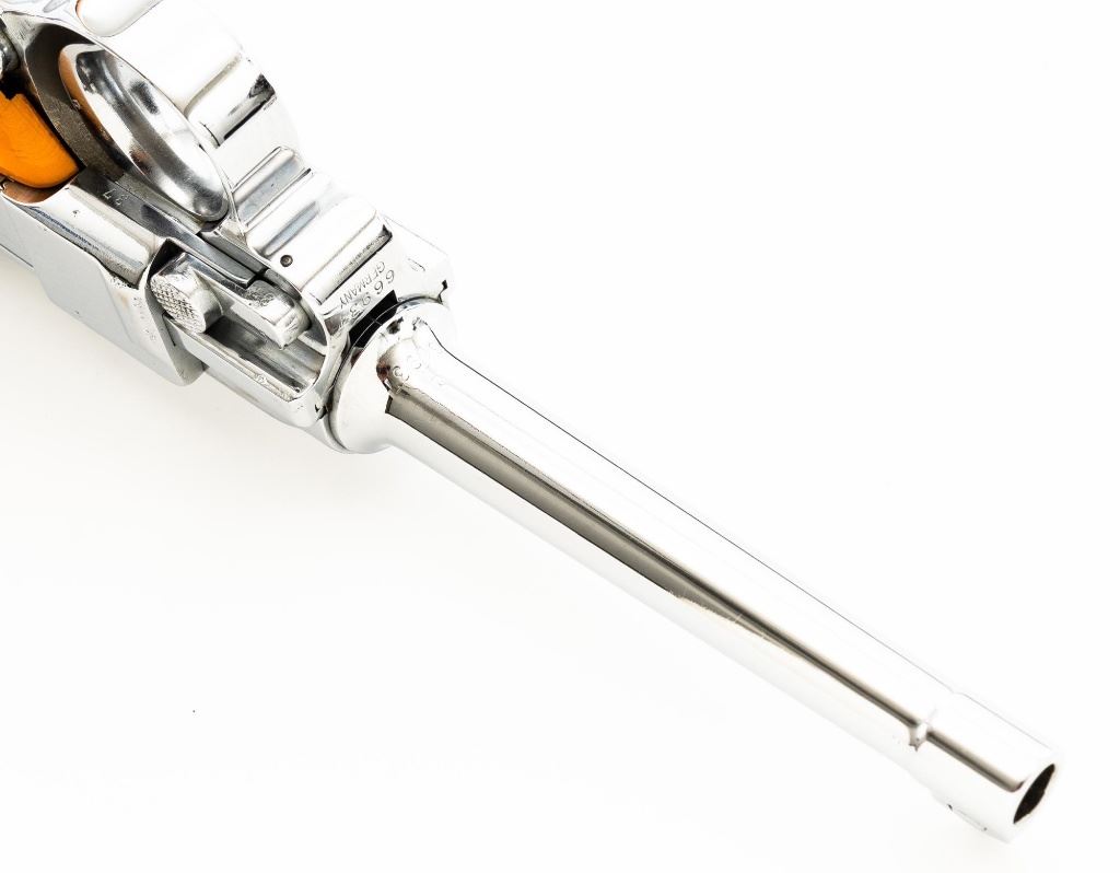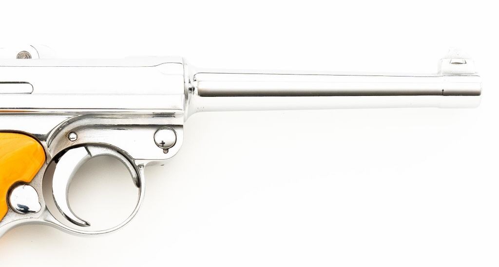 DWM 1906 American Eagle Luger Semi-Automatic Pistol, #66937, 4.75"barrel, .30 Luger cal., chrome finish, mottled yellow/orange plastic grips with two brown dots, dovetailed blade front sight, and fixed rear sight with "V"-notched groove. Includes one unmarked bright steel magazine. Original base has been replaced with a yellow Bakelite base with a brown dot on each side. Pistol is marked "DWM" on the rear toggle, and a very faint "(U.S. eagle)" on top of the chamber. There are "(crown)N" proof marks on the barrel, left side of the receiver, and front and rear toggle links. Front of the frame is marked "GERMANY". Condition overall is very good as refinished. New chrome finish was applied over areas of light old pitting that is visible on both sides of the frame, trigger, and magazine release. Grips are in fine condition, very light scratches and handling marks. Action operates smoothly. Bore is bright with very good rifling. Est.: $500-$800. (C&R/PPT)