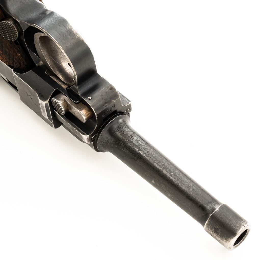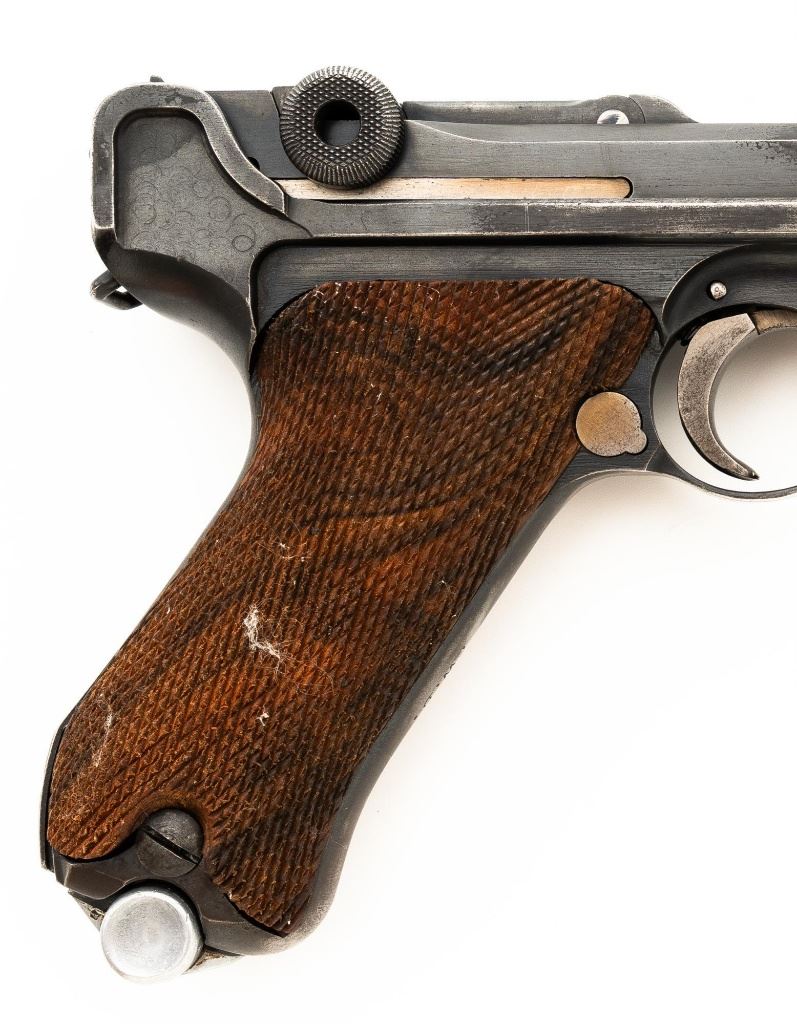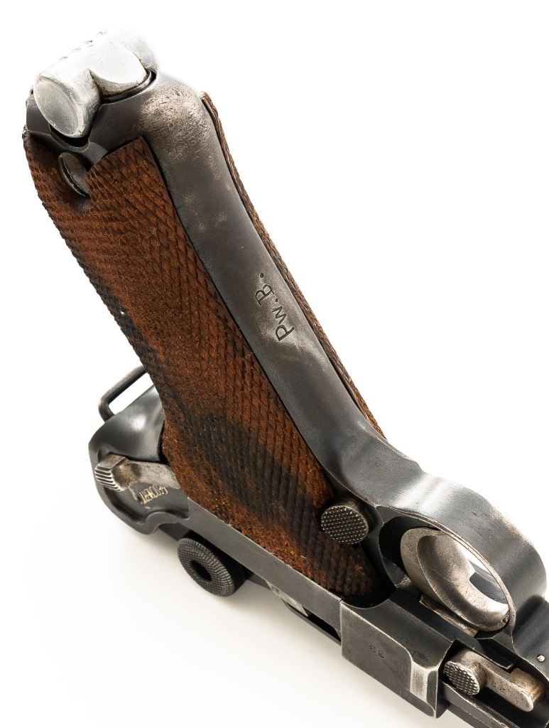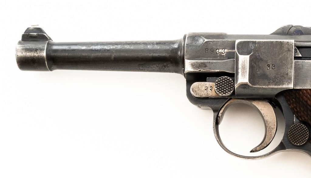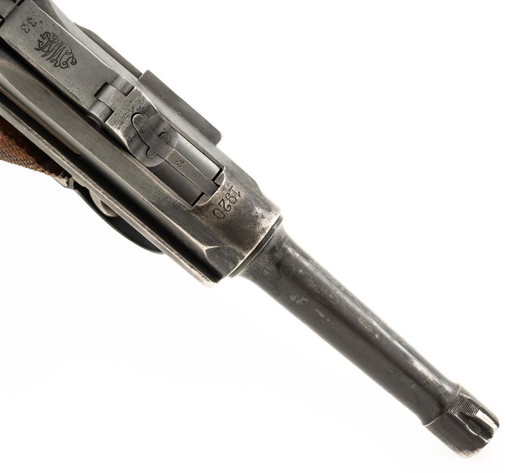 DWM 1920 Bavarian Police Marked Luger Semi-Automatic Pistol, #8933a, 9mm cal., 4" barrel, blue finish, straw colored small parts, checkered replacement wood grips, modified inverted-"V" front sight, fixed rear sight with small "V"-notched groove, with stock lug. Includes one mis-matched blued magazine with aluminum base, marked "2865o / + / (eagle)63". Pistol is marked "DWM" on toggle link with "1920" date on top of chamber. Right side of receiver with three "eagle" proofs, as well as another partially visible on the barrel. Front grip strap with "Pw.B." Bavarian Police markings. All visible numbers matching, except for the magazine and grips. No import marks. Condition is good, retaining approx. 80% blue, showing general thinning and toning, particularly on the barrel and front grip strap. Barrel and sideplate with a mottled appearance and scattered areas of light pitting. Factory lettering is clear. Proof marks show wear and are partially legible. Small parts retain approx. 30% thinning straw colors. Grips are excellent with sharp checkering detail. Top edge of the front sight has been reshaped, now with a thin profile. Action and hold open function properly. Bore is primarily bright with only trace amounts of visible frosting and very good rifling. Magazine shows signs of moderate age and finish wear. Est.: $800-$1,200. (C&R/PPT)