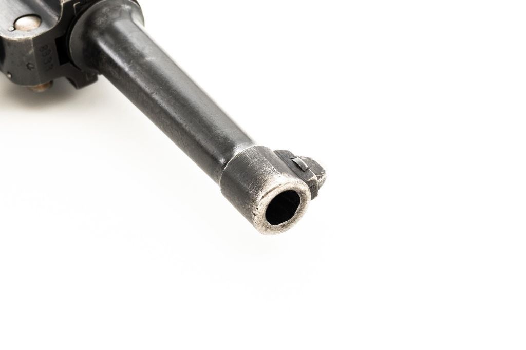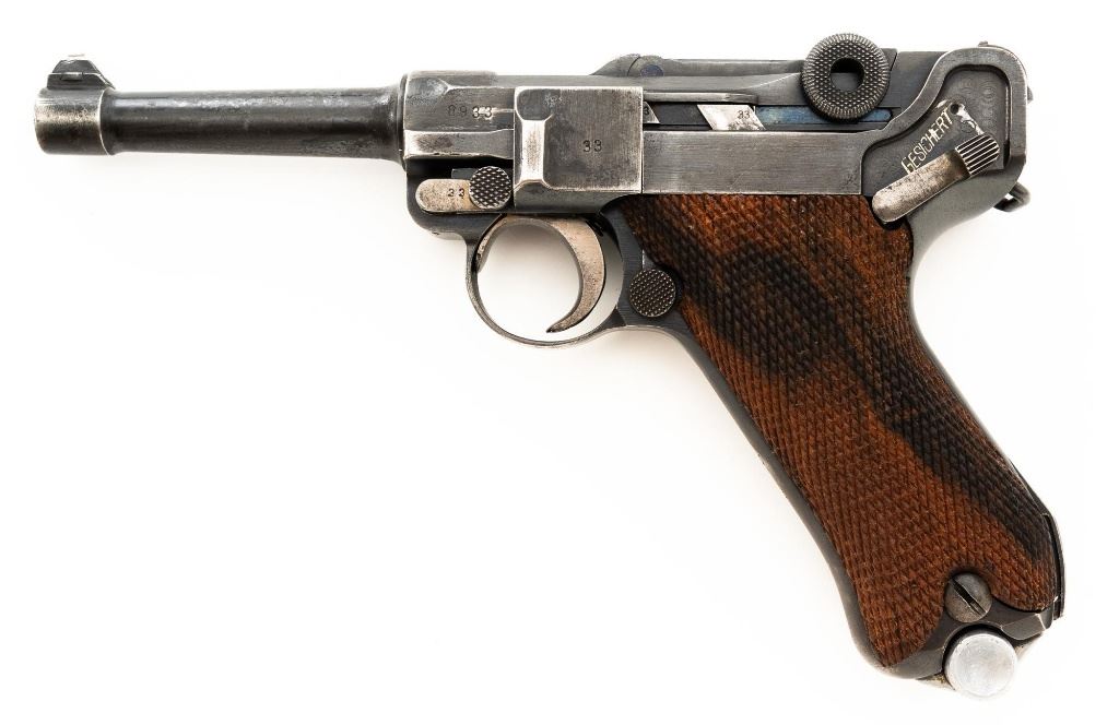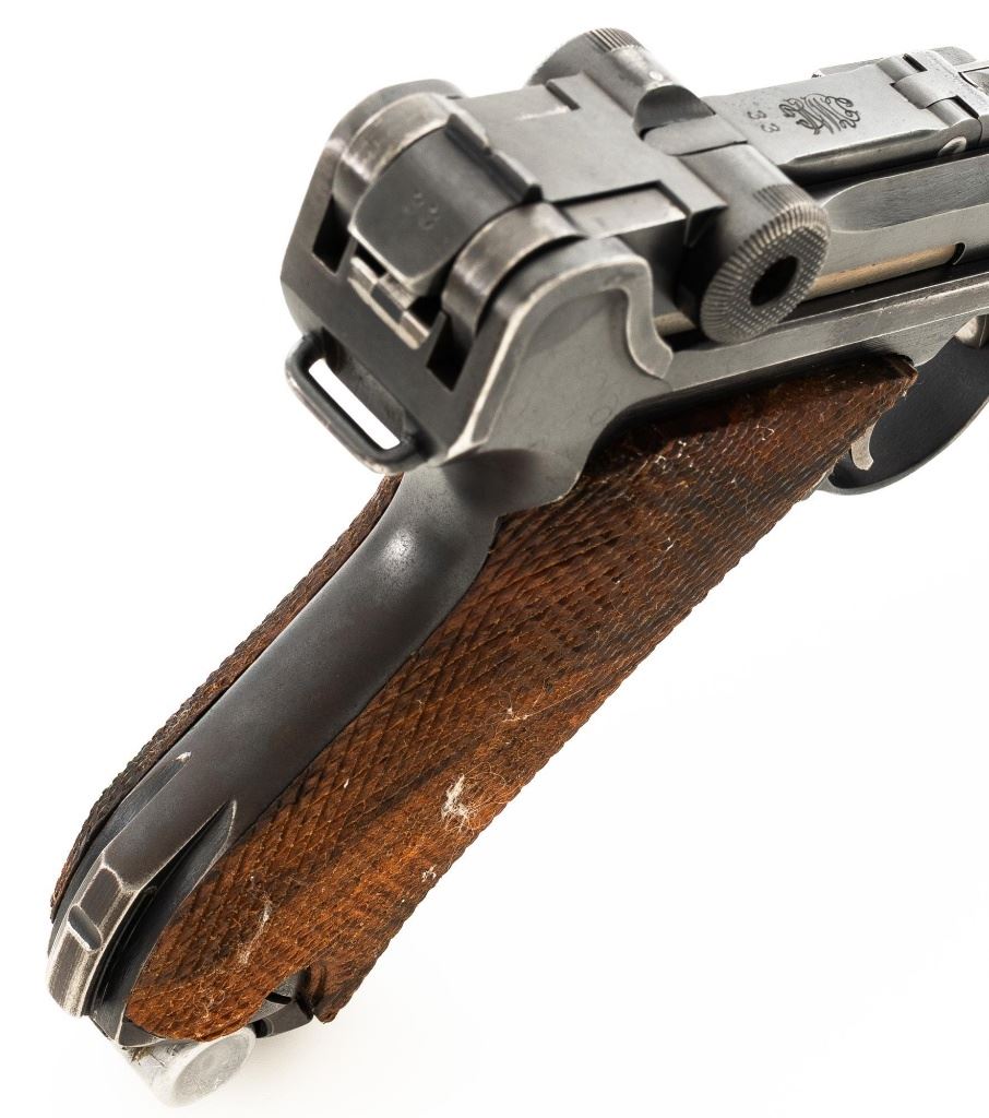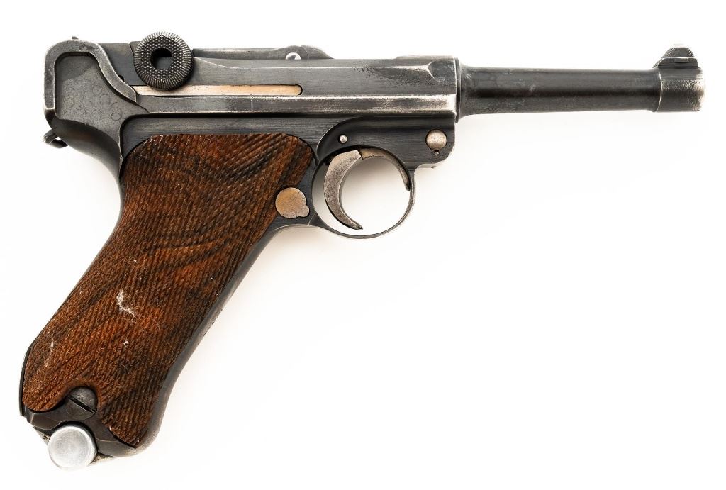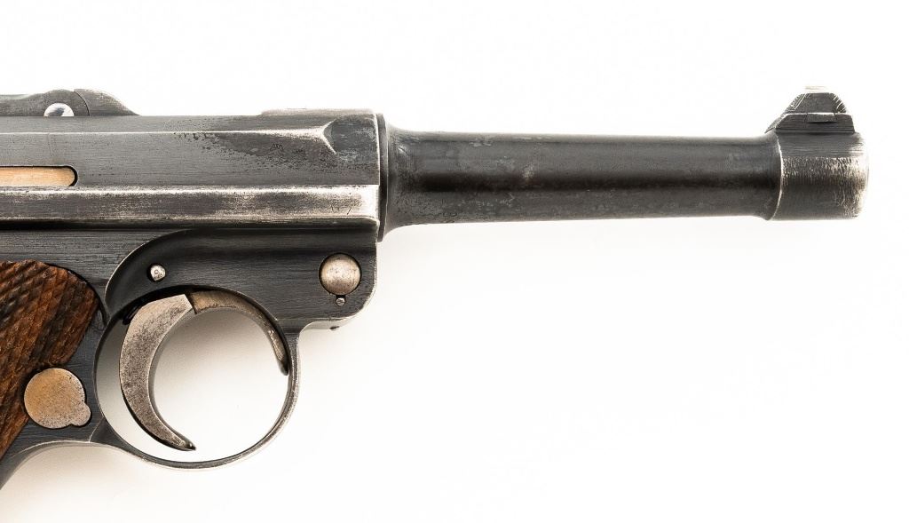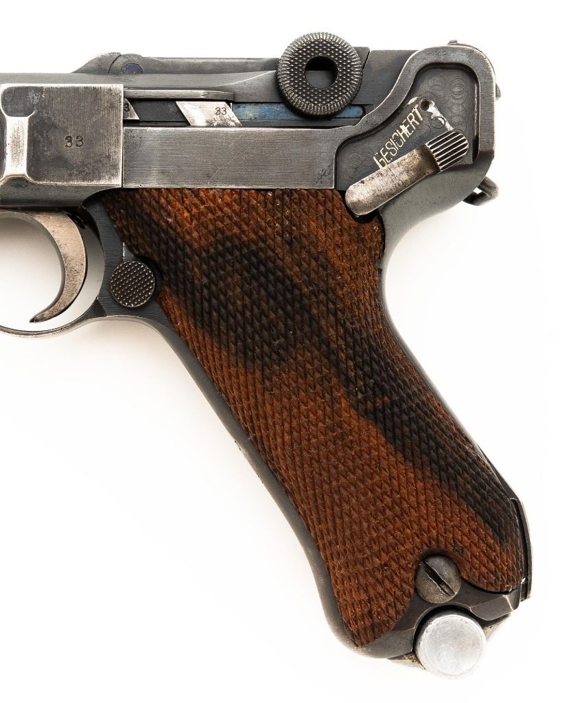 DWM 1920 Bavarian Police Marked Luger Semi-Automatic Pistol, #8933a, 9mm cal., 4" barrel, blue finish, straw colored small parts, checkered replacement wood grips, modified inverted-"V" front sight, fixed rear sight with small "V"-notched groove, with stock lug. Includes one mis-matched blued magazine with aluminum base, marked "2865o / + / (eagle)63". Pistol is marked "DWM" on toggle link with "1920" date on top of chamber. Right side of receiver with three "eagle" proofs, as well as another partially visible on the barrel. Front grip strap with "Pw.B." Bavarian Police markings. All visible numbers matching, except for the magazine and grips. No import marks. Condition is good, retaining approx. 80% blue, showing general thinning and toning, particularly on the barrel and front grip strap. Barrel and sideplate with a mottled appearance and scattered areas of light pitting. Factory lettering is clear. Proof marks show wear and are partially legible. Small parts retain approx. 30% thinning straw colors. Grips are excellent with sharp checkering detail. Top edge of the front sight has been reshaped, now with a thin profile. Action and hold open function properly. Bore is primarily bright with only trace amounts of visible frosting and very good rifling. Magazine shows signs of moderate age and finish wear. Est.: $800-$1,200. (C&R/PPT)