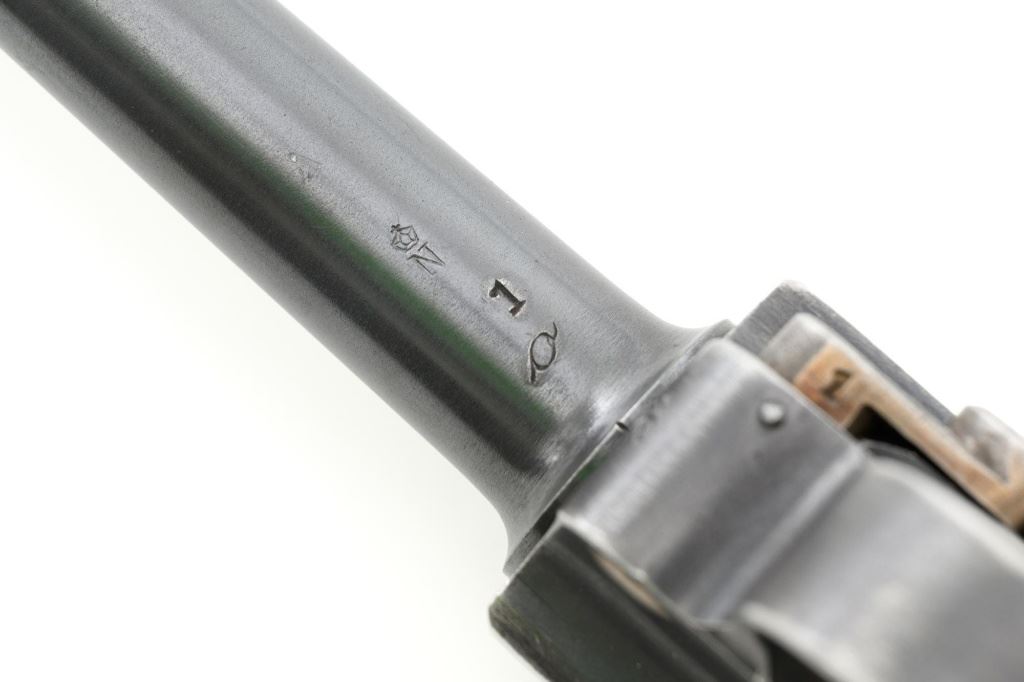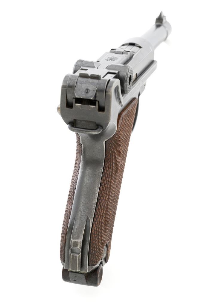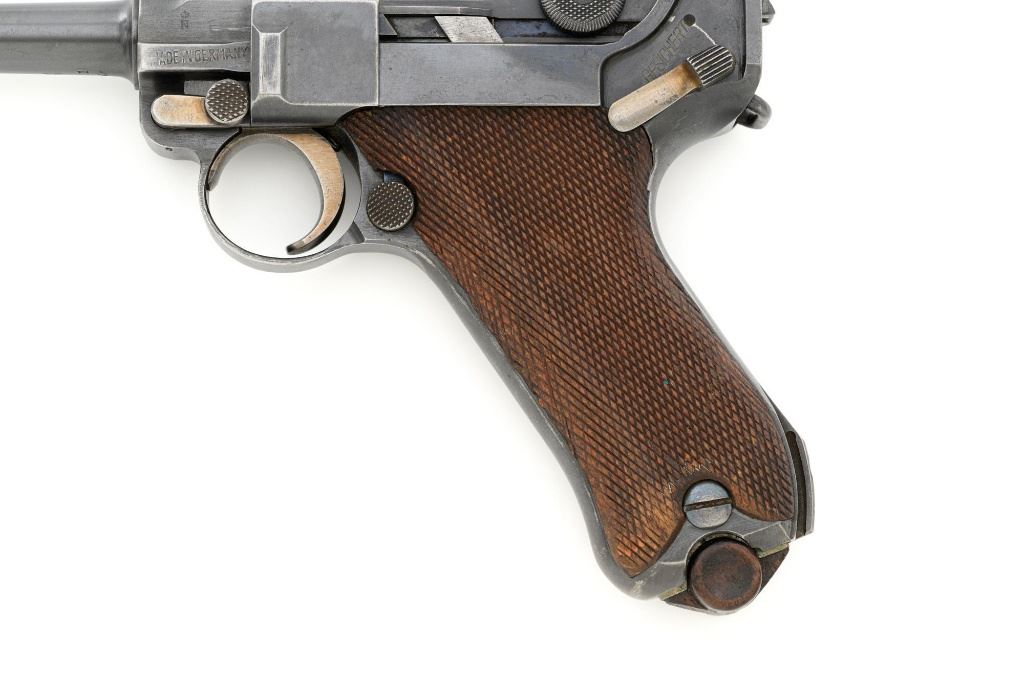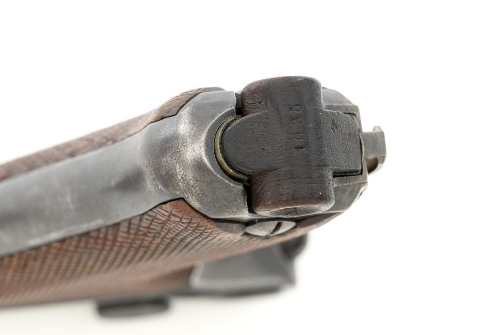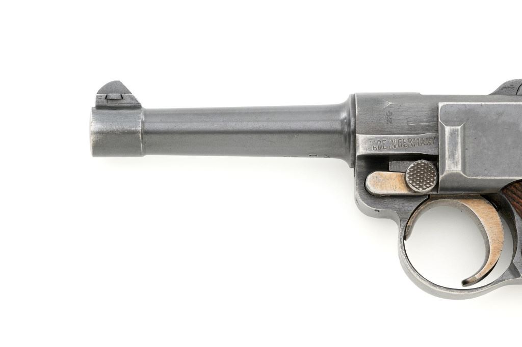 DWM 1920 Commercial Luger Semi-Automatic Pistol, #1o, .30 Luger cal., 3.75" barrel, blued finish, straw colored small parts, checkered walnut grips, inverted-"V" front sight, and fixed rear sight with "V"-notched groove. Includes one mismatched magazine with wood base, numbered "1035". Pistol is marked "DWM" on the toggle. Left side of receiver marked "(crown)N" and "MADE IN GERMANY". Upper safety position is marked "GESICHERT", lower position is blank. Visible matching numbers, grips are not numbered. No import marks. Pistol is in fine overall condition, retaining approx. 85% original blue with wear primarily at high points, front and backstrap. Front and backstrap also display some mild frosting. Straw colors are approx. 80%-85%, showing light thinning and toning. Grips are very good, with areas of moderate flattening of the checkering, primarily around the edges. Action operates smoothly, hold open functions properly. Bore is bright with very good, clearly defined rifling. Magazine body shows yellow toning and mostly mild verdigris, heavier on the left side. An interesting pistol, being the first made in the "o" letter block. Est.: $1,500-$1,800. (C&R/PPT)
