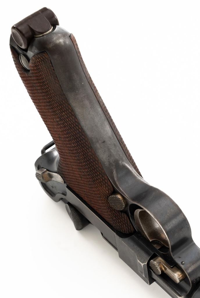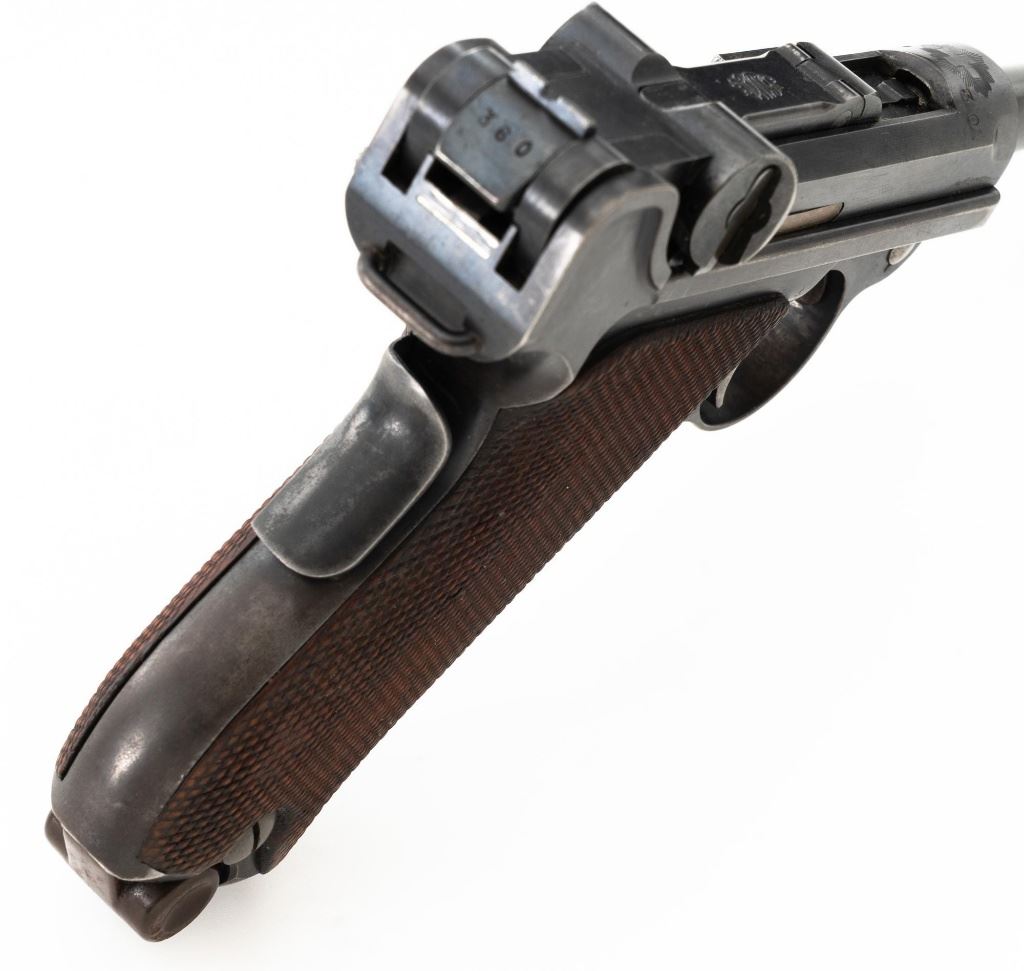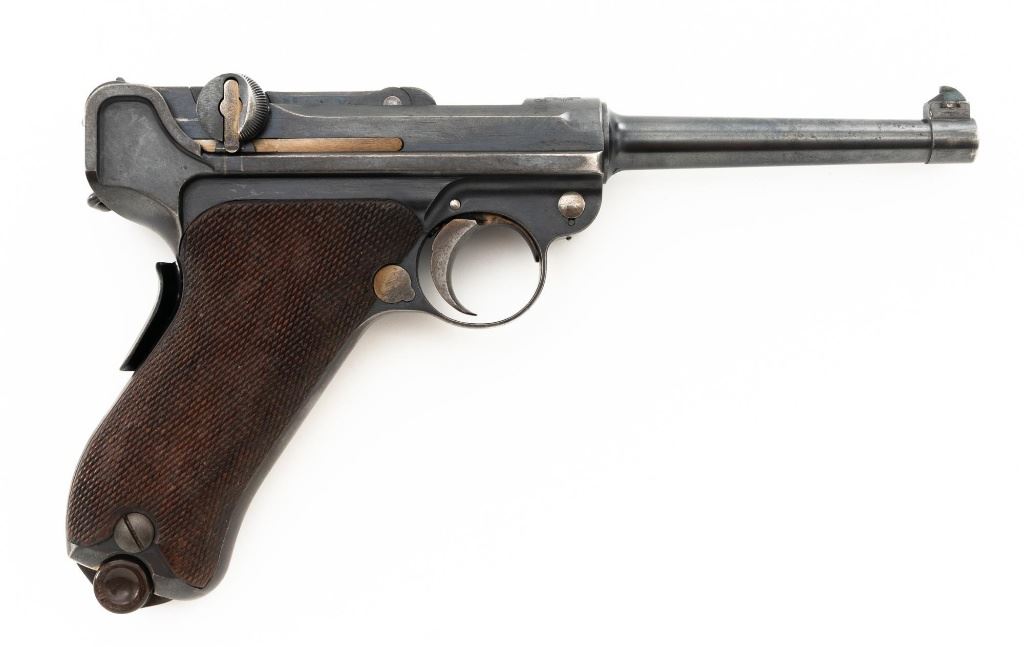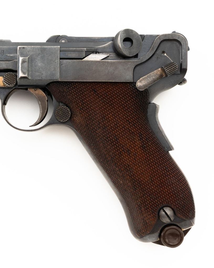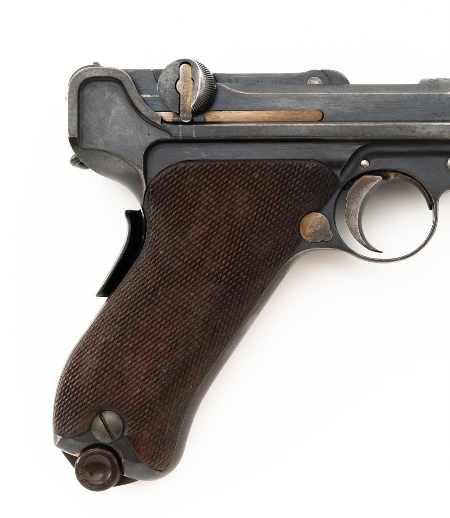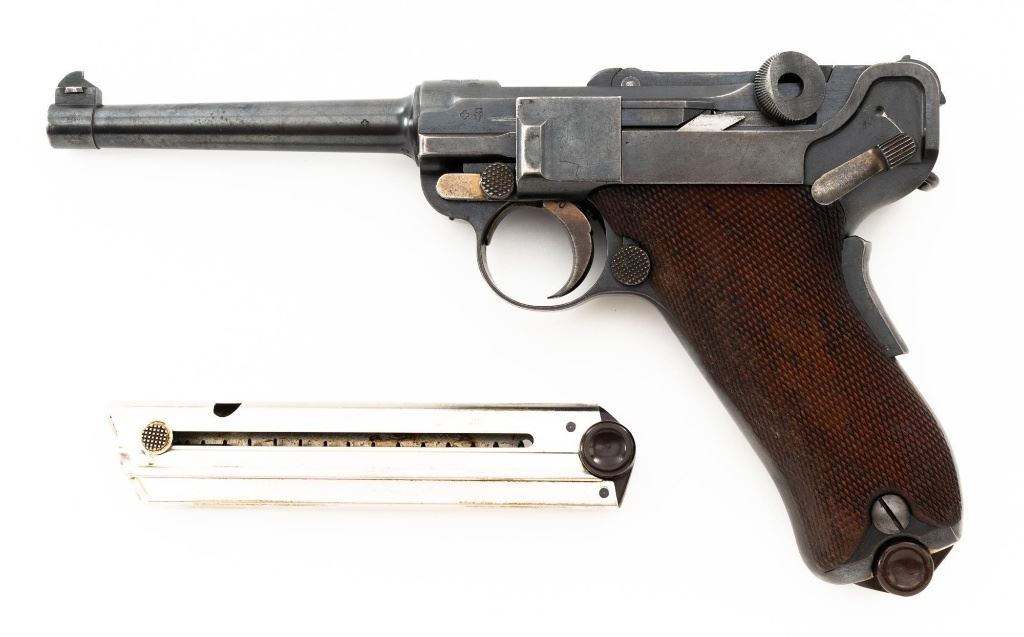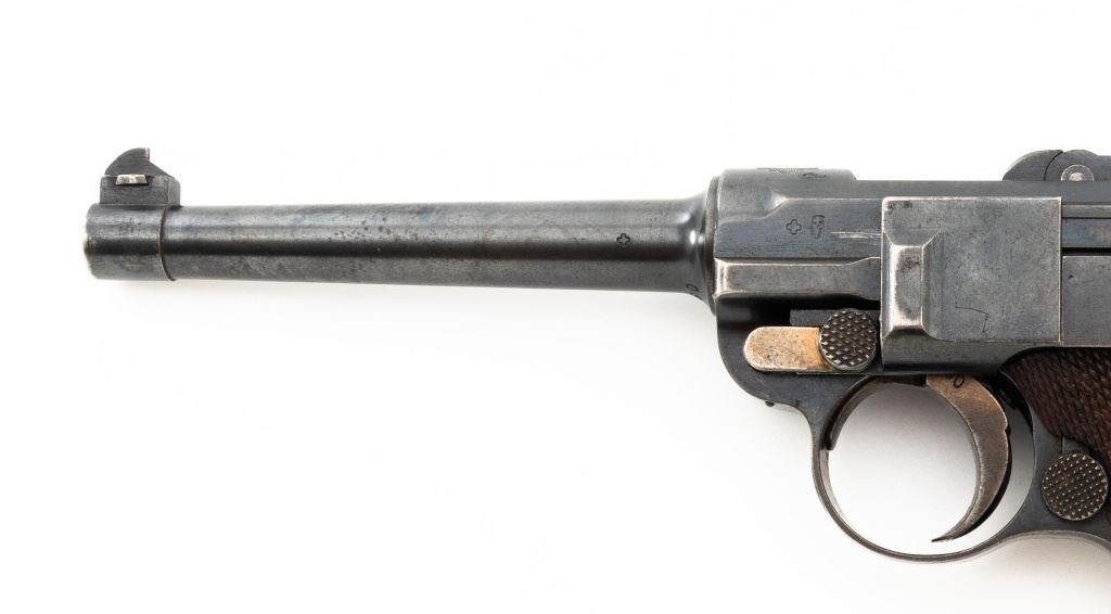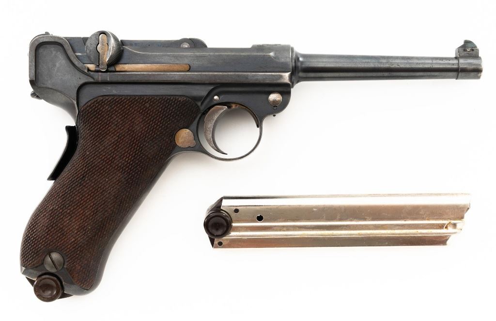 DWM Model 1900 Swiss Contract Military Luger Semi-Automatic Pistol, #4360 .30 Luger cal., 4.75" barrel, blued finish, straw colored small parts, checkered walnut grips, sawtooth blade front sight, fixed rear sight with "U"-notched groove, dished toggle knobs, wide trigger, with grip safety. Includes two (2) nickel plated Swiss magazines, both with brown plastic bases, and small script "P" stamped at base of the spine. Pistol with small "(Swiss cross)" stamp on left side of the barrel and receiver. Left side of the receiver with additional Swiss proof mark for inspector Herr Vogelsang. Marked DWM on the toggle. Chamber is marked with Swiss "(Sunburst)" crest and "P 30" release date. Visible matching numbers, with matching three-digits on the back of each grip. No import marks. Pistol is in very good overall condition, retaining approx. 85% blue, with wear and toning to the front and backstrap, muzzle, and front edges of the frame. Approx. 70%-75% straw colors remain. Factory lettering and proof marks are clear. Grips show moderate handling wear. Action operates smoothly, hold open functions properly. Bore rates near excellent overall and is mirror bright with clearly defined rifling. Est.: $2,000-$3,000. (C&R/PPT)