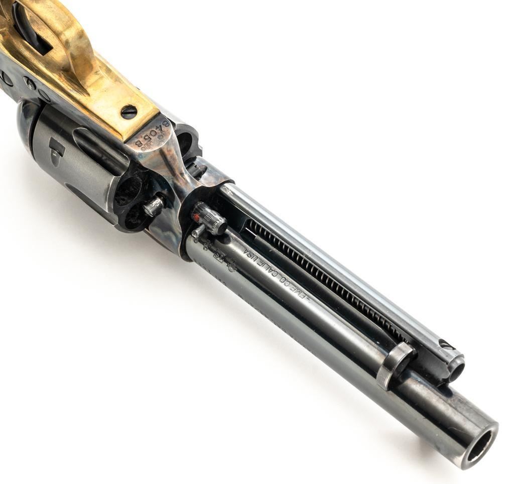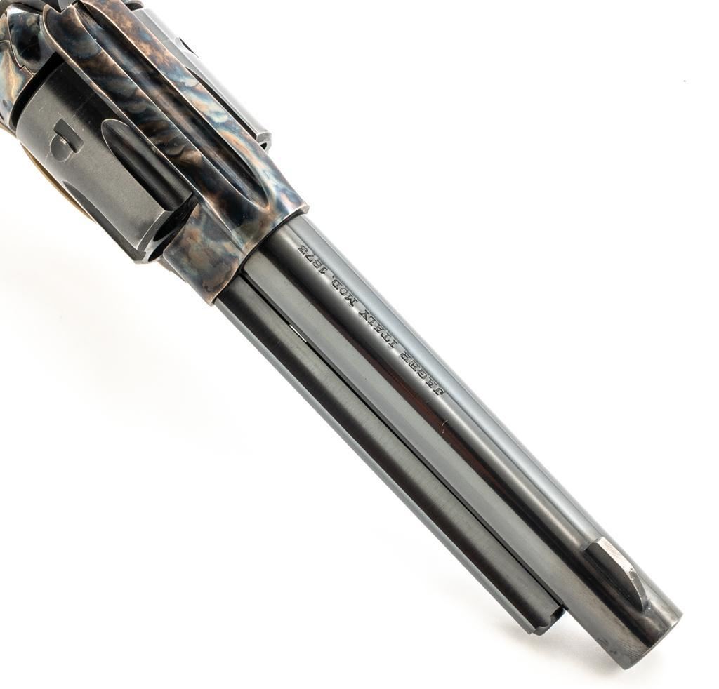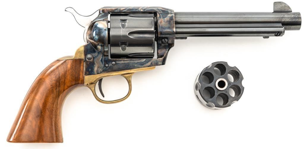 Dakota Model 1873 Single Action Army Revolver with Extra Cylinder, #84058, .44-40 cal., 5.5" barrel, blue and color case hardened finish, smooth walnut two-piece grips, blade front and fixed square notch rear sights, brass straps and trigger guard. Factory markings are clear, with Italian proofs, marked "JAGER ITALY" on top of the barrel and import marked on the underside. Includes an extra .44 cal. blue cylinder with the matching serial number. Revolver is in near excellent overall condition, retaining approx. 96%-97% factory finish, with holster wear at the muzzle. Cylinder shows light leading edgewear and index line. Frame displays vivid color case hardened finish. Grips are near excellent with flea bite indentations and a scratch on the base of the right panel. Action is crisp with good timing. Bright bore rates near excellent with well-defined rifling. Est.: $300-$500. (Modern/PPT)