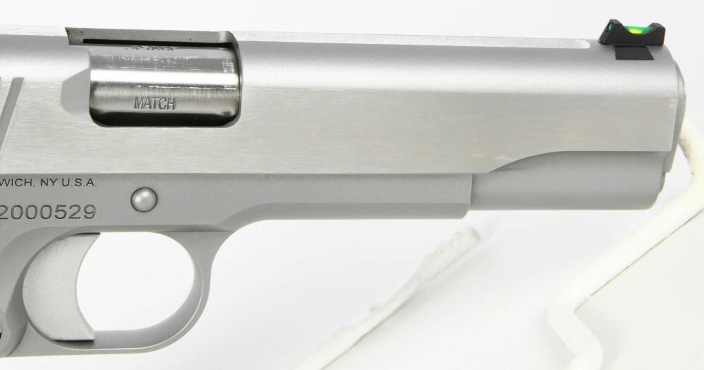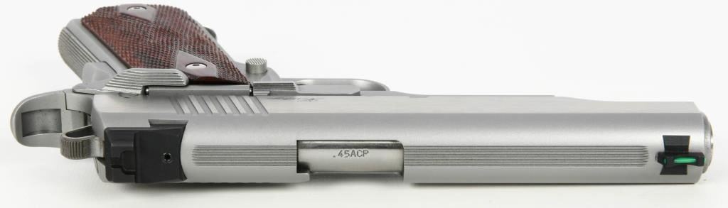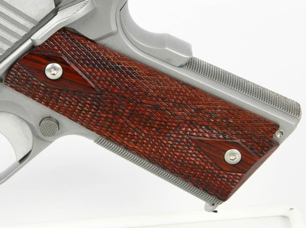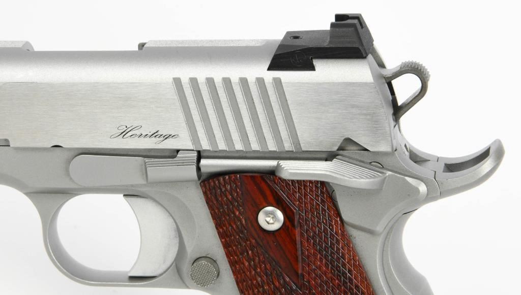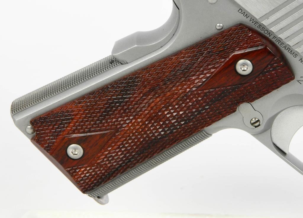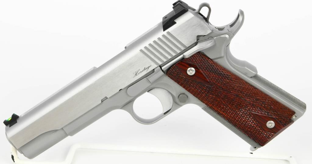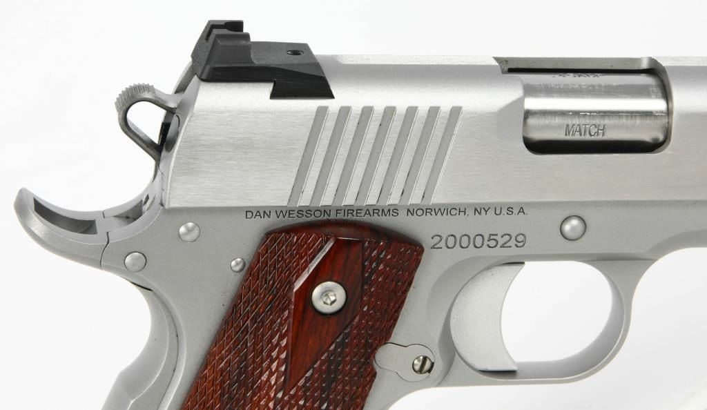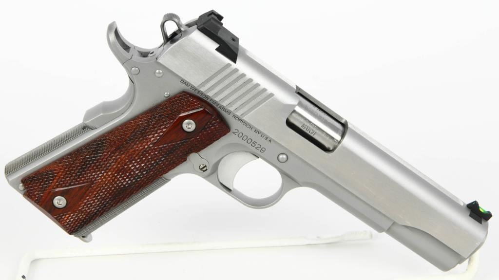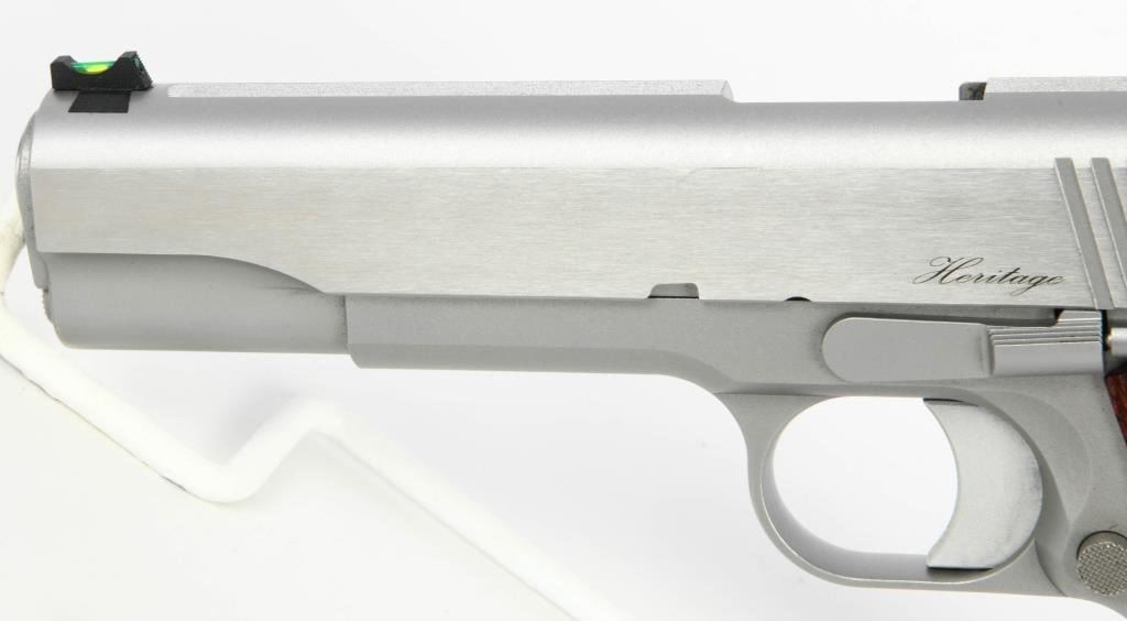 Dan Wesson Heritage Match Stainless 1911: A Fusion of Tradition and Modern Precision Explore the enduring legacy of the Dan Wesson Heritage Match Stainless 1911, a timeless embodiment of the classic Government model 1911 intricately blended with modern styling and precision. This .45 ACP semi-auto pistol, featuring a 5" barrel, seamlessly harmonizes the grace of tradition with contemporary enhancements. The polished flats and bead-blasted finish lend a refined touch to the pistol, enhancing its visual appeal. Complemented by a fiber optic front sight and tactical rear sight, the Heritage Match Stainless ensures clear targeting, with the front sight's bright glow optimizing visibility in daylight. Adorned with cocobolo wood grips, this pistol delivers a comfortable and secure hold. The 25LPI front and backstrap checkering strike a perfect balance, providing a tactile connection without being overly aggressive. As a testament to its enduring design, the Dan Wesson Heritage Match Stainless stands as one of the longest-lived models in the Dan Wesson line, with the 2020 upgrade introducing new features and aesthetics. The 5" match barrel underscores the pistol's accuracy, making it a reliable choice for both enthusiasts and discerning shooters. Equipped with two magazines, the Heritage Match Stainless ensures you are well-prepared for extended shooting sessions. Presented in a factory hardcase, this pistol not only guarantees secure storage but also exudes the dignity it deserves. In essence, the Dan Wesson Heritage Match Stainless 1911 is a harmonious fusion of tradition and innovation?a versatile and distinguished addition to any firearms collection.