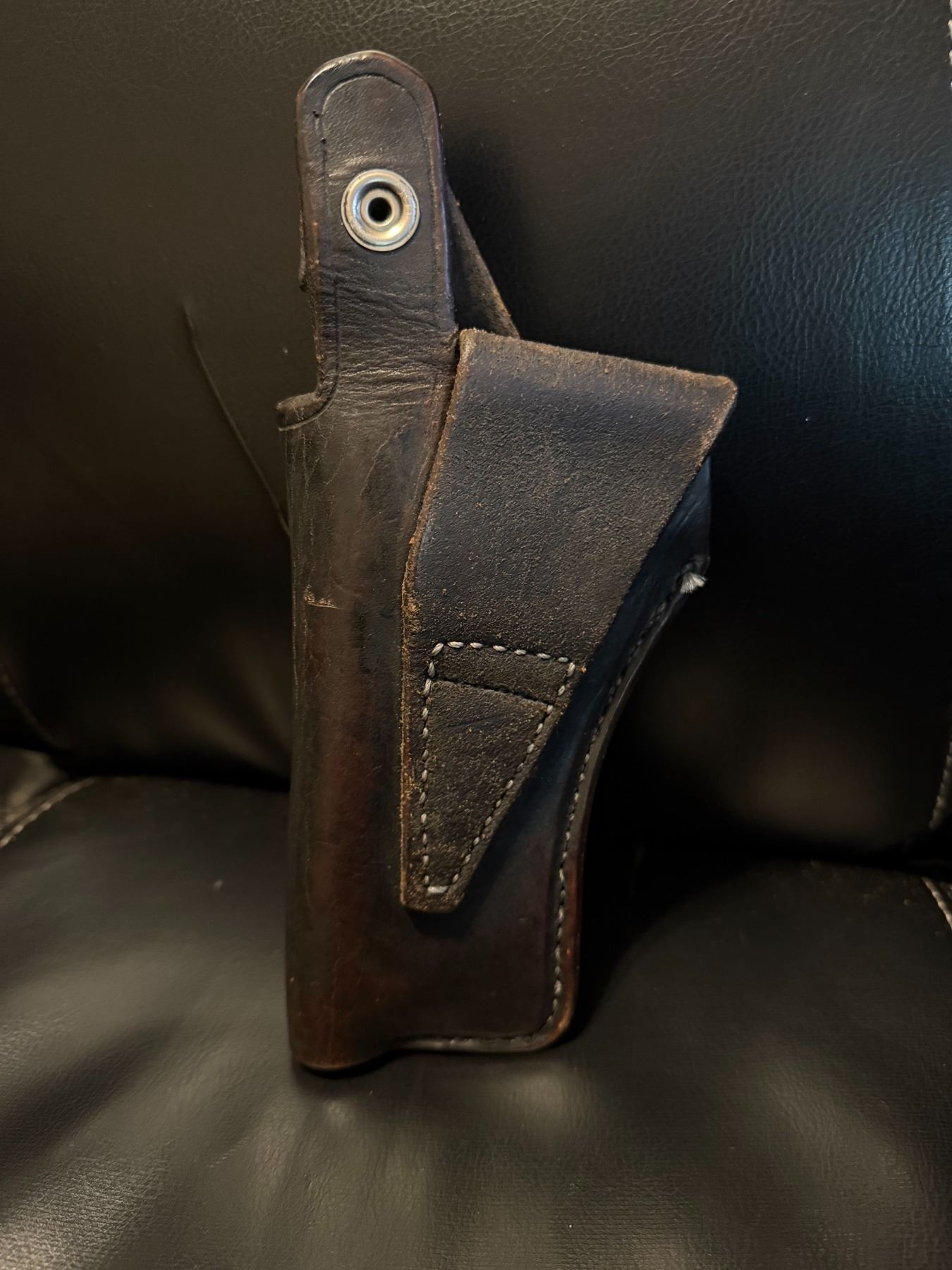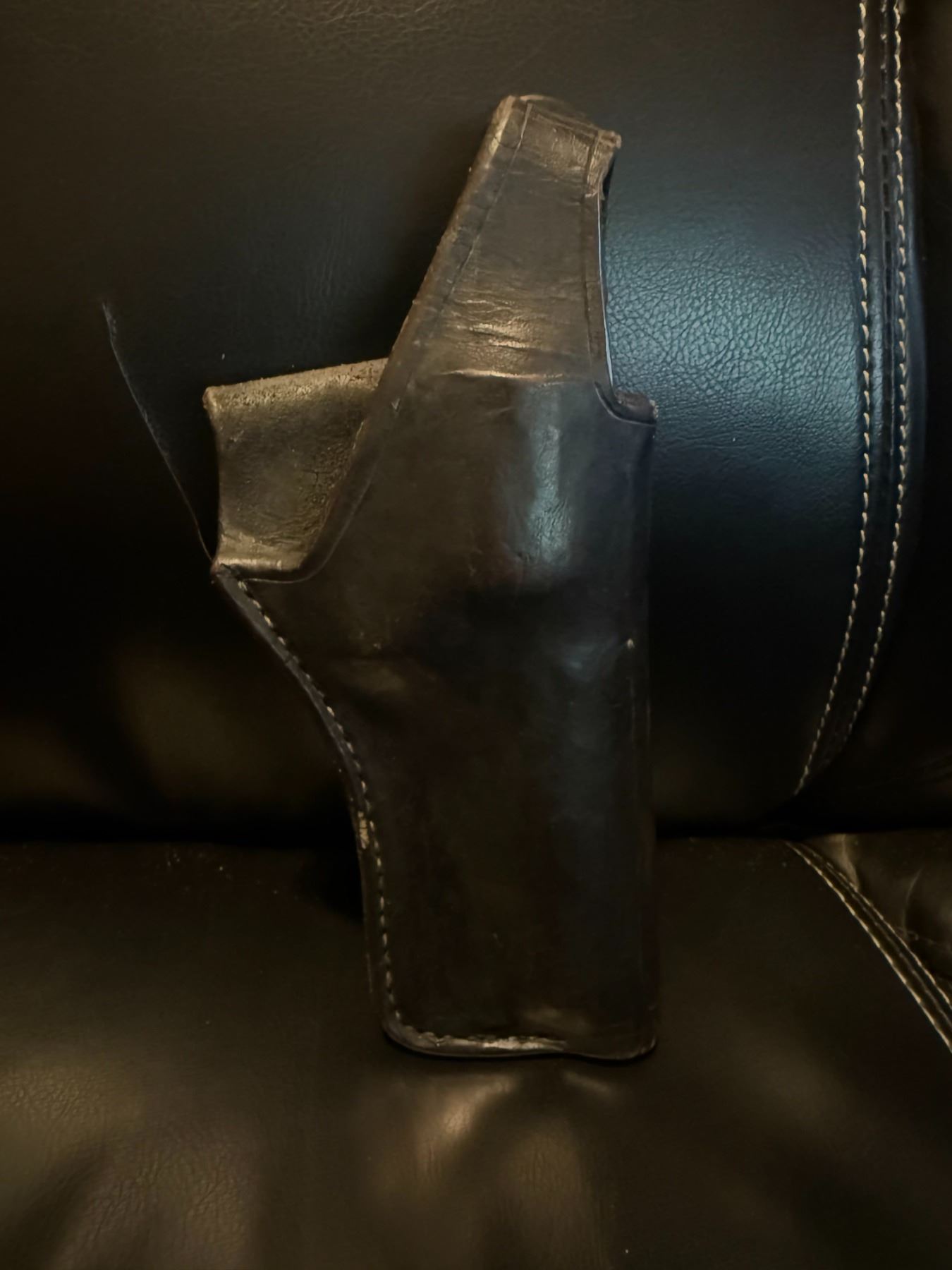 Small, classic dark leather unmarked pistol holster in good used condition. This piece features thick, durable leather construction with solid stitching throughout, offering a secure and reliable carry option for a variety of medium-frame pistols.