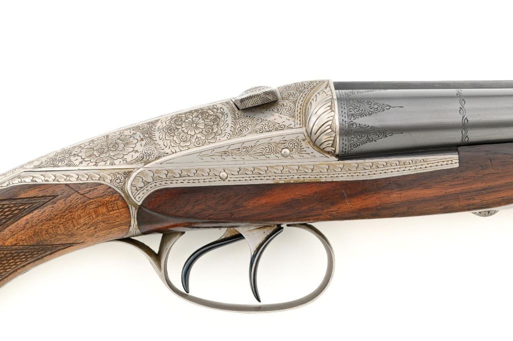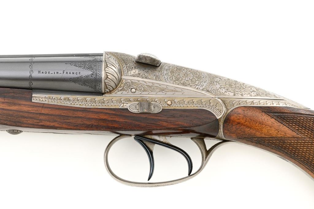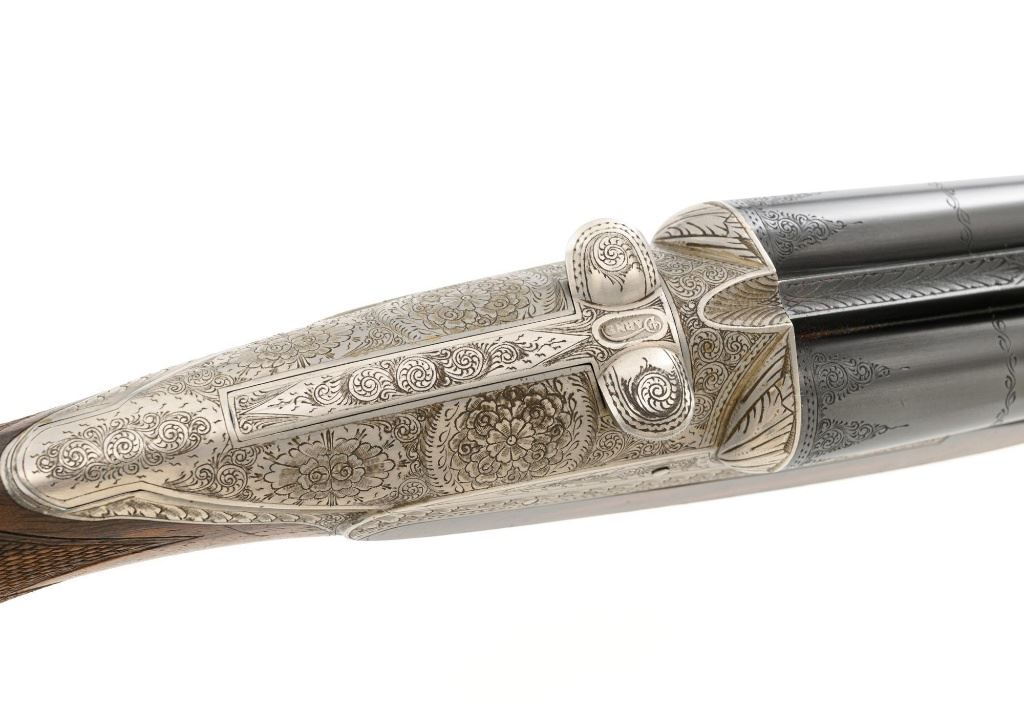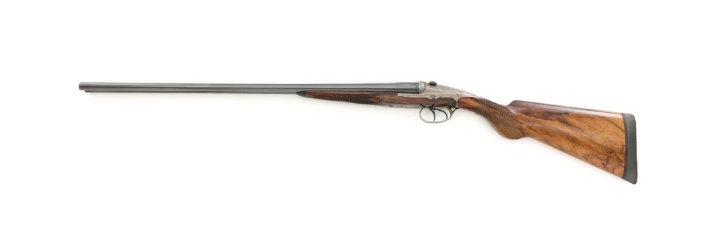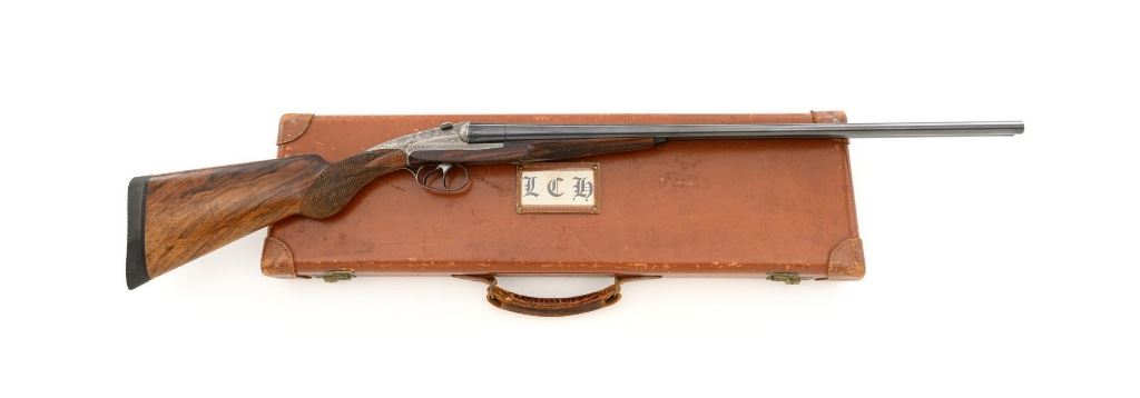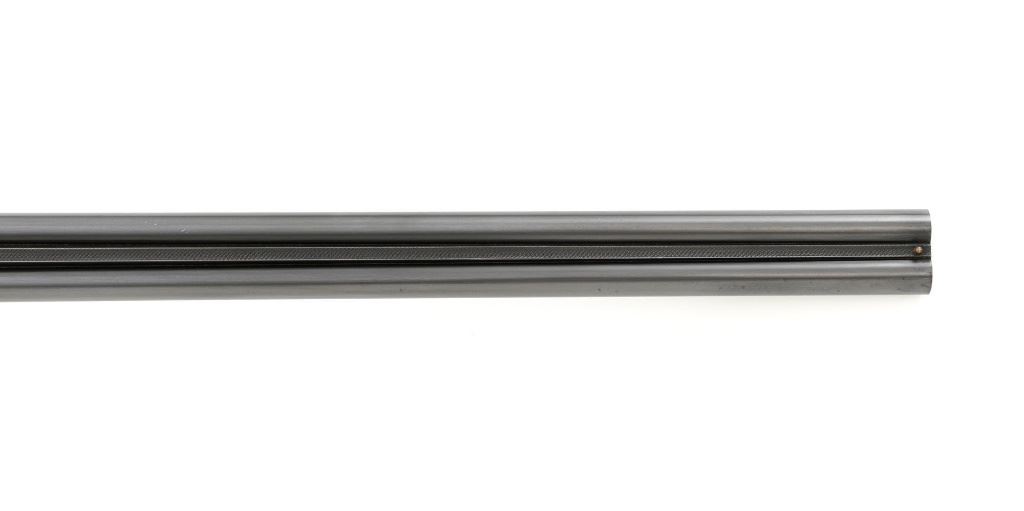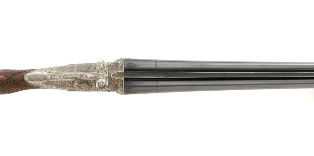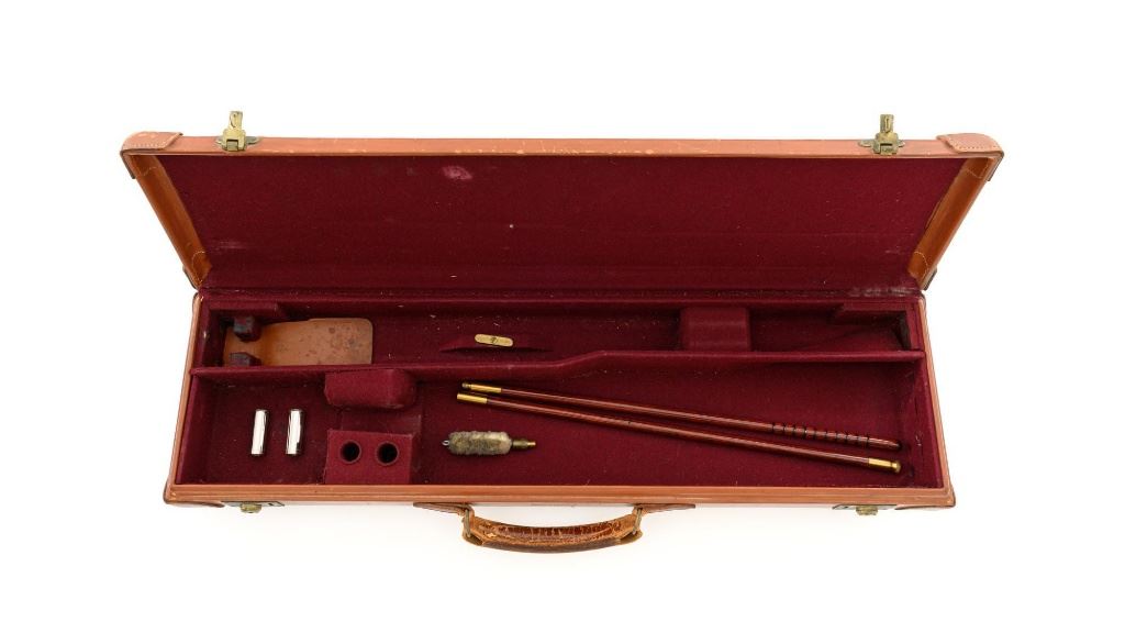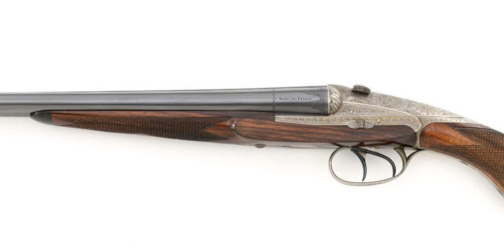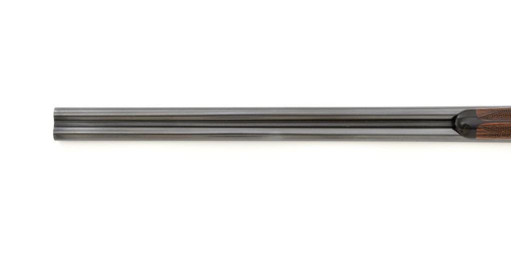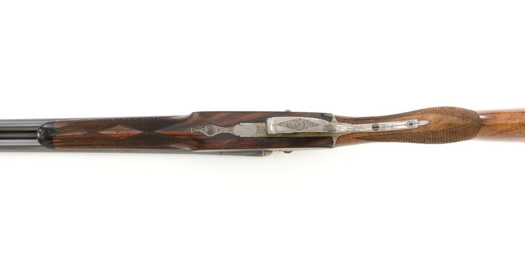 Darne Model V19 Sliding Breech Shotgun, #SP1911, 28 ga., 26-5/8" solid rib barrels have brass bead front sight, 2-3/4" chambers and are choked CYL/IC. This unique double trigger action uses a sliding breech lock-up with quick double ejection upon opening. The lower half of the coin-finished receiver is fixed, with the top half the sliding top breech. On this model, the engraving is top quality rose and scroll, with chiseled fences; safety is on the LH side. Splinter forend and round knob pistol grip buttstock are presentation grade oil-finished walnut, with ebony forend tip, thorough checkering, and a Pachmayr "Old English" pad. Mfgd in 1964 in France. All contained in an oak/leather hard case. Condition is fine overall, retaining approx. 96%-97% finish. With expected wear to action and intermittent light handling marks to the wood. Action is smooth and functions correctly. Bores are bright. Est.: $3,500-$5,000. (C&R)
