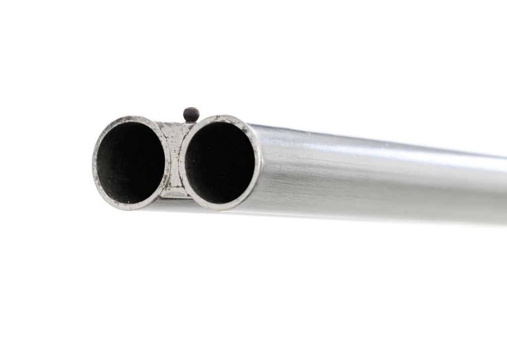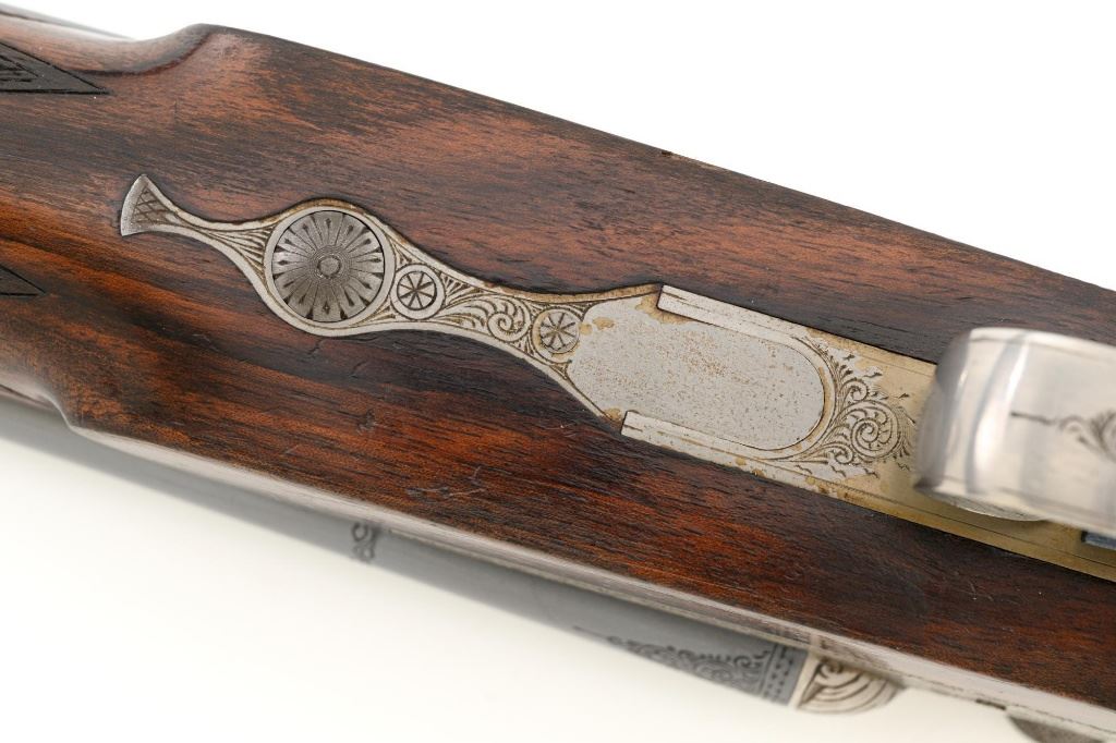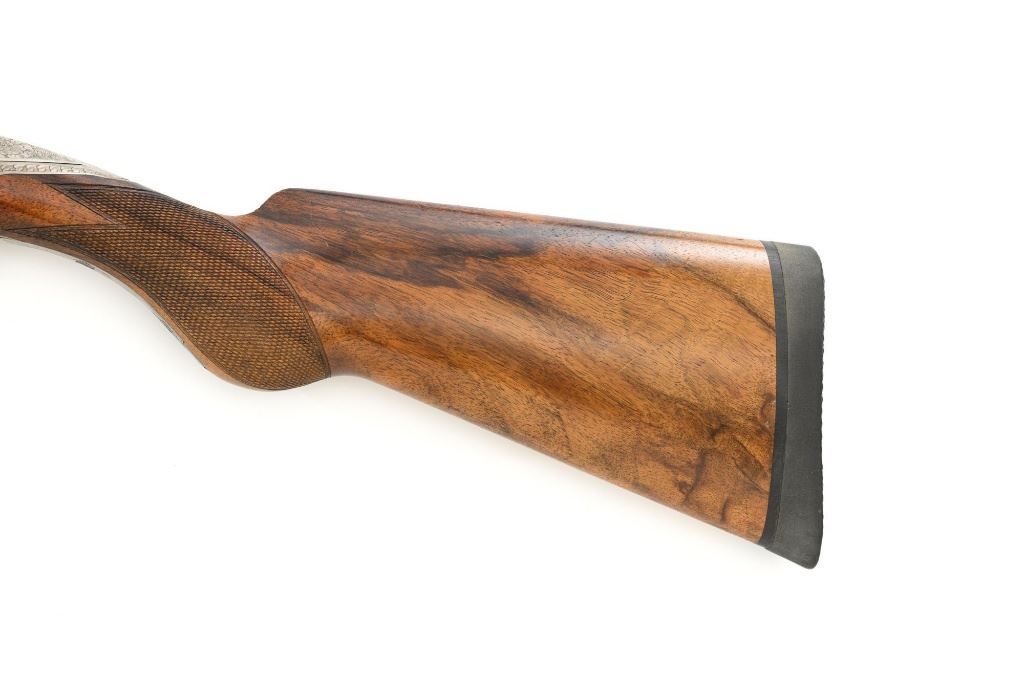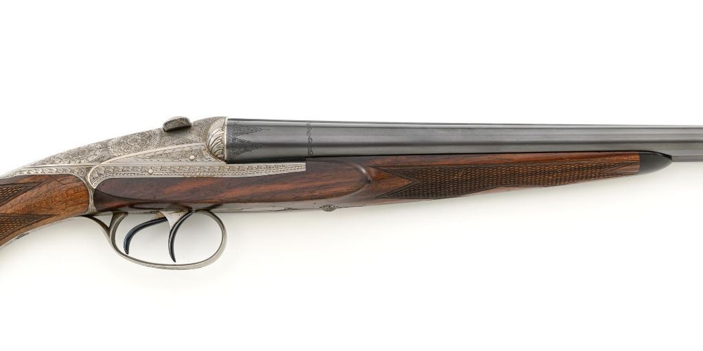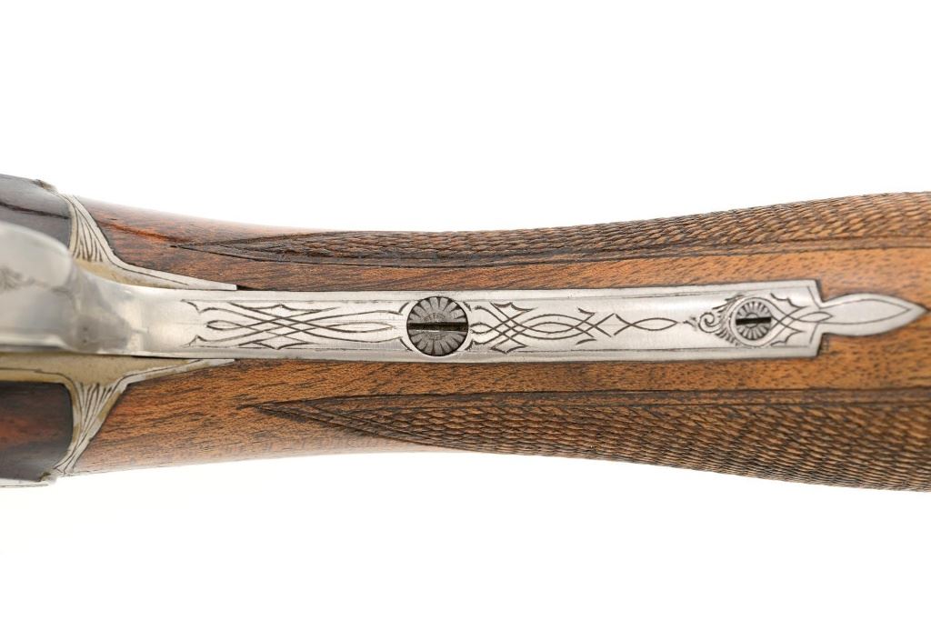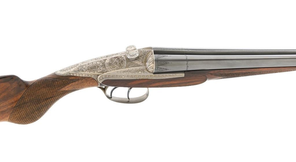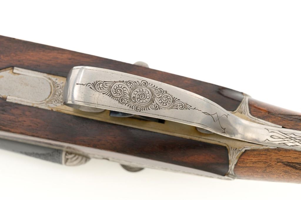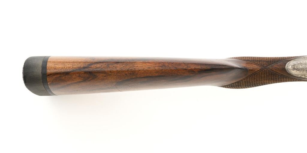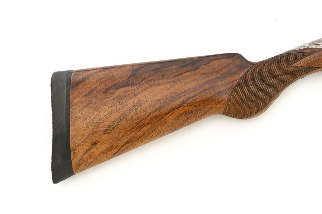 Darne Model V19 Sliding Breech Shotgun, #SP1911, 28 ga., 26-5/8" solid rib barrels have brass bead front sight, 2-3/4" chambers and are choked CYL/IC. This unique double trigger action uses a sliding breech lock-up with quick double ejection upon opening. The lower half of the coin-finished receiver is fixed, with the top half the sliding top breech. On this model, the engraving is top quality rose and scroll, with chiseled fences; safety is on the LH side. Splinter forend and round knob pistol grip buttstock are presentation grade oil-finished walnut, with ebony forend tip, thorough checkering, and a Pachmayr "Old English" pad. Mfgd in 1964 in France. All contained in an oak/leather hard case. Condition is fine overall, retaining approx. 96%-97% finish. With expected wear to action and intermittent light handling marks to the wood. Action is smooth and functions correctly. Bores are bright. Est.: $3,500-$5,000. (C&R)