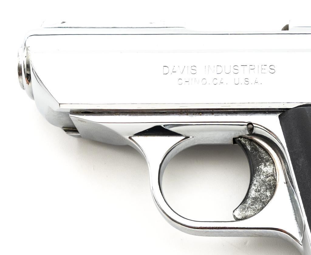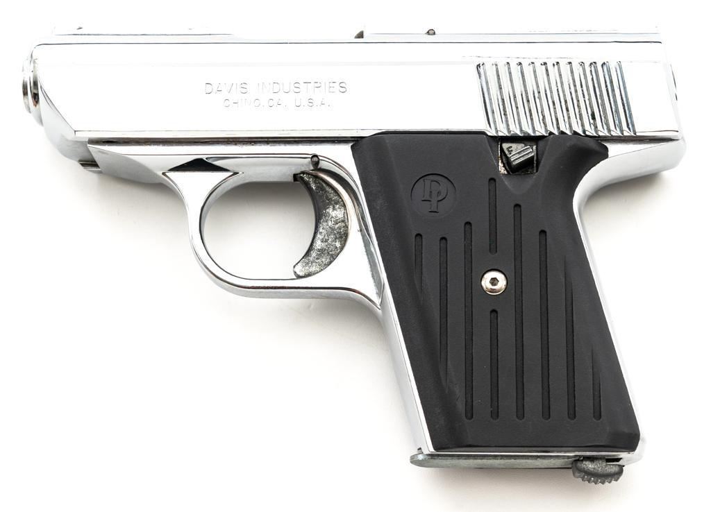 Davis Model P-380 Semi-Automatic Pistol, #AP211271, .380 ACP cal., 2.75" barrel, nickel finish, ribbed plastic two-piece "DI" monogram grips, blade front sight, fixed square-notched rear sight, with one 5-round Davis magazine. Pistol is in excellent overall condition, appearing to have been fired very little, with only very light handling marks. Action functions smoothly. Bore is bright with excellent, well-defined rifling. Est.: $100-$200. (Modern/PPT)
