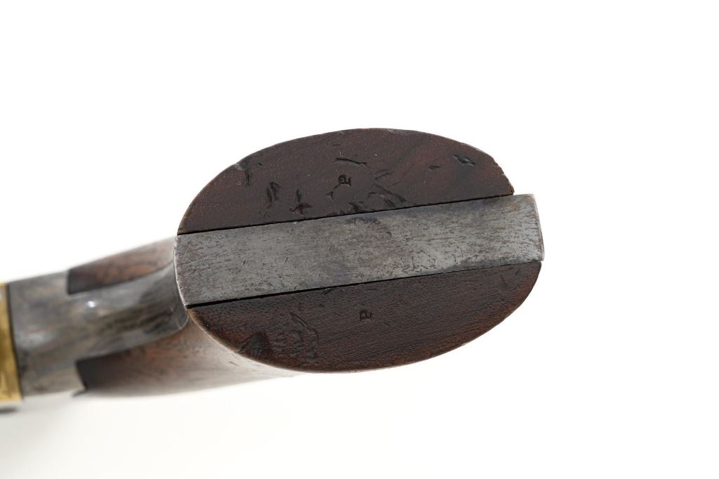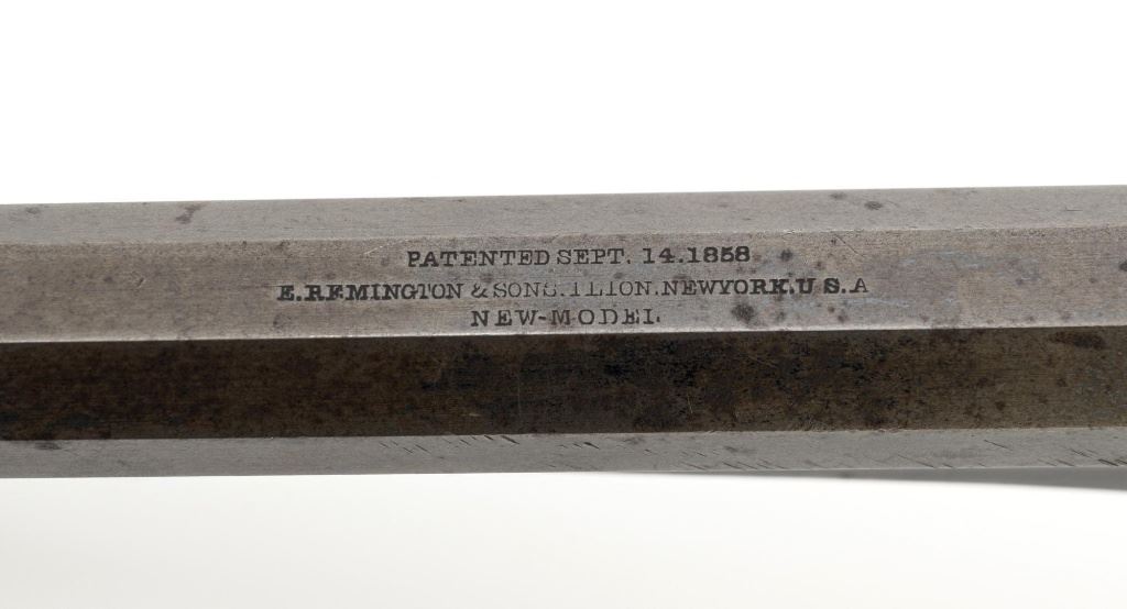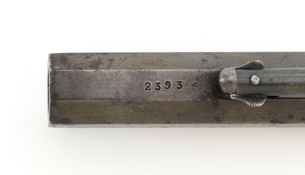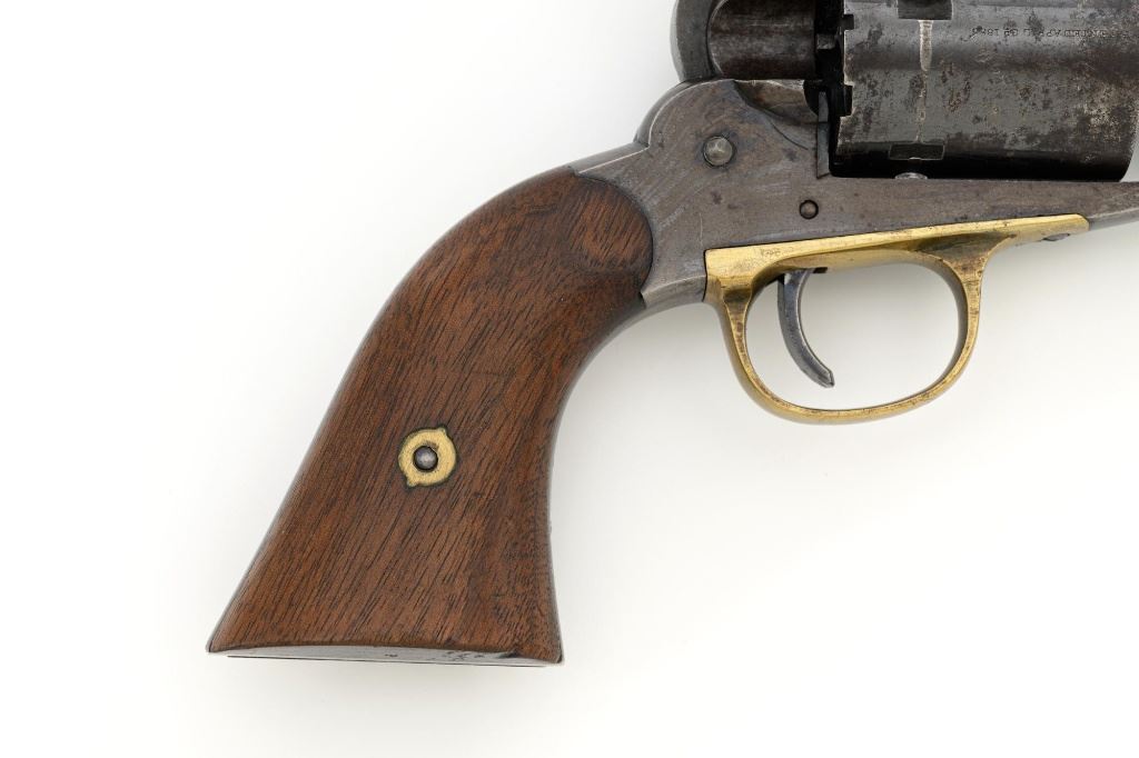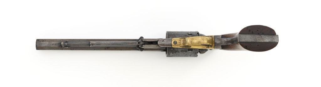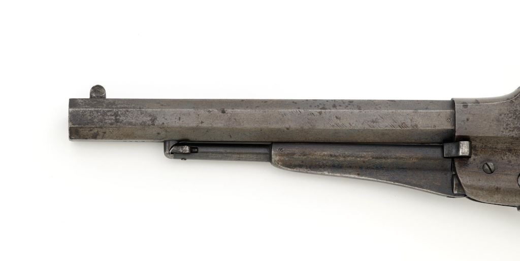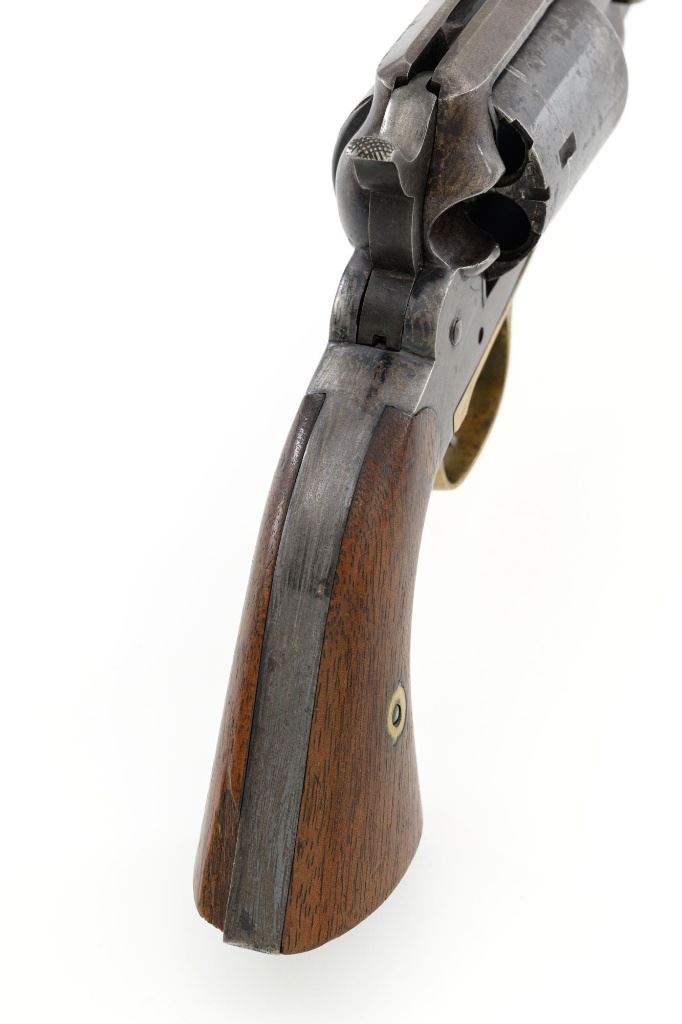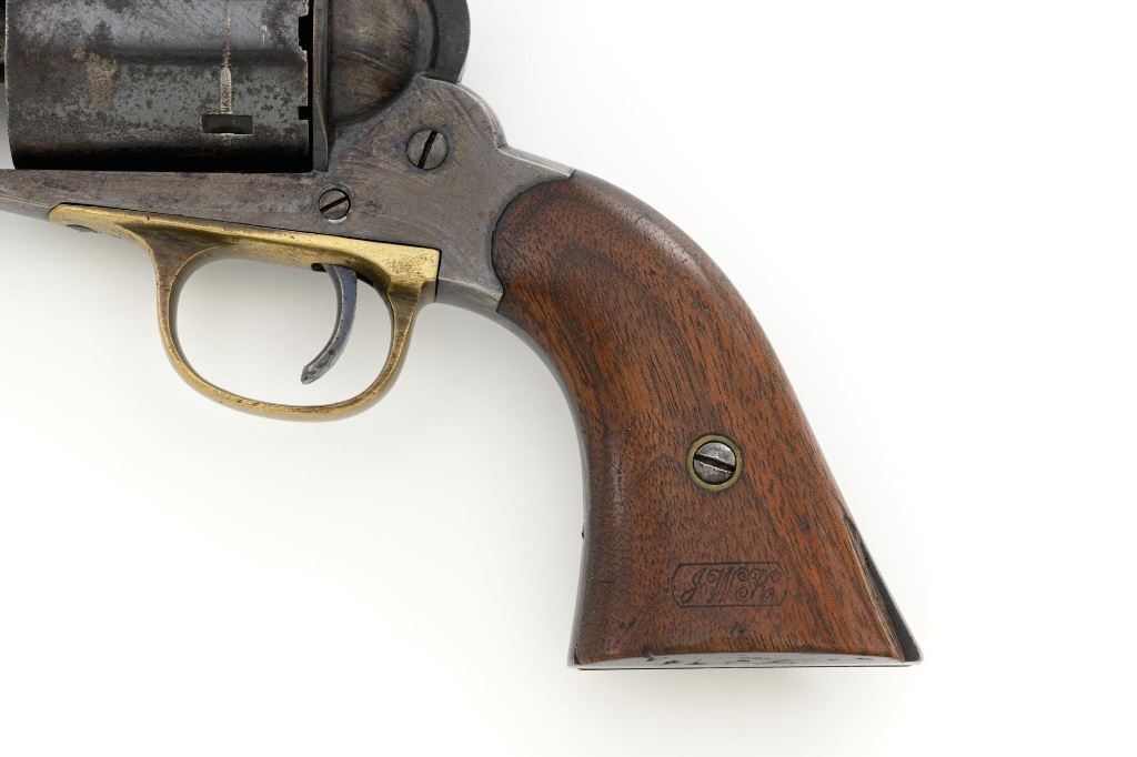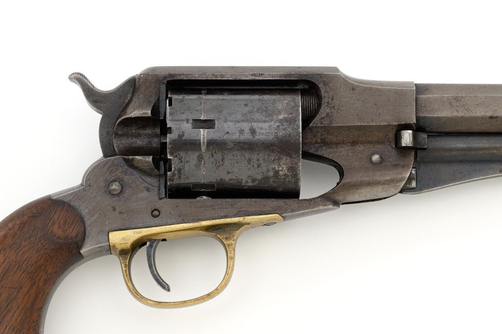 Desirable Remington New Model Army Rollin White Cartridge Conversion Single Action Revolver, #139929, 5-shot, .46 RF cal., 8" octagon barrel, no ejector rod, blue finish, brass trigger guard, smooth two-piece walnut grips, "pinched" blade front sight, and notched rear sight. Lower portion of the left grip with "JWK" inspectors cartouche (John W. Kelly). Top of the barrel is marked in three-lines "PATENTED SEPT. 14, 1858/E. REMINGTON & SONS ILION, NEW YORK, U.S.A./NEW-MODEL". Cylinder is marked with Rollin White patent marking "PATENTED APRIL 3d 1855". Matching numbers on bottom of the barrel and left side of the grip frame. Left side of the grip frame is also marked "2393", "1", and "16"; right side "2388", "1", and "T". Underside of the barrel, in front of the loading lever is marked "2393A". This revolver is in overall very good condition, displaying approx. 30%-35% blue, primarily on the cylinder and lever, balance with a smooth gray and brown patina. Factory markings are clear. Grips are near fine with a clear cartouche, typical moderate handling marks, with pleasing grain patterns, and majority of their rich oil finish remaining. Action is crisp and cycles smoothly. Bore is primarily bright, with well-defined rifling, and a little scattered mild pitting. Est.: $1,800-$2,400. (Antique) (Michael Strietbeck Collection)