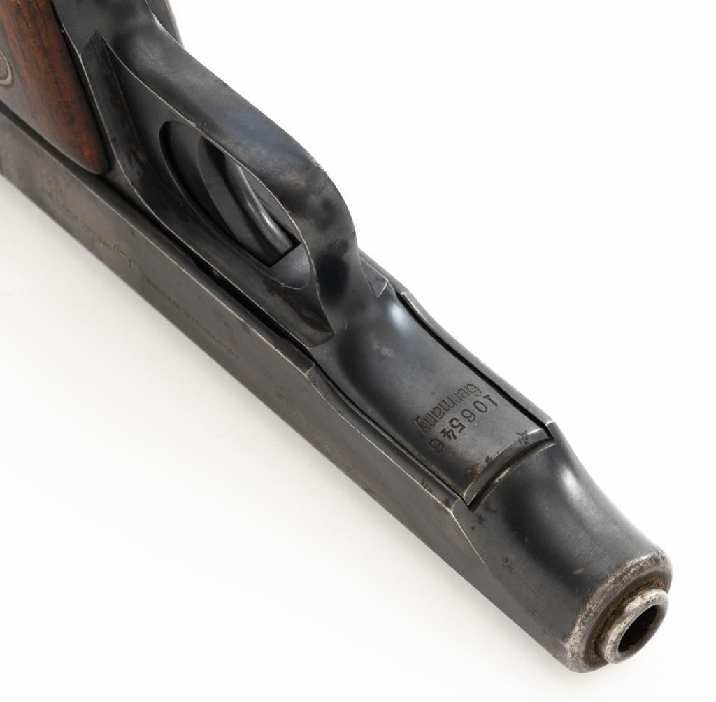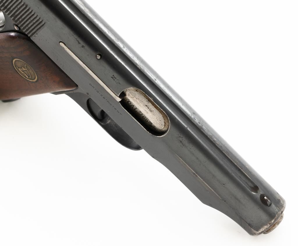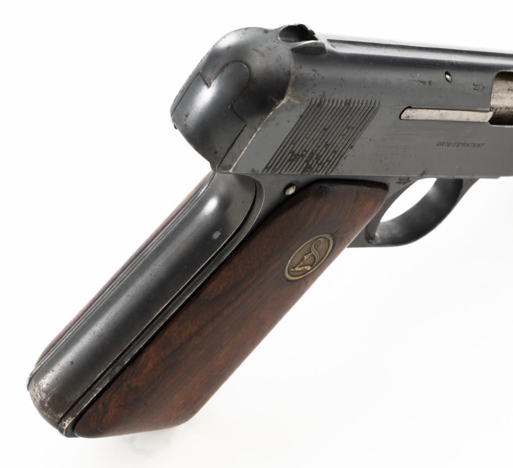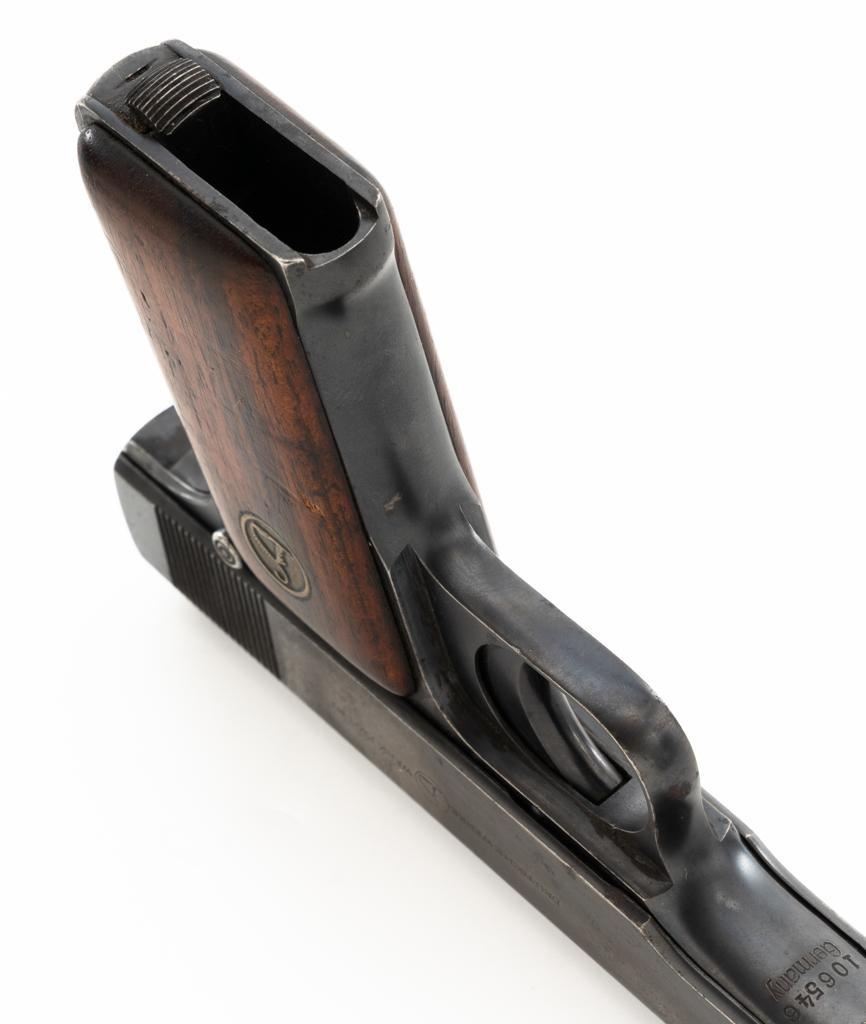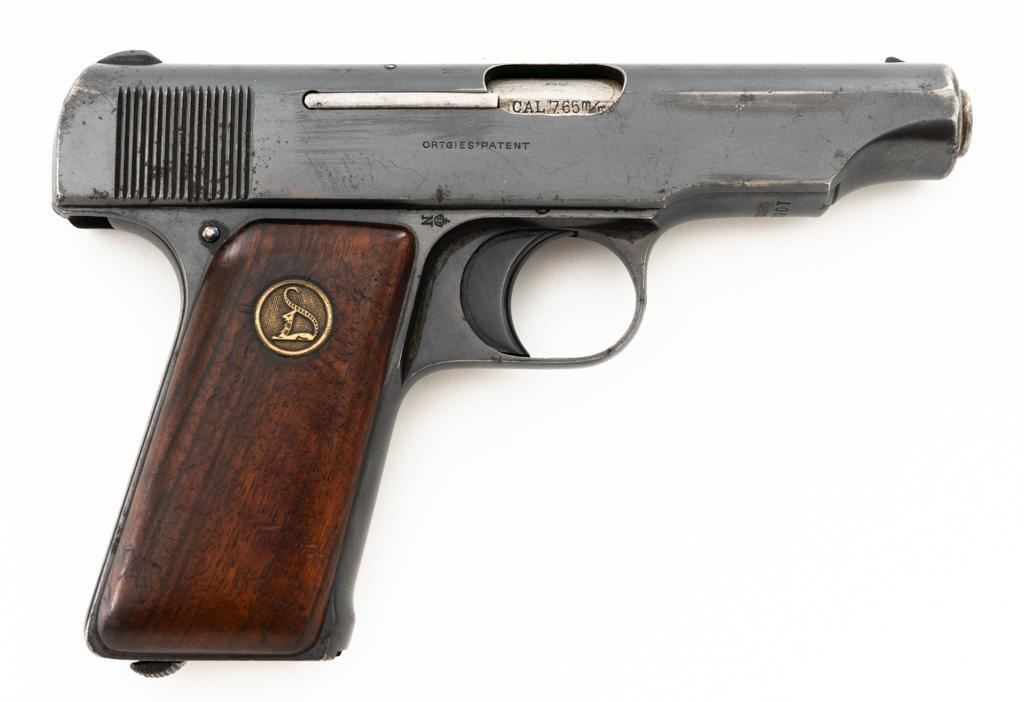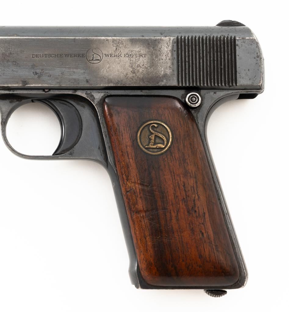 Deutsche Werke AG Pocket Automatic (Ortgies Patent) Semi-Automatic Pistol, #106546, .32 ACP cal., 3.25" barrel, blue finish, smooth hard wood two-piece "Couchant Cat" medallion grips, low-profile blade front sight, fixed "V"-notch rear sight, no magazine. Factory markings are clear, with German "(crown)/N" proof on the right side of the frame and "GERMANY" on the underside of the barrel. No visible import marks. Mfgd circa 1921-1924. Pistol is in very good overall condition, retaining approx. 80%-85% factory finish, showing areas of holster wear, and some over cleaning on the left side of the slide showing bare metal, other areas of light surface erosion and scratches from aggressive cleaning. Grips are in very good condition with indentations and smoothing, displaying sharp medallions on both panels. Action functions well. Bore is very good with well-defined rifling. Est.: $150-$250. (C&R)