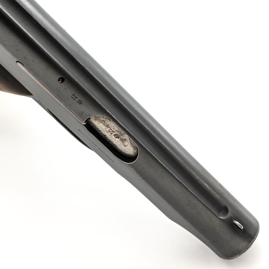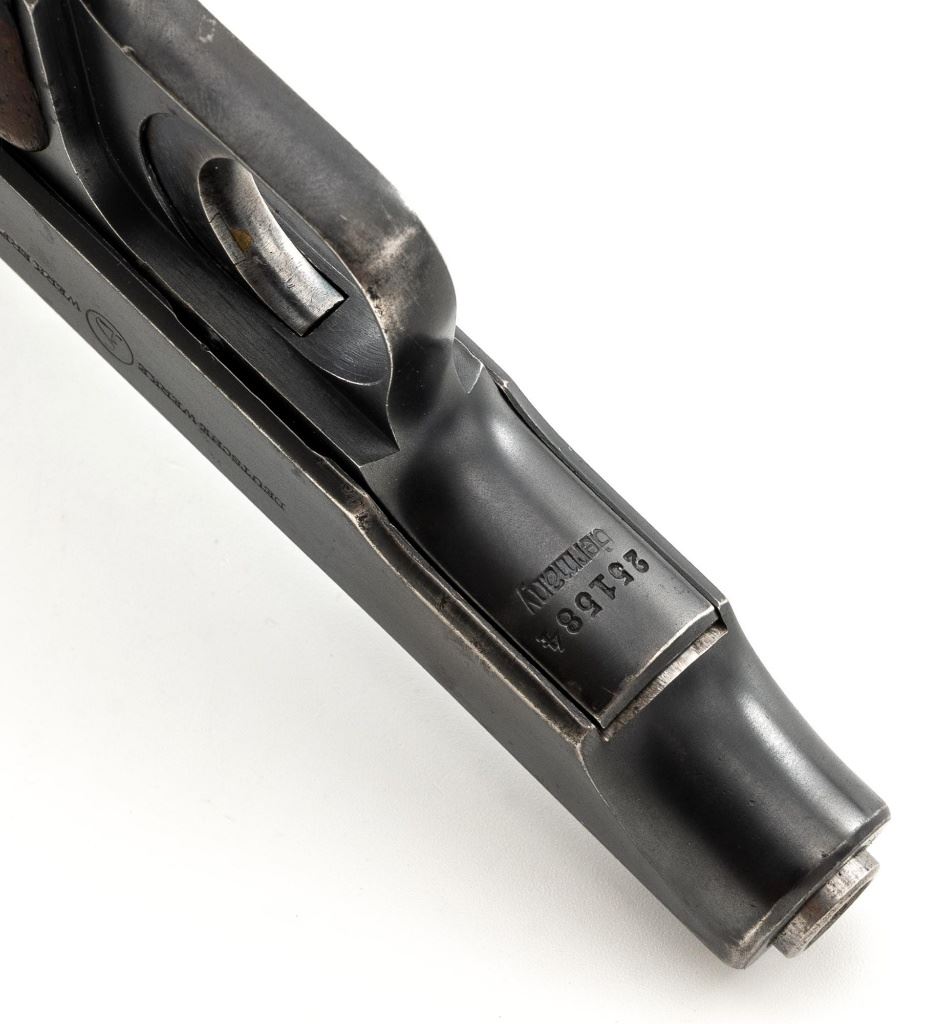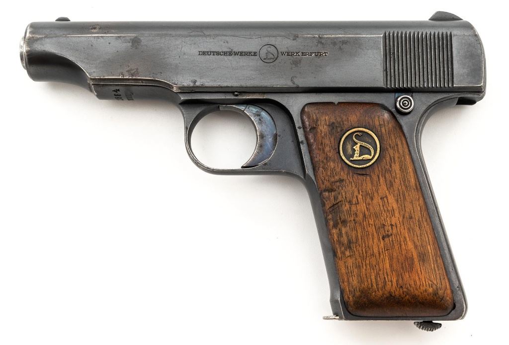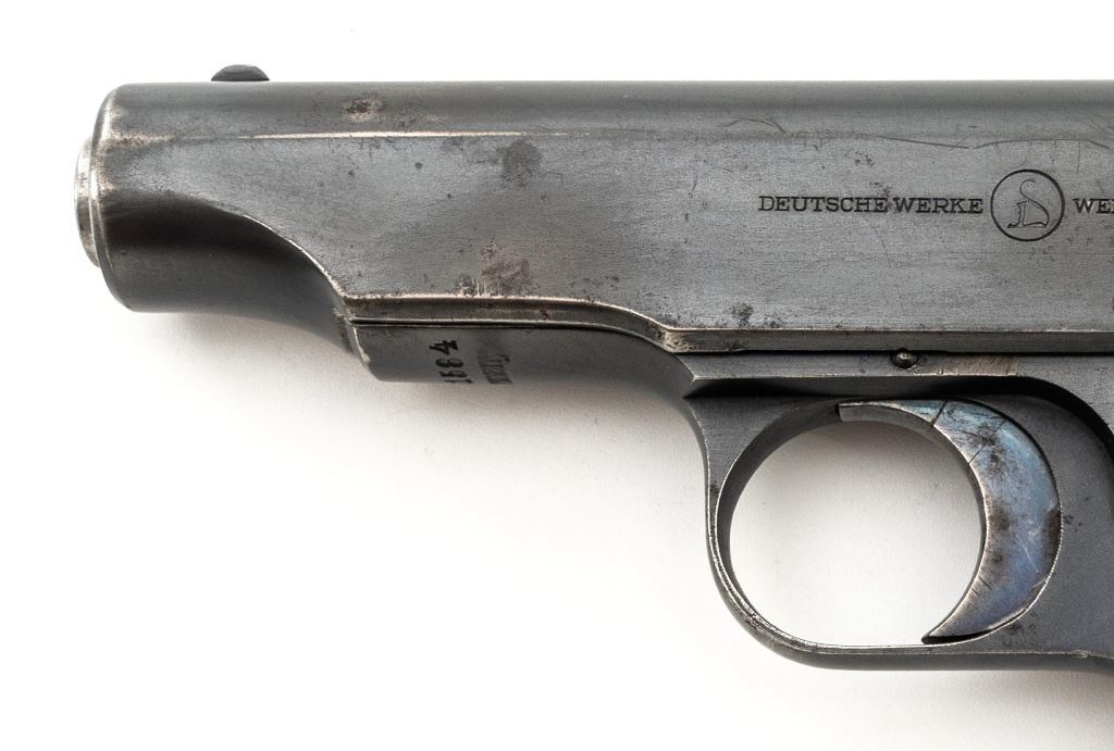 Deutsche Werke Ortgies Semi-Automatic Pistol, #251584, .32 ACP cal., 3.5" barrel, blued finish, smooth hardwood grips with round brass inserts depicting the "Crouched Cat" Deutsche Werke logo on each side, blade front sight, and fixed rear sight with "U"-notched groove. Includes one bright steel magazine with factory logo and "CAL.7,65". Left side of the slide is marked "DEUTSCHE WERKE/(logo)/WERK ERFURT" and the right side "ORTGIESPATENT". Barrel at the ejection port is stamped "CAL.7,65 mm". There are "(crown)N" stamps on the frame, slide, and barrel. Marked "GERMANY" on the frame. Condition overall is good, retaining 70%-75% blue, showing handling marks and dark toning to the slide; scattered spots of patina to the frame, slide, and trigger. Right side grip shows moderate age and handling wear, with more blemishes and a chip to the left grip. Slide operates smoothly but the pistol does not appear functional and the safety button will not engage or release. Bright bore rates very good, with clearly defined rifling. Est.: $150-$300. (C&R/PPT)