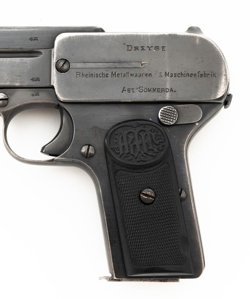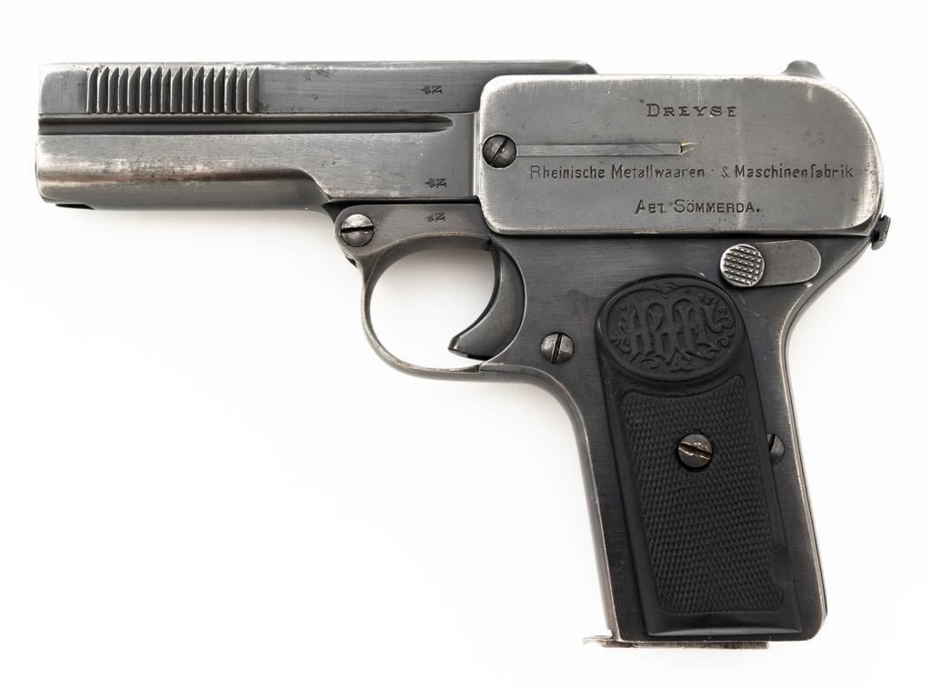 Dreyse Model 1907 Semi-Automatic Pistol, #206184, .32 ACP cal., 3.6" barrel, blued finish, checkered black plastic grips embossed with "RMF" logos on both sides, low profile inverted-"V" front sight, and fixed rear sight with "V"-notched groove. Includes one magazine, marked with an "E" on the floorplate extension. Most of the finish has worn off of the magazine and there is a small dent to left side of the body. Pistol is marked on left side of the frame "DREYSE/Rheinische Metallwaaren & Maschinenfabrik/ABT.SOMMERDA". There are "(crown)N" proof marks on left side of the barrel, slide, and frame. No visible import marks. Condition overall is very good, retaining approx. 80%-85% blue, with wear and spots of patina to the muzzle, slide, and frame. Grips show age and handling wear, with a chip missing from the left side. Action operates smoothly. Bore is bright with very good+ rifling. Est.: $300-$500. (C&R/PPT)