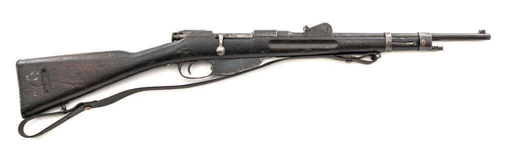 Dutch Royal Netherlands East Indies Military Constabulary M95 Mannlicher Bolt Action Carbine, #909F, 6.5x53Rmm cal.,17.5" barrel, blued finish, hardwood stock, front sight base present but the blade is missing, with an adjustable quadrant rear sight with "V"-notched groove, graduated to 1100 meters. Includes a black leather sling, in fair condition, showing age and wear. Left side of the receiver is marked "STEYR 1898". Likely arsenal reconditioned while in service and the top of the barrel shank is stamped "1956/(crown)E/090F/E". Numbers do not match. Condition overall is fair; metal shows wear general browning and areas of fine pitting. Bolt handle shows evidence of grinding. Safety lever with has several impressions along the edges. Wood with glue repaired cracks to the stock wrist behind the receiver tang and a putty repair to left side of the forend. There are also bruises and handling marks to the very dark finish. Action operates smoothly. Bore is dark and in poor condition, rifling is barely visible. Est.: $150-$300. (Antique)