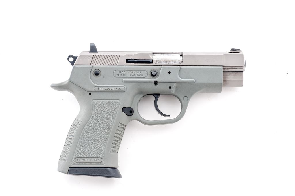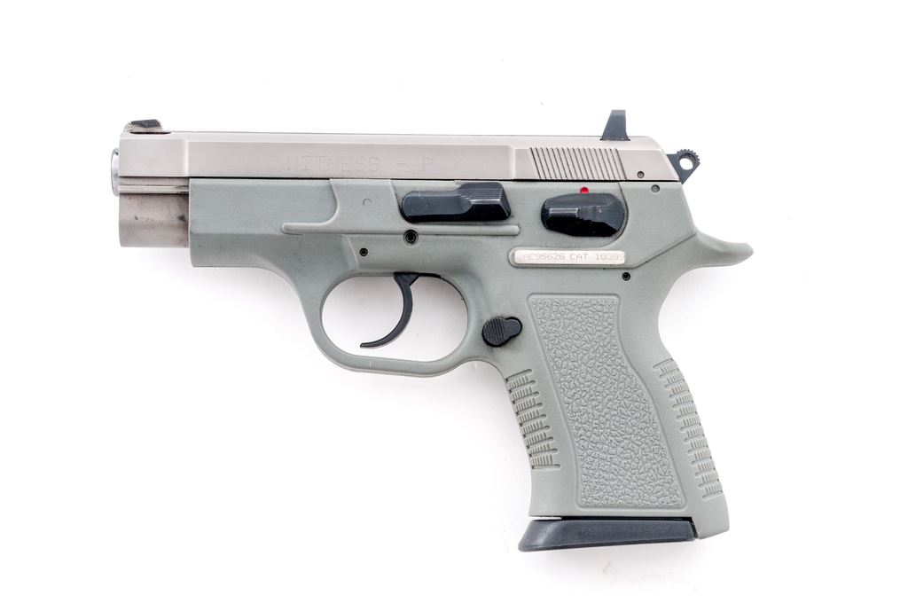 EAA Witness-P Semi-Automatic Pistol, #AE95626, .45 ACP cal., 3-5/8'' ported barrel, matte stainless ported slide, light gray polymer frame, blade front and square-notched fixed sights, with one original Tanfoglio magazine. Pistol is in very good+ used condition. Slide with some minor handling marks, ports and sides of the front sight with light powder burn marks. Polymer frame is excellent. Smooth action, very good bore. Est.: $300-$500. (Modern/PPT)