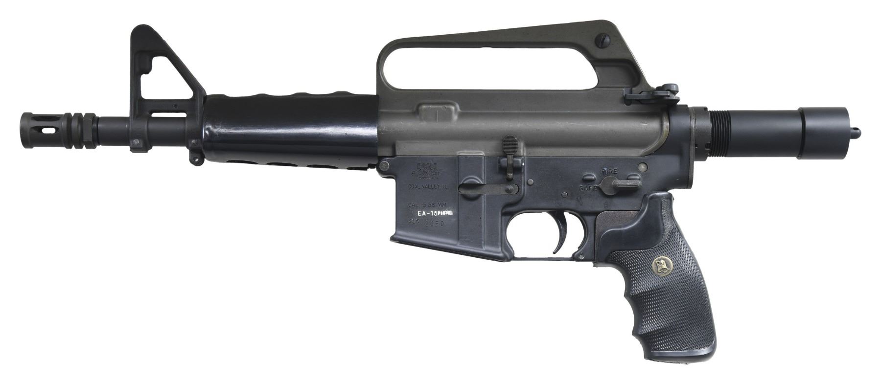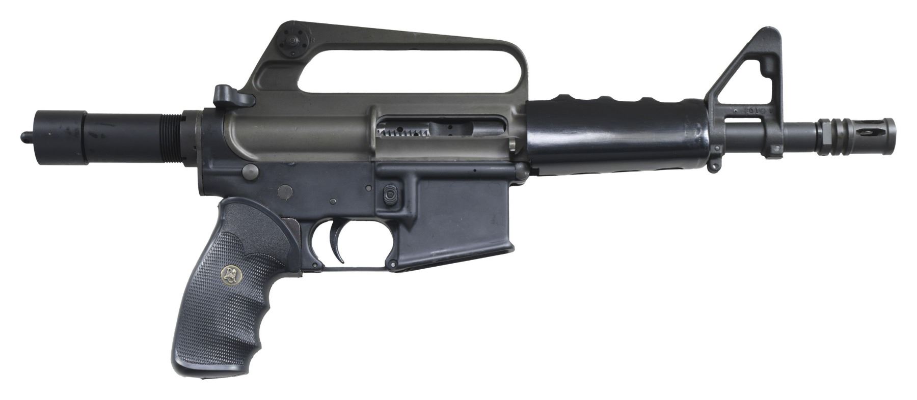 Cal. 5.56mm. S# 2450. Bbl. 7.5". A pistol version of the famous black rifle. A2 style aftermarket flash hider. Protected post front sight / gas block w/ shaved bayonet lug. Custom 4.25" triangular beavertail handguards. Carry handle upper receiver w/ no brass deflector or forward assist. Windage adjustable, dual aperture rear peep sight. Left side safety / selector. Pachmayr pistol grip. M16 profile bolt carrier. Kentri style short buffer system. Dust cover absent. Front of mag-well marked: "NMSAMA / SAUGUS MA". CONDITION: Light gray finish on upper receiver & dark black finish on lower receiver. Finish quite complete w/ typical drag lines & thin spots on high spots and in areas of mechanical intervention. Bright bore w/ visible rifling. Fire control mechanism appears to function correctly when cycled by hand. (25-2937/JZ). MODERN. $300-500.