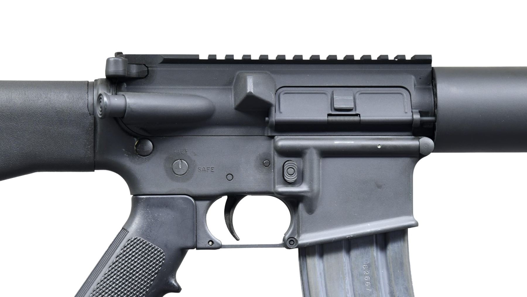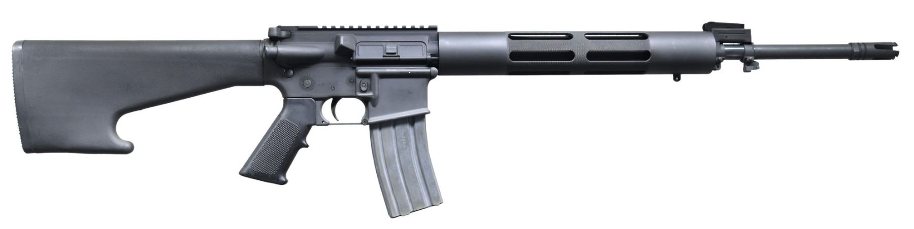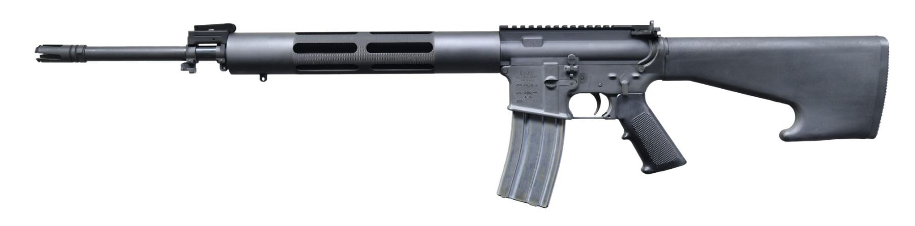 Cal. 5.56MM NATO. S# 14657. Bbl. 20" (heavy profile under handguard) marked "SUM 5.56" (Stainless Ultra Match by Olympic Arms) just forward of gas block. Pre ban model with 1/2"-28 threaded muzzle having 4 prong flash hider. Mfg. 1990-1993 in Coal Valley, IL as desirable pre-ban (1994) model having pin retained gas block with flip up sight and bayonet lug. Ventilated knurled matte black round aluminum handguard with sling stud. Standard EA-15 features of shell deflector, forward assist, fence around magazine release, flat top Picatinny rail upper receiver (no rear sight or carry handle), A2 grip, single stage trigger, Badger Tactical charging handle and fixed buttstock with grasping hook at toe as used for stability on some full auto rifles. MAGS: 1 good Colt 30 rd. CONDITION: occasional very faint use mark such as by magazine well; all other aspects near excellent including bore. (25-2322/NW). MODERN. $600-850.